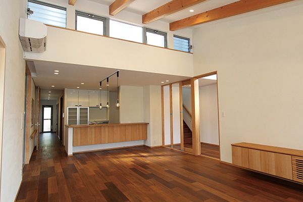 外観と1階は和の雰囲気を取り入れたモダンなデザイン。高い位置に設けた窓から取り込む光で明るいLDKです。