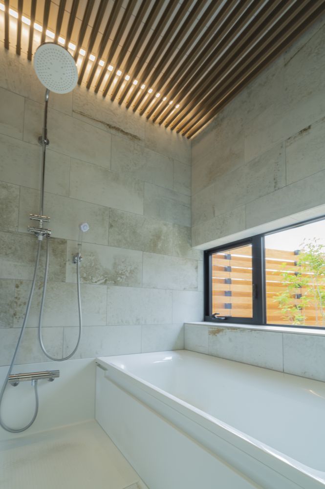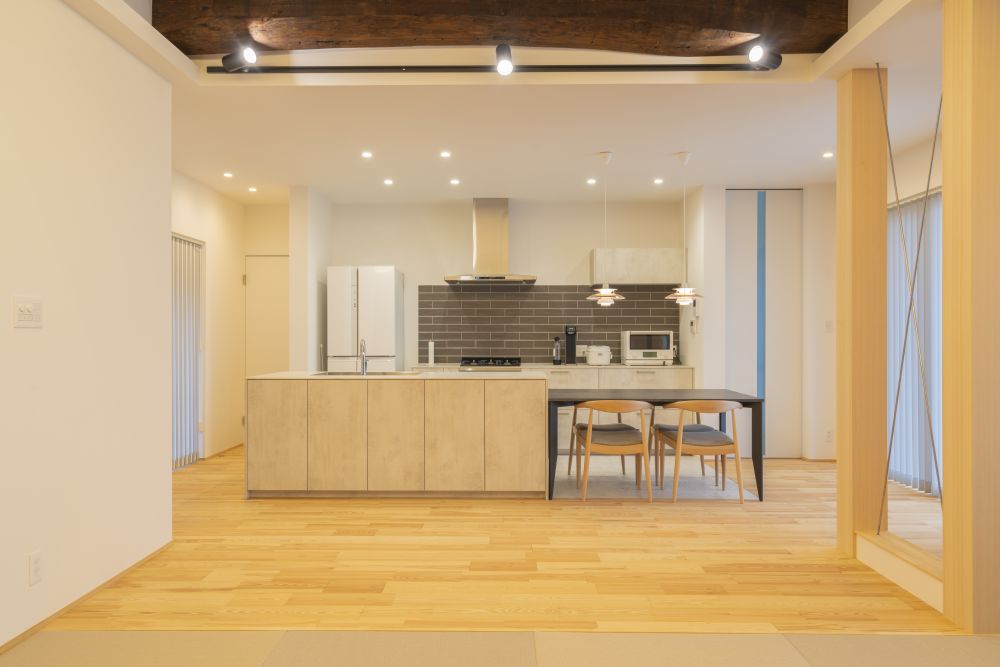 立派な梁が見えるLDKや天井に格子が施された浴室など、どの空間も和の要素を融合させてスタイリッシュに仕上げている。そのデザインは、ご夫妻の要望「ホテルライク」を具現化したもの。イメージを形にしていく上で、ひのまる工務店が大事にしたのは、素材を丁寧に選び、手間を惜しまずにつくり込むことだという。若い感性としっかりとした技術のリノベーションにより、新築では得られない豊かさを持つ家が完成。それは、ホテルステイの非日常感を溶け込ませた暮らしの場である。