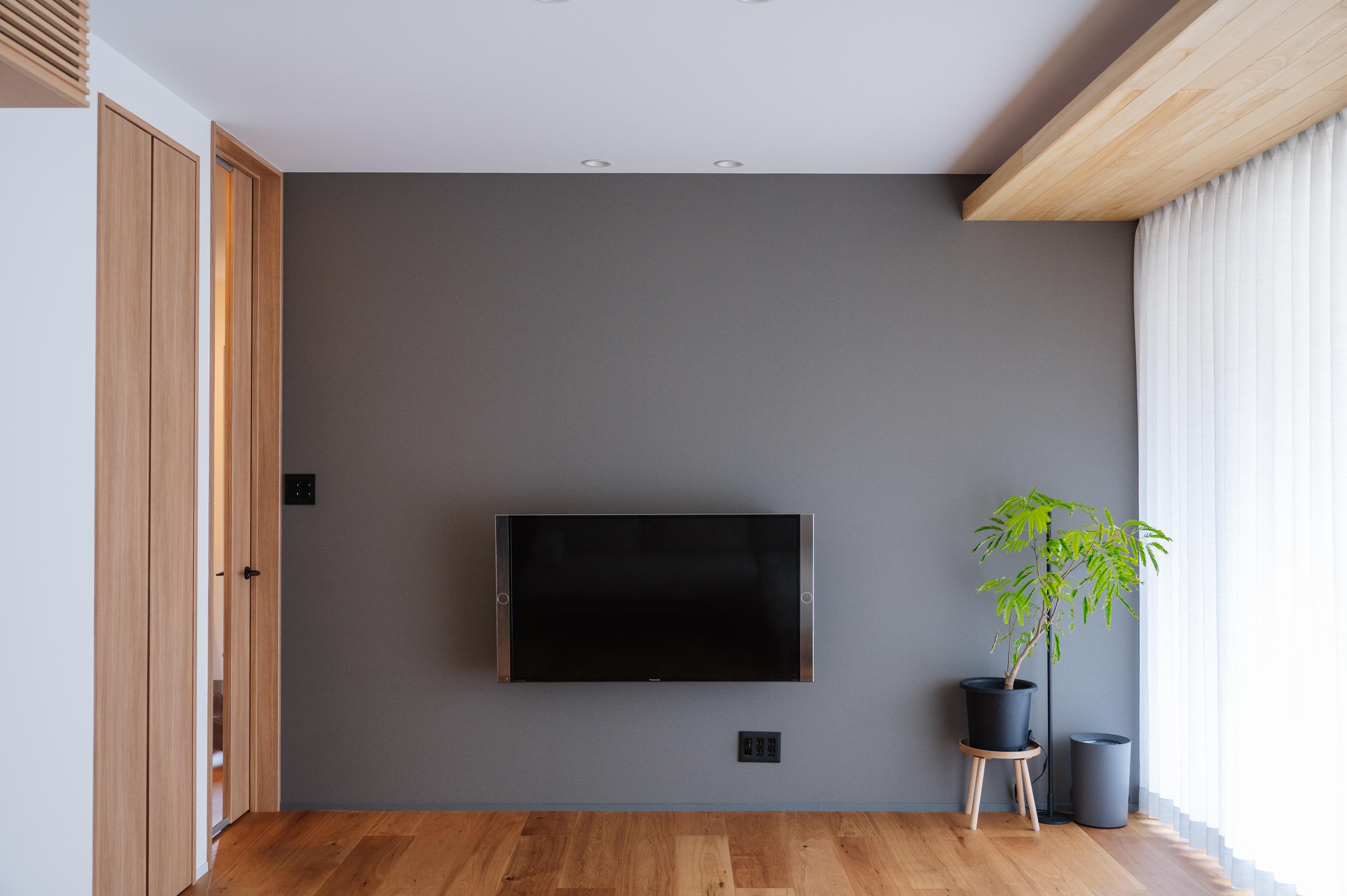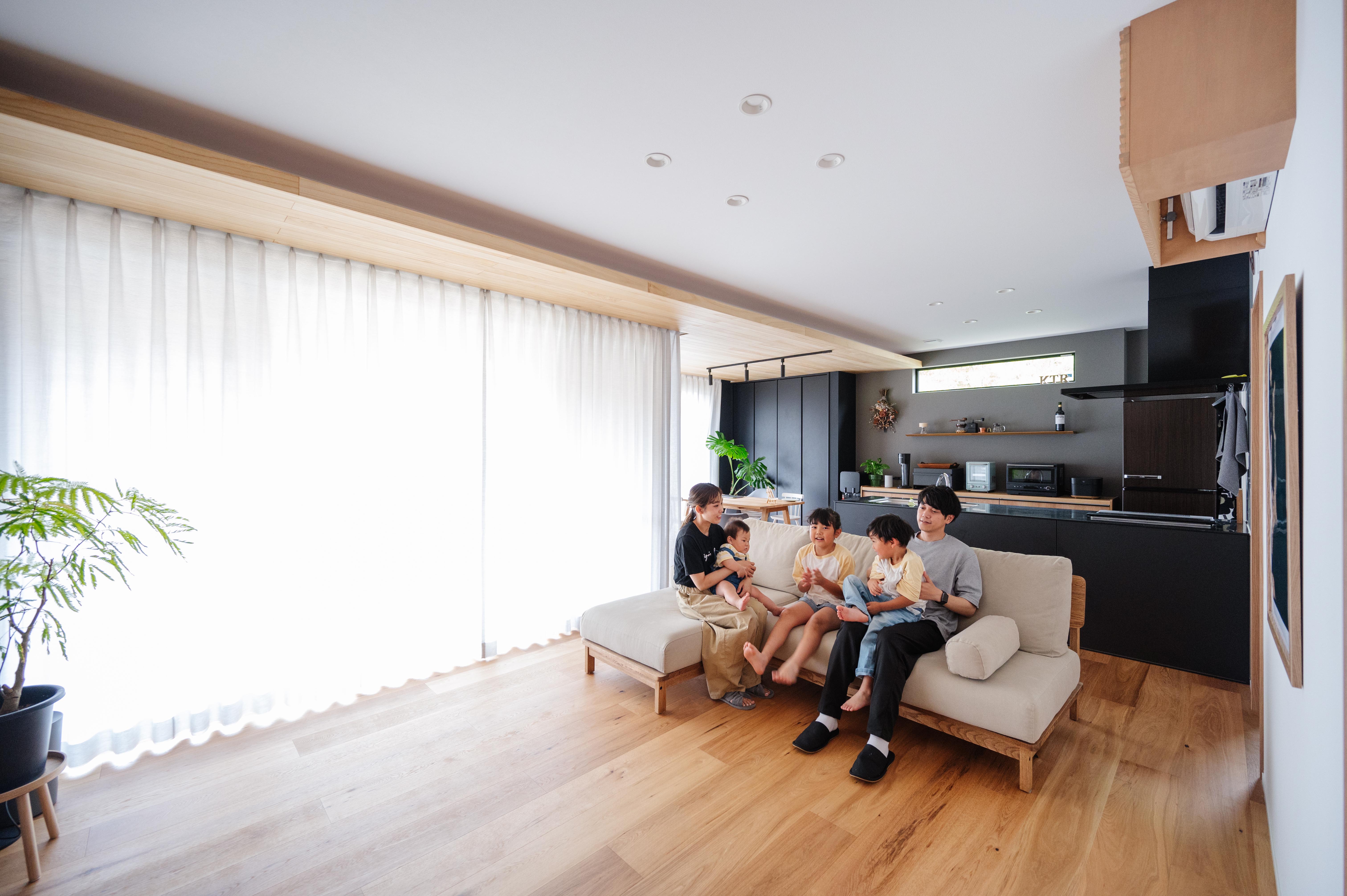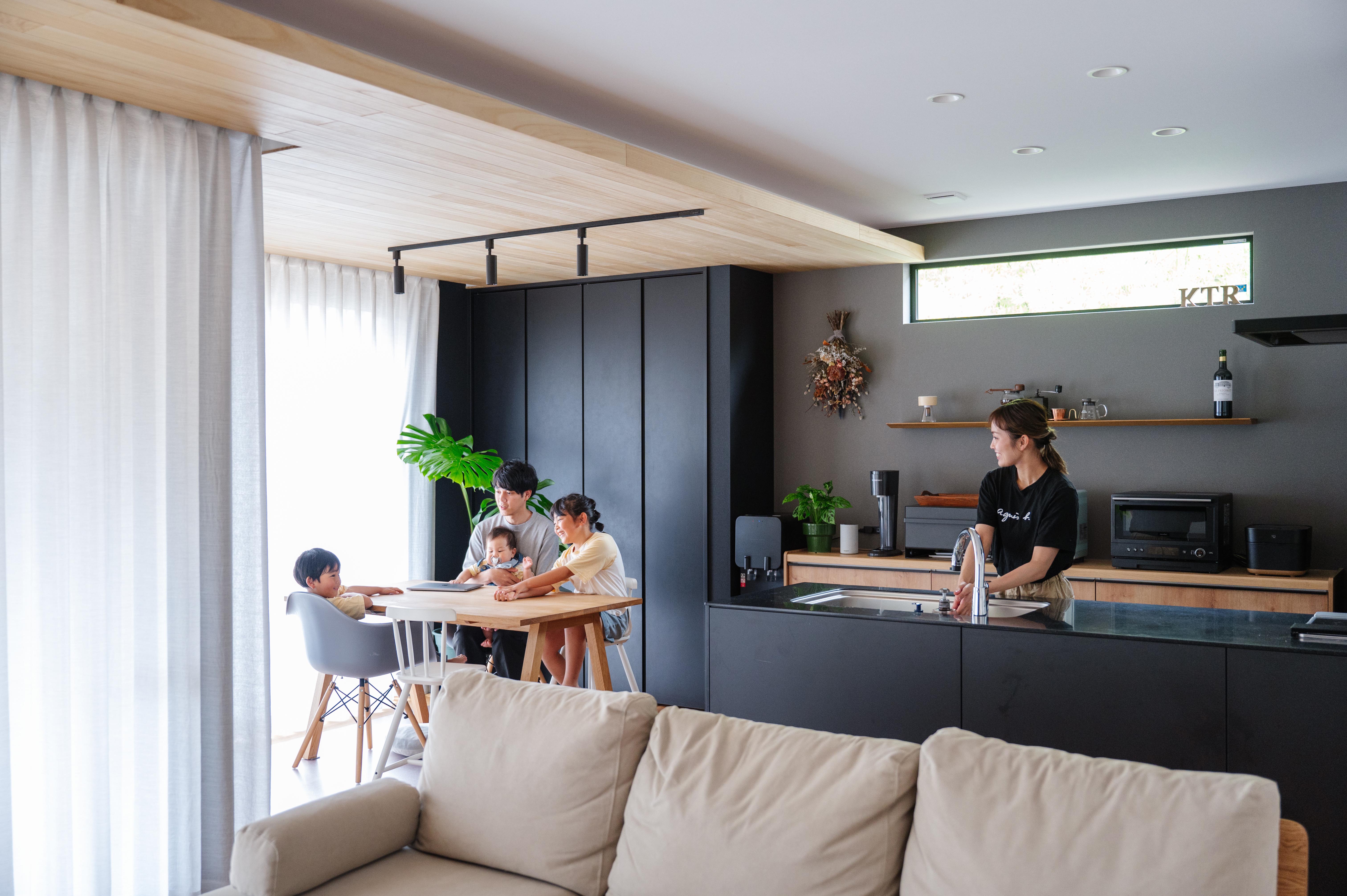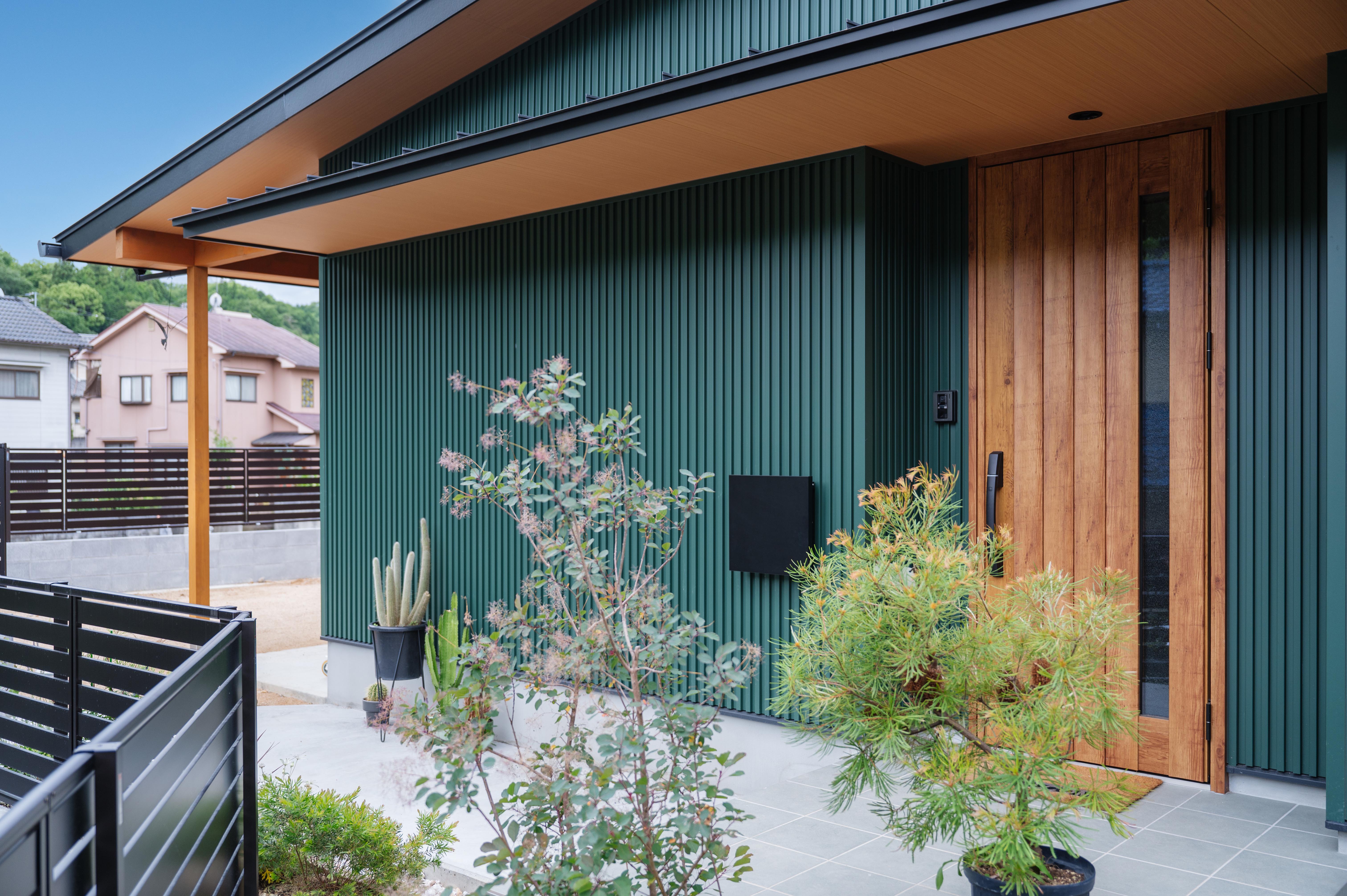 住宅街に現れるモスグリーンのスタイリッシュな外観。道路より高い敷地のため、視線が抜け、なんとも言えない極上の開放感を味わえる。この豊かな自然に囲まれた環境に一目惚れしたご夫妻。リノベーション、新築と2つの案があったが、間取りやライフスタイル、性能面などを加味して新築で夢の家づくりが始まった。希望したのは、自然を活かして伸び伸びと子育てができる平屋。周囲の自然を取り込むように庭とLDKがつながり、室内外の一体感を楽しめる。また軒を深く出したことによって天候に左右されず、外遊びや食事と多目的に使える、大人も子どもたちもお気に入りの場所となった。