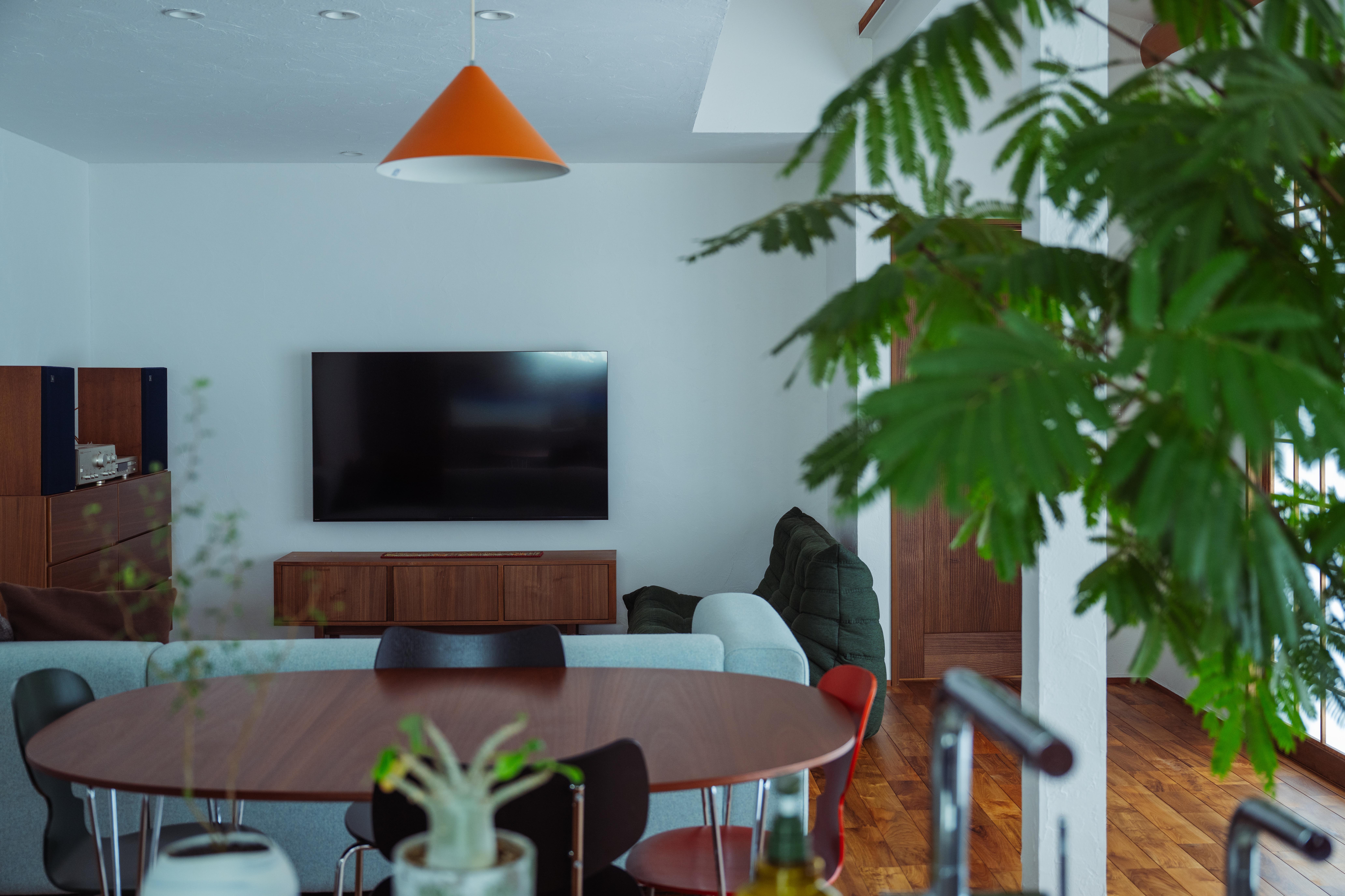 もともと和室だった二間をひと続きのLDKに改装。建具を撤去し、縁側だったスペースも取り込むことで、光と風が奥まで心地よく注ぐ。かつての台所はお祖母さまが引き続き活用。ご夫妻の寝室も1階に配置し、隣の4.5畳の和室をウォークインクローゼットに変更。洋服や古着コレクションも余裕をもって収まる設計だ。外観は既存のたたずまいを踏襲しつつリフレッシュ。庭には芝生を敷いたドッグランに家庭菜園も併設するなど、それぞれが心地よく暮らしを謳歌できる空間づくりを意識した。