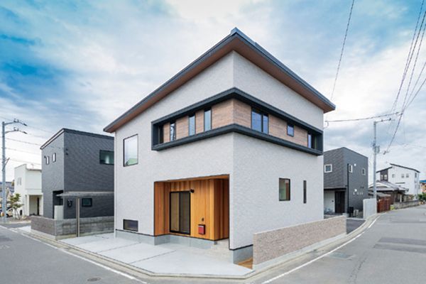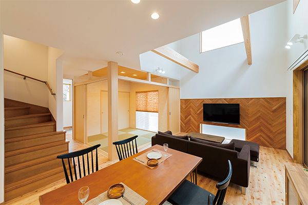 白壁にレッドシダー貼りの外観が印象的なAさま邸。「木のぬくもりを感じる明るい空間」をテーマに、立派な梁や柱が支える吹き抜けリビングの住空間が完成。便利な家事動線やIoTを導入することで暮らしやすさも格別です。