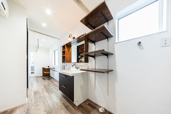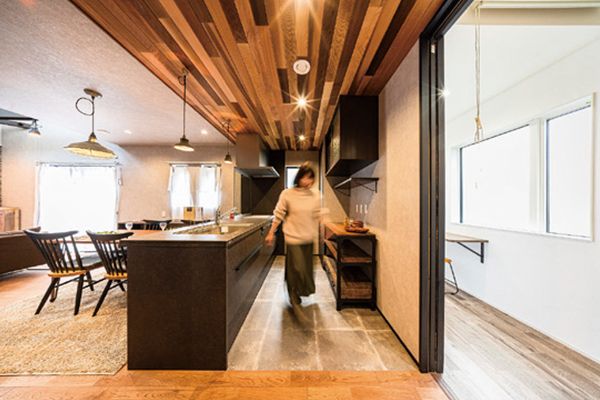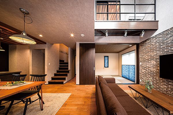 アイアンやレンガ、打ち放しを模した壁など、インダストリアルな男前デザインの空間は、昼間は吹き抜けからの光で明るく、夜は照明による大人なムードを演出。回遊動線や家事室を確保して、これからの快適な暮らしを描きます。