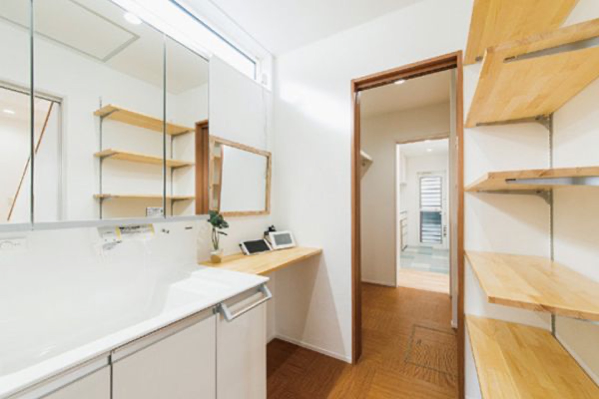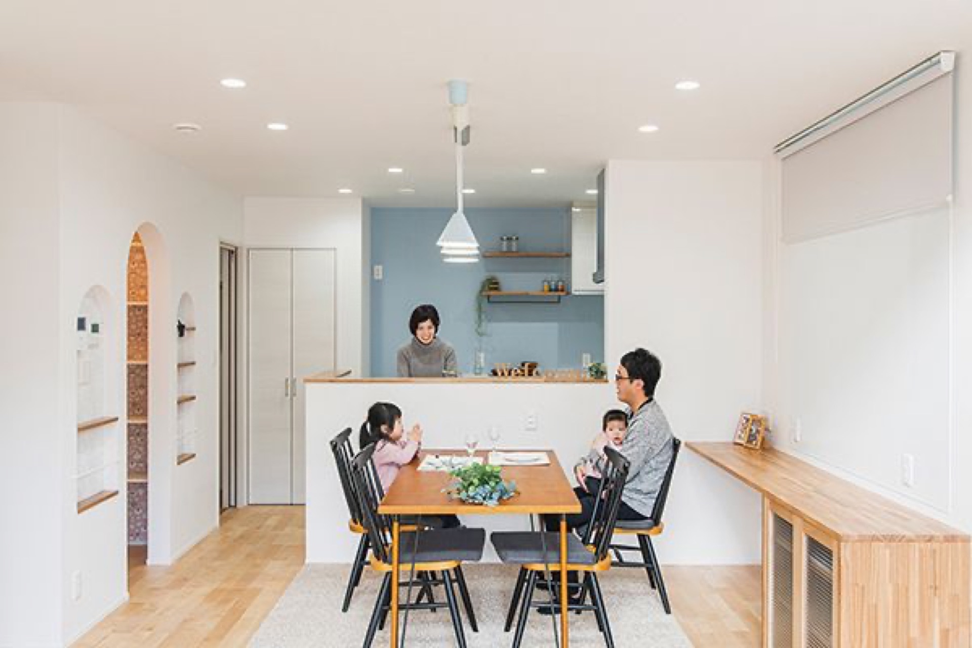 自然の力を取り込むパッシブデザインと高い住宅性能、さらに災害時のライフラインを保つシステムを導入した次世代ZEH+のFさま邸。リビングと階段の吹き抜けで邸内全体が明るく、一直線の家事動線も暮らしやすさ抜群です。