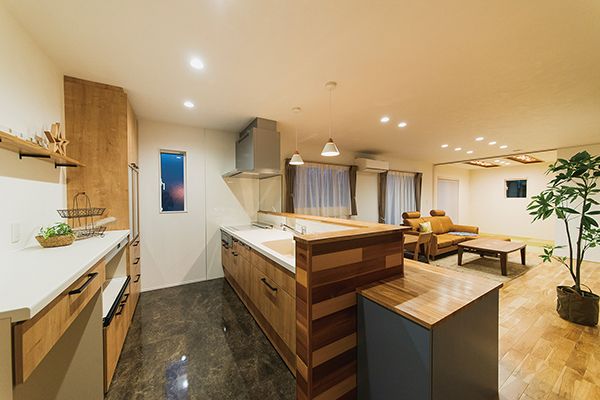 細長い形状に合わせ、ワンフロアのLDK+和室や水まわり、居室をコンパクトにレイアウト。邸内全体に光が行き渡るように窓の大きさや位置も計算し尽くされた住まい。木の温もりを感じるナチュラルな雰囲気も大満足だそう。
