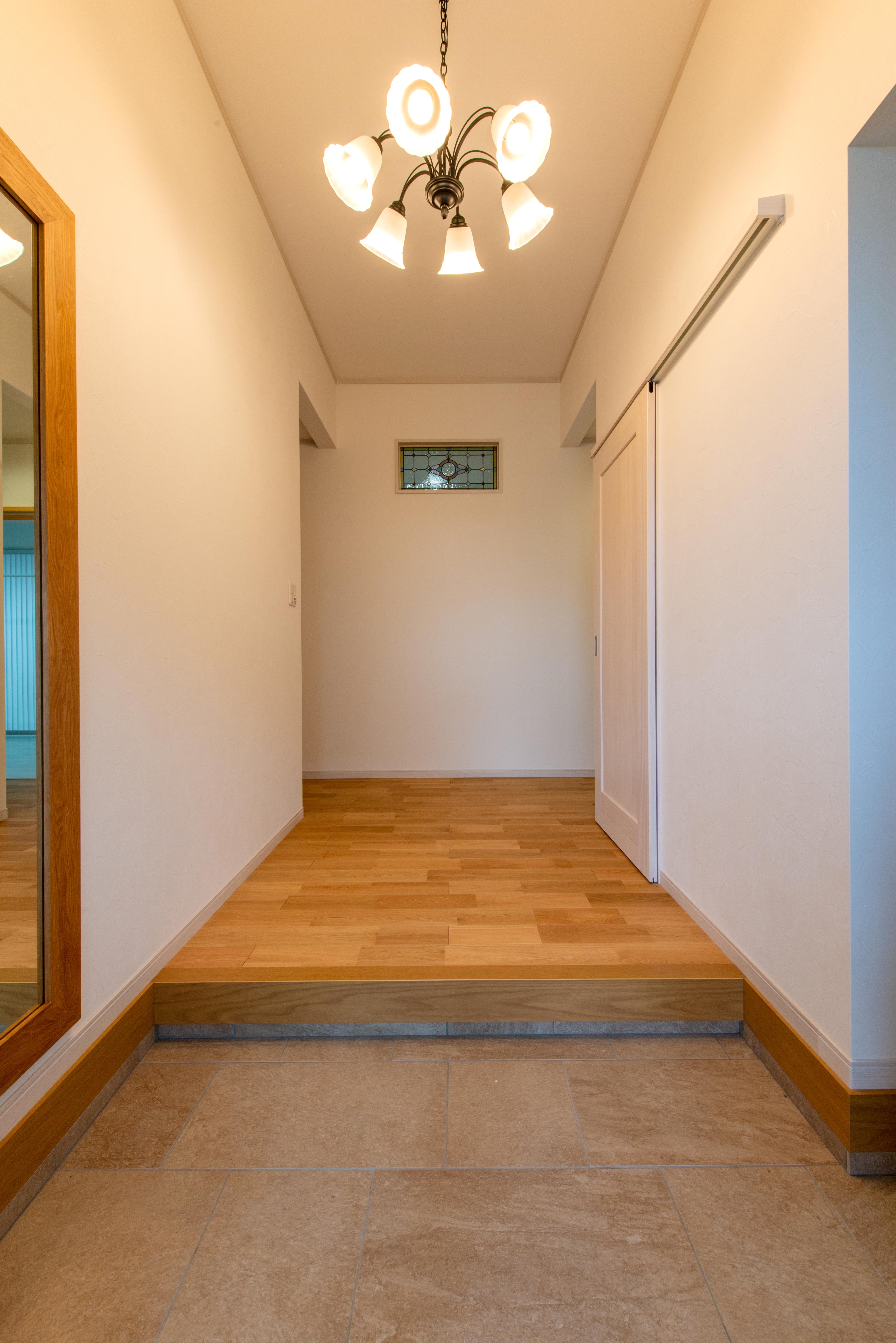 シャンデリアやオーダーのステンドグラスなど、こだわりを取り入れた内装。右側の扉を開けると、ウォークスルーのシューズクロークがあり、収納にも優れたつくりになっています。
