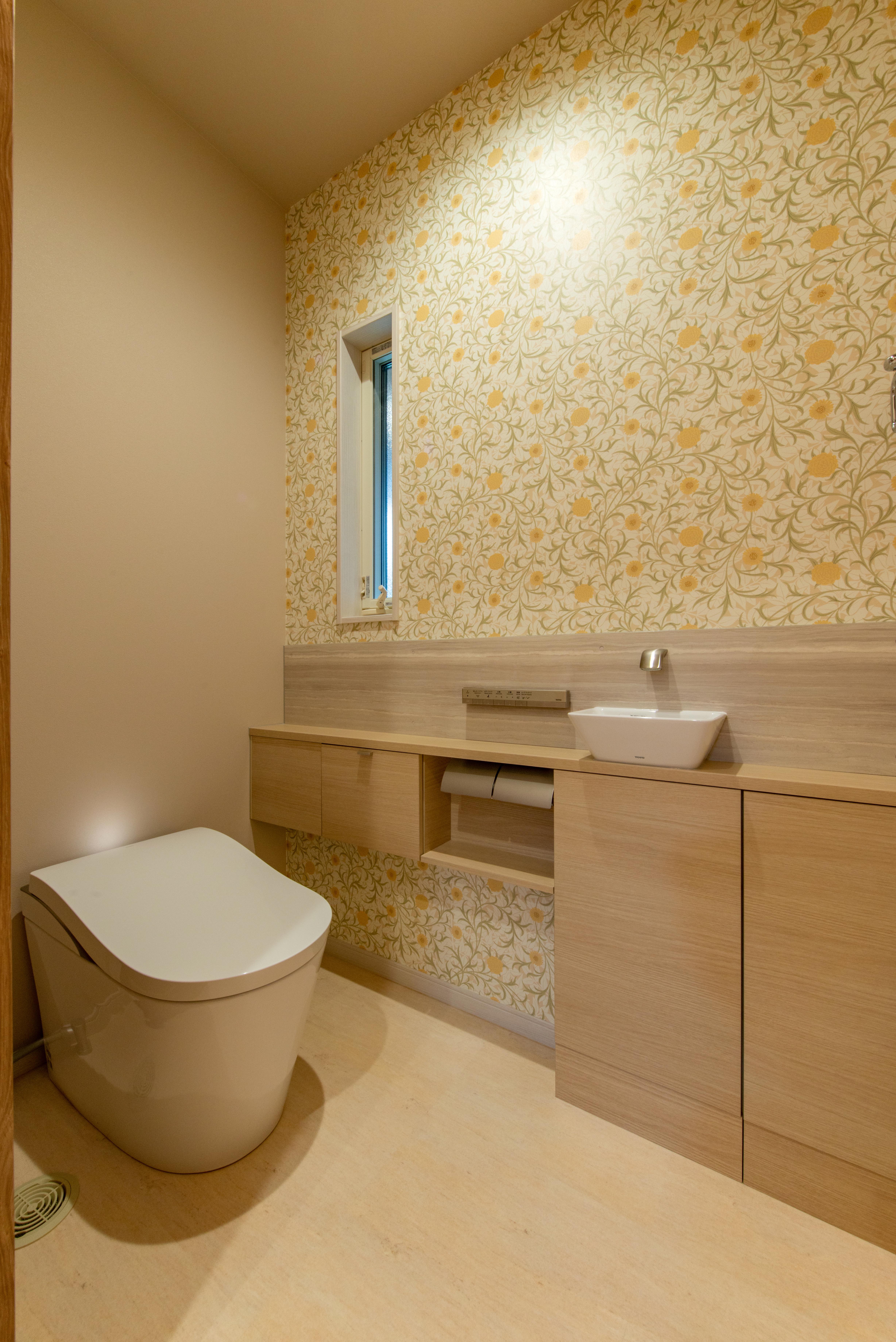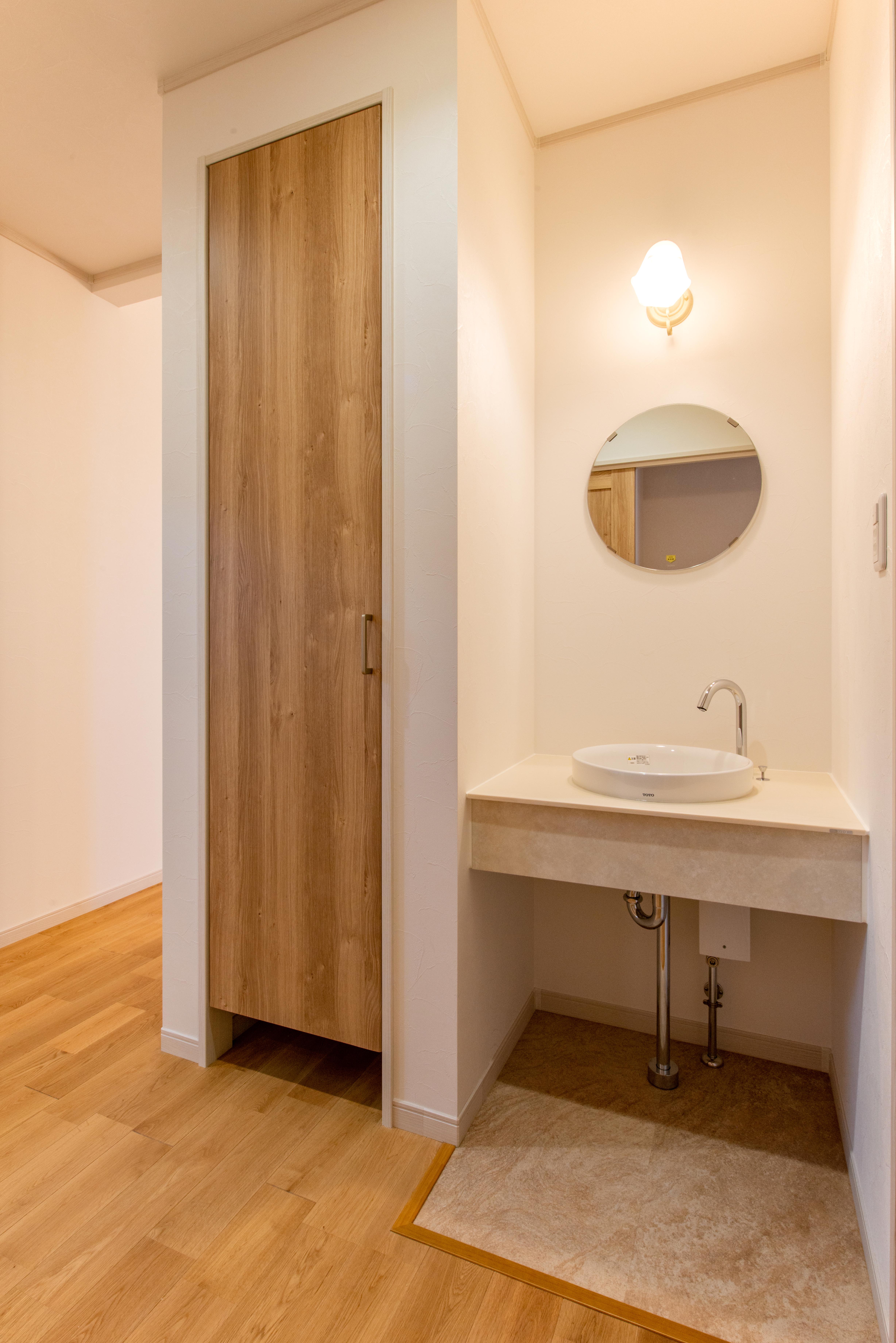 スキンケアやメイクをゆったりできる洗面室には、収納もたっぷり確保し、実用性も兼ね備えています。