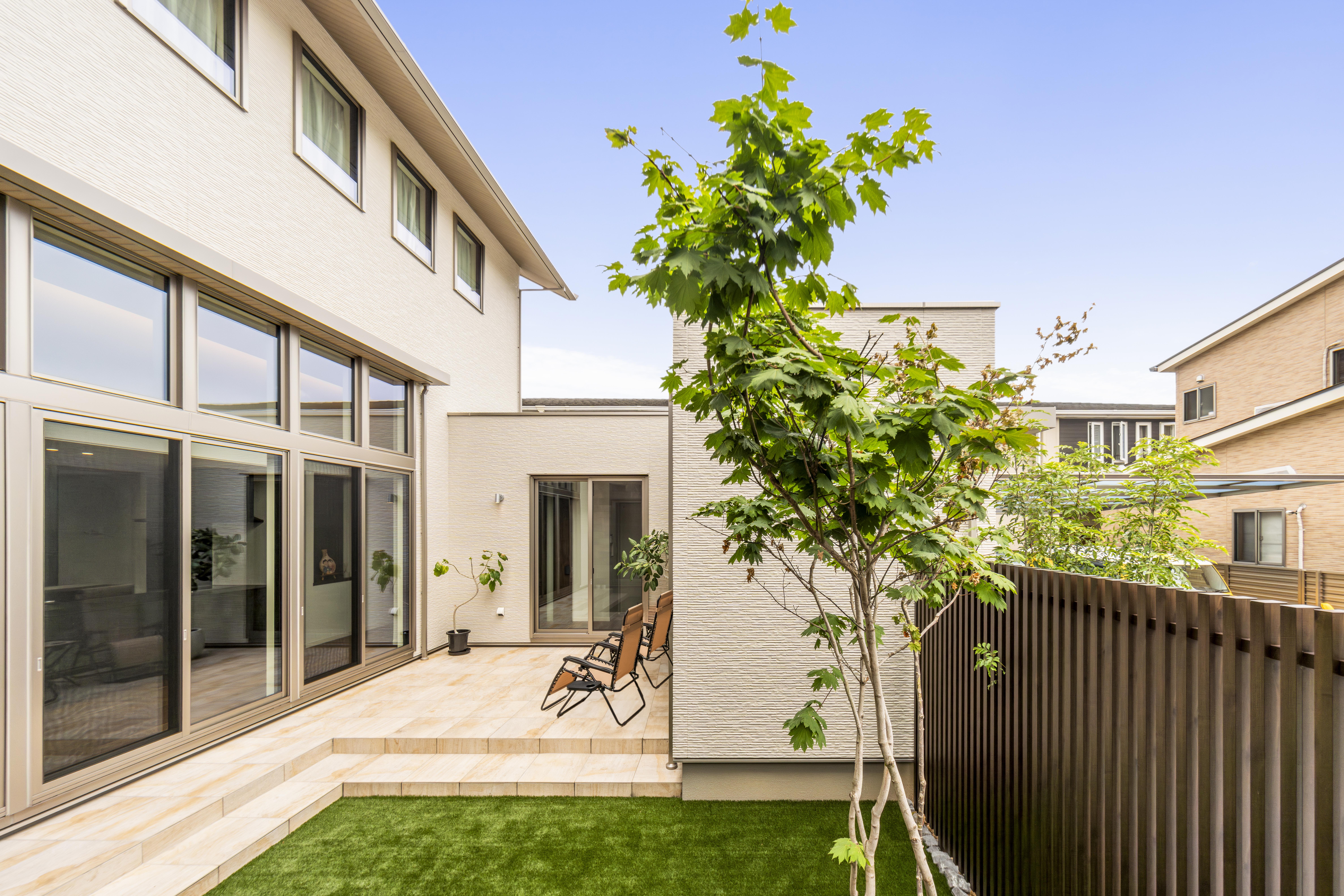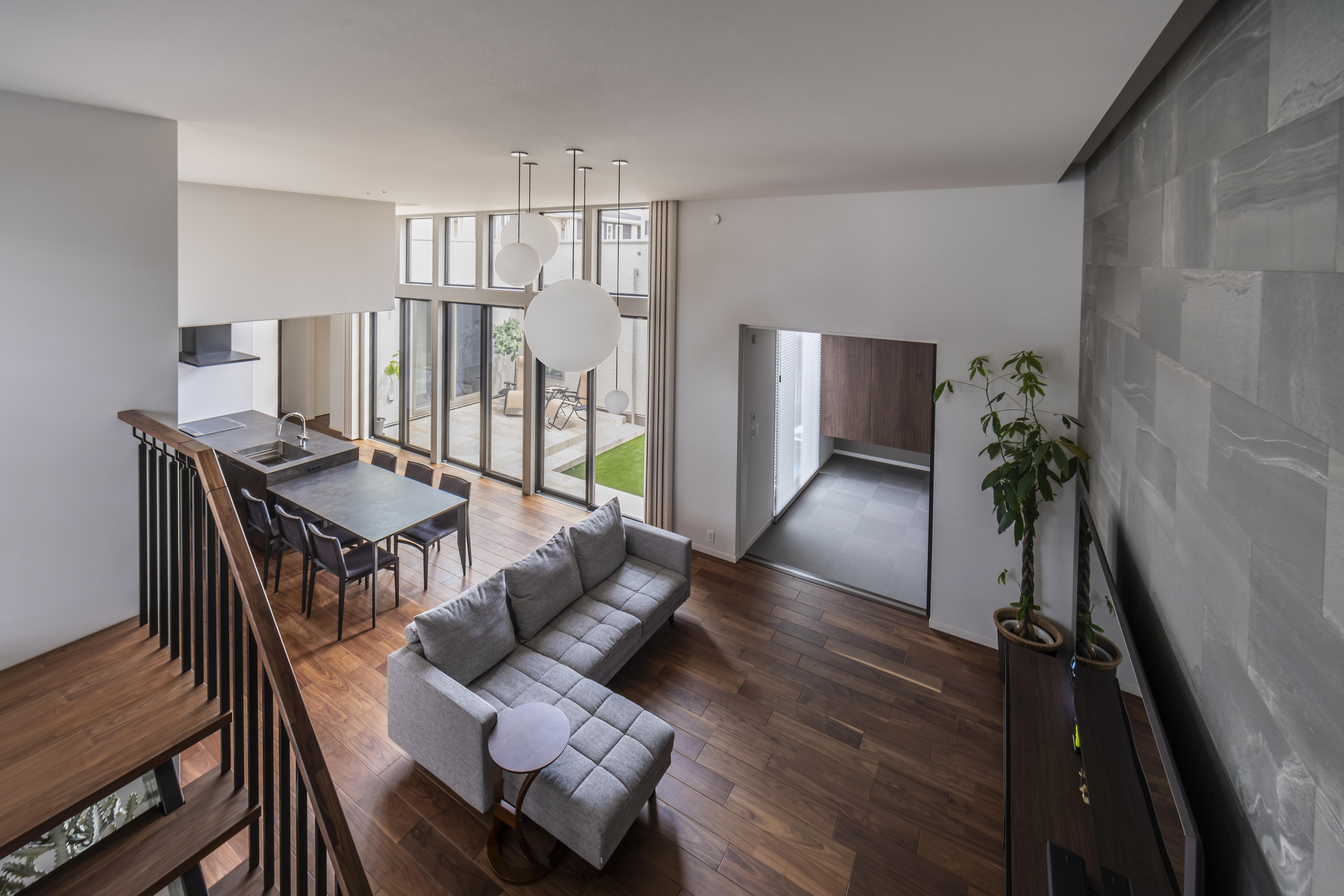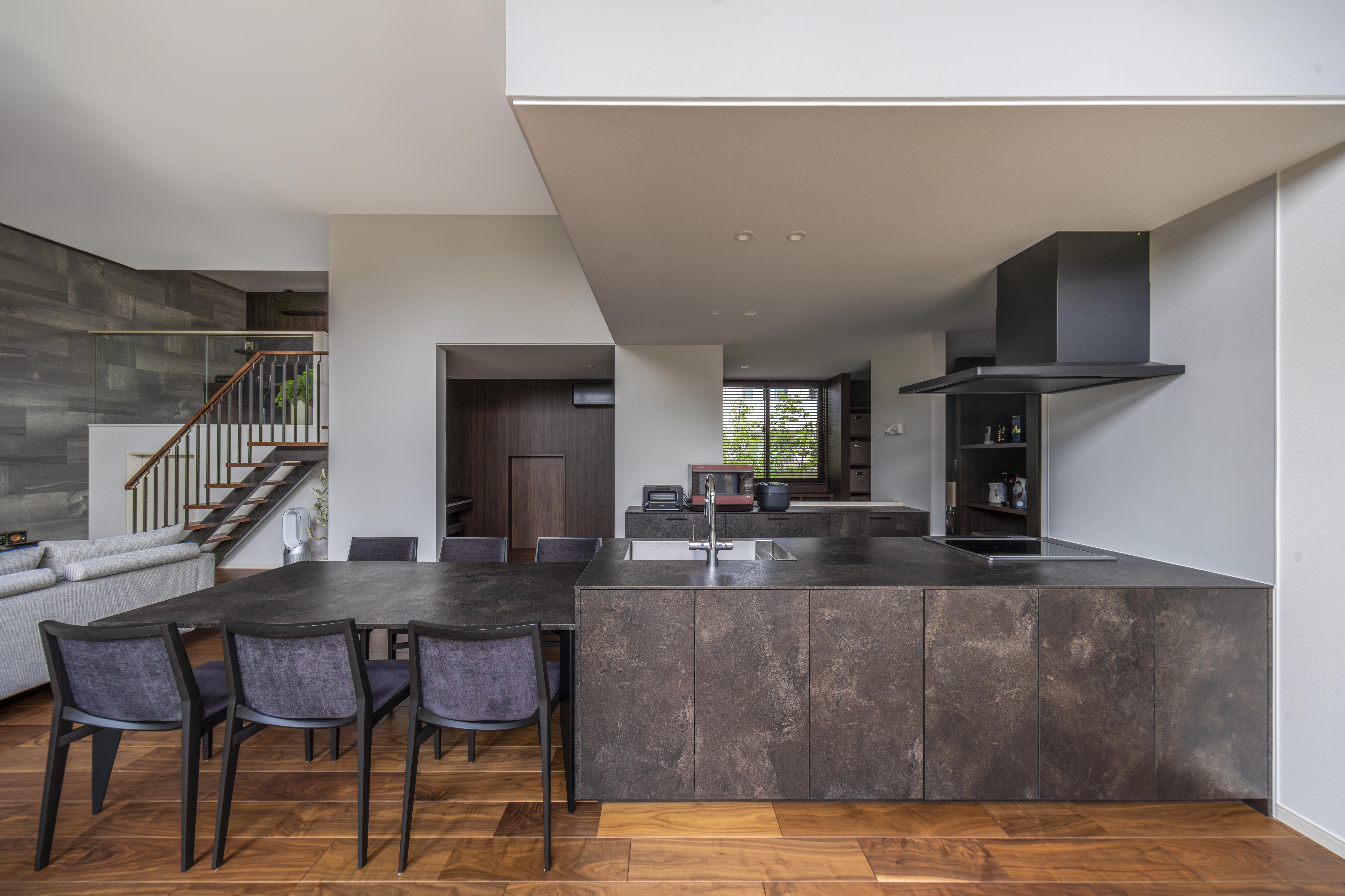 共同住宅と隣接する敷地にある邸宅。ご夫妻がもっともこだわったのは、「周辺からの視線を気にせず家族全員が集まって、一緒に過ごせる開放的な大空間」。高天井と大開口サッシが生み出す開放感あふれる空間には、「蔵」と「1.5階スキップフロア」をプランニング。ワンフロアにLDK、畳スぺ―ス、スタディコーナーを配し、家族の気配を感じながら、それぞれに過ごせるレイアウトがポイントになった。ミサワホームといえば、空間づかいの妙技。リビングつながりの蔵はお子さんの秘密基地として活用しているが、ゆくゆくは収納スペースに。1.5階スキップフロアは旦那さまの書斎に。またLDKは白、サブスペースはダークブラウンと、壁や建具、窓枠の色を変えることにより、視覚的なゾーニングが実現。緻密な設計から生まれた大空間は、集いたくなる心地よさで満たされている。