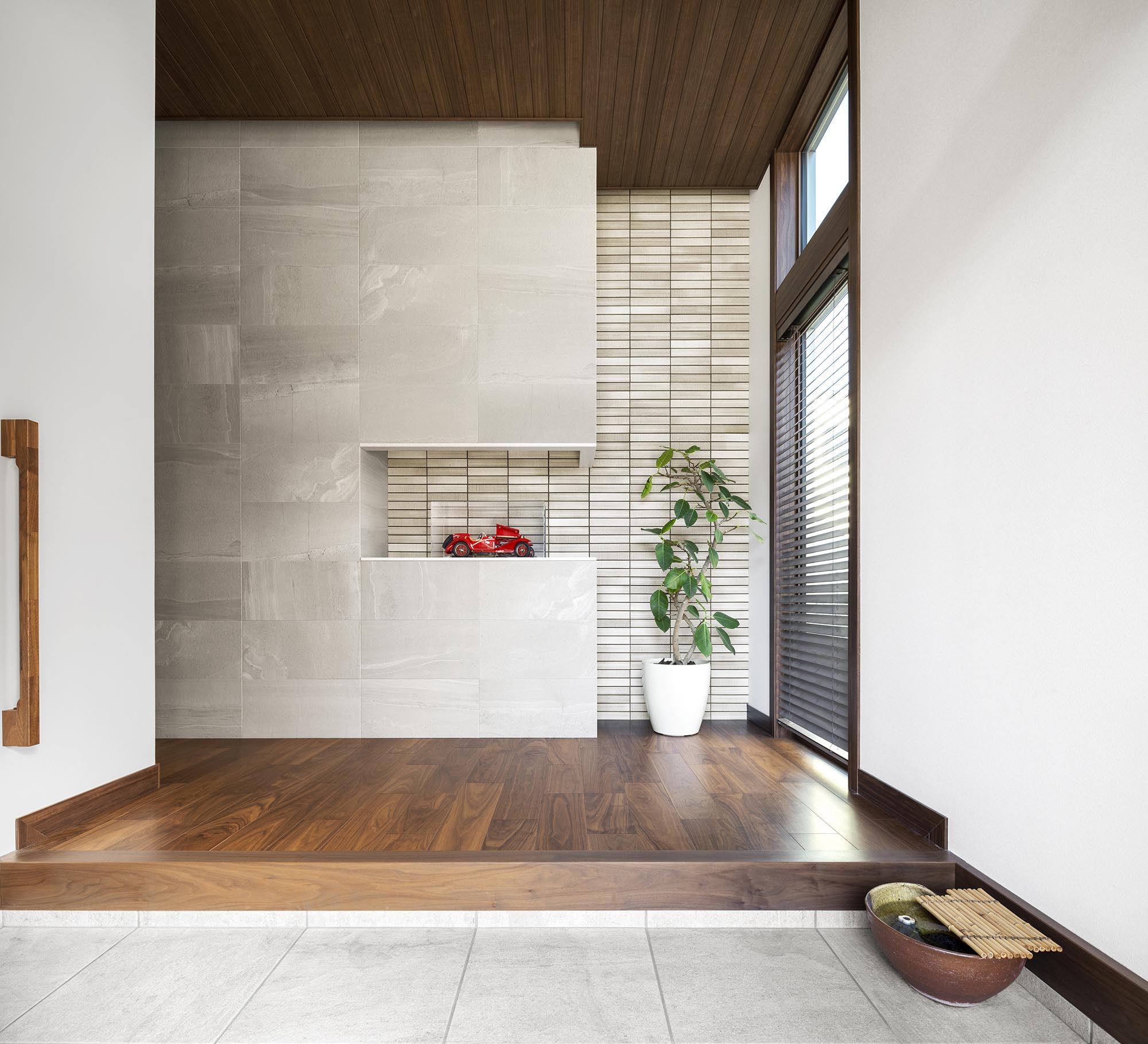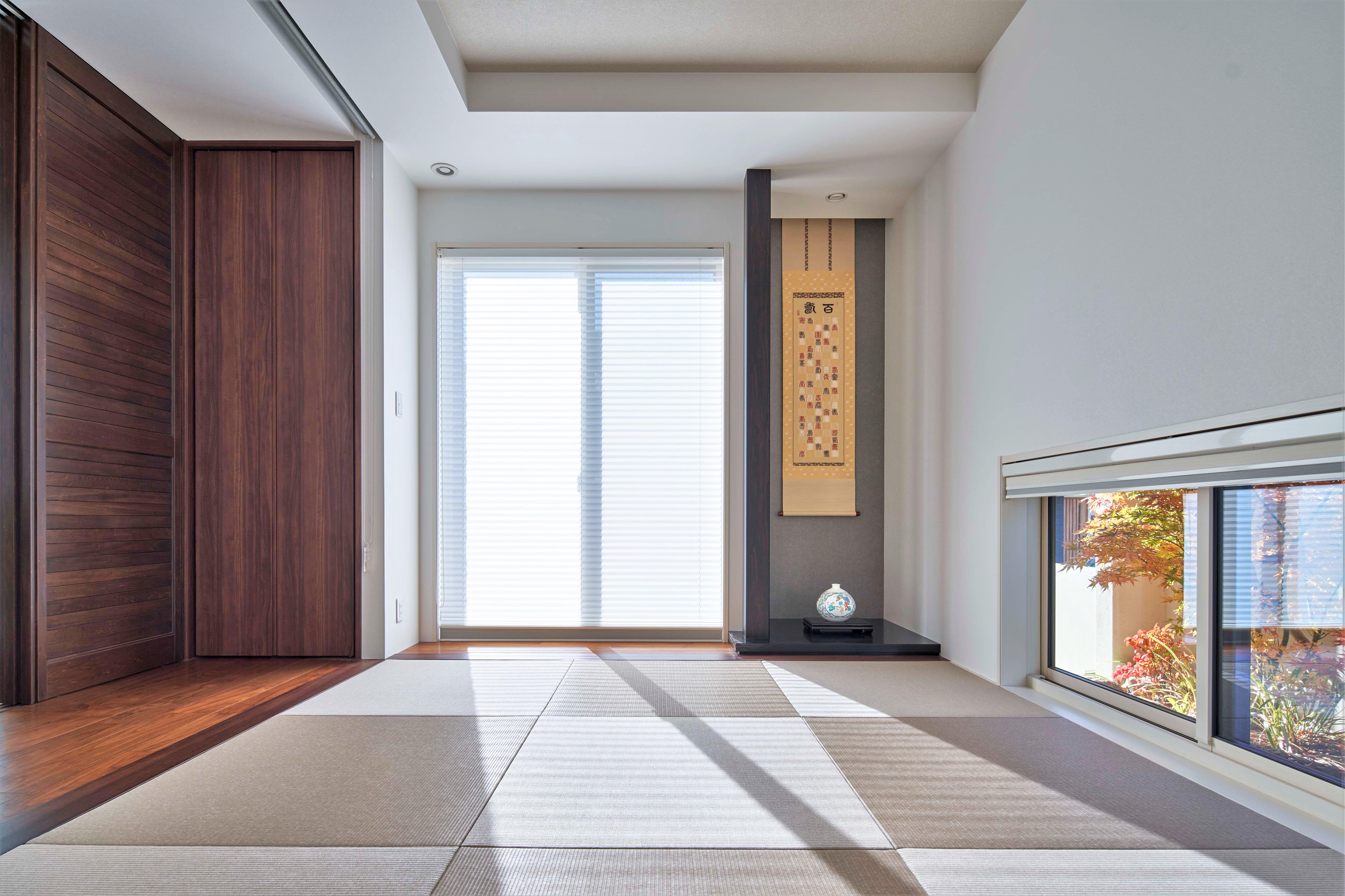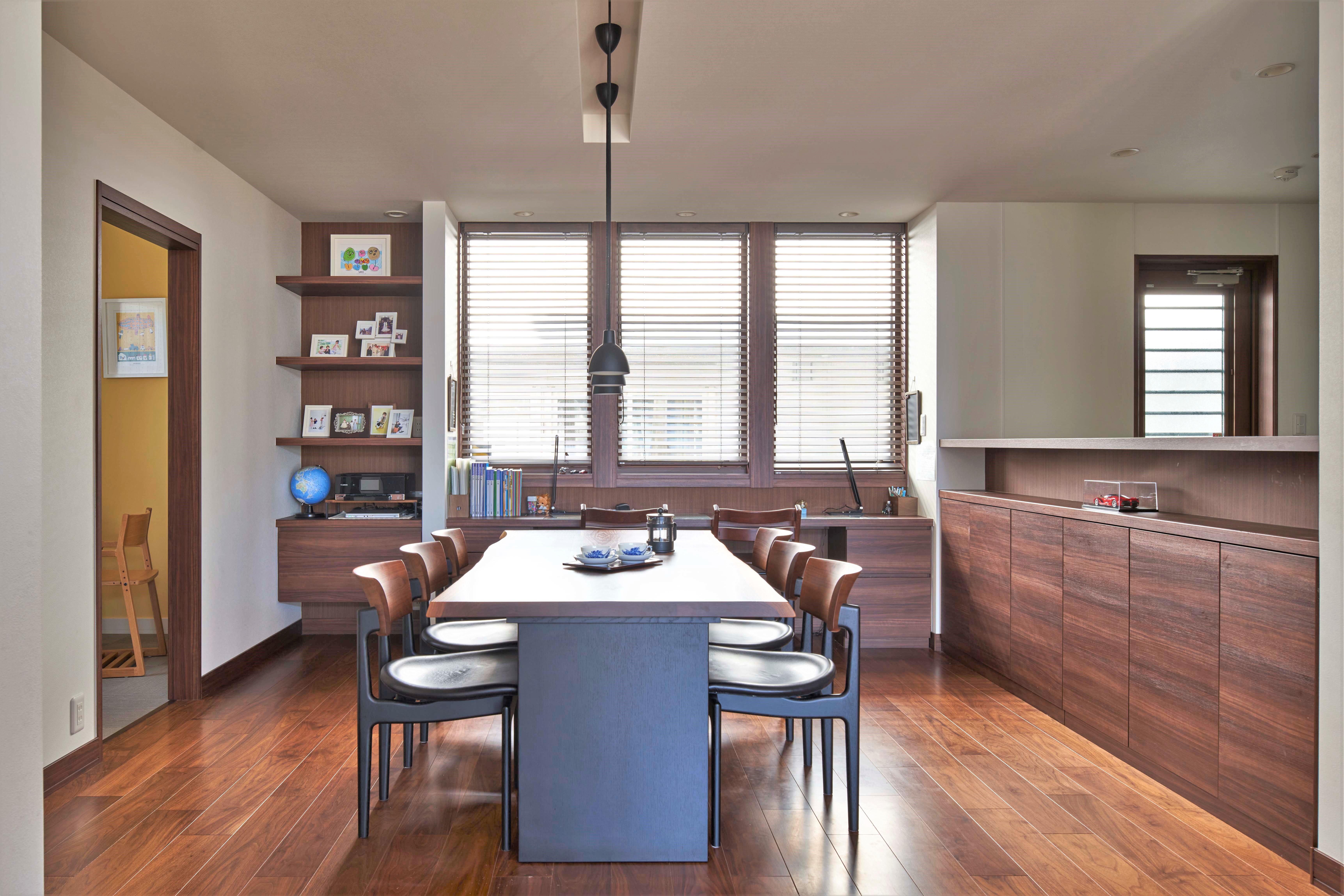 この家の印象を形成しているのは「矩形による空間美」。西川さんは外観や壁面に短形を組合せた構成とすることで、整然とした美しさを表現した。リビングにはウォールナットの板張り天井を採用し、深い軒天井と連続させて、内と外の一体感を演出。南一面の窓から豊かに光と風を迎えている。キッチンは作業する手元がダイニングから見えないよう、高めに造作したカウンターでゾーニング。生活感を抑えたダイニングの収納棚や窓辺のスタディコーナー、開口も同系色で構成する矩計により統一感を出している。素材の色も合わせることで、よりすっきりと美しい印象に整えた。和室は地窓越しの坪庭に視線を導き、そこに置かれた庵治石のつくばいが季節の彩りを添える。落ち着いたウォールナットと矩形で構成された空間は、装飾に頼らずとも凛とした美しさをまとっている。