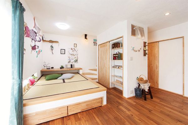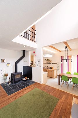 土間キッチン&ダイニング、吹き抜けのリビング、小上がりの畳コーナー。床の高さが違う3つの空間が、ゆるやかにつながっています。