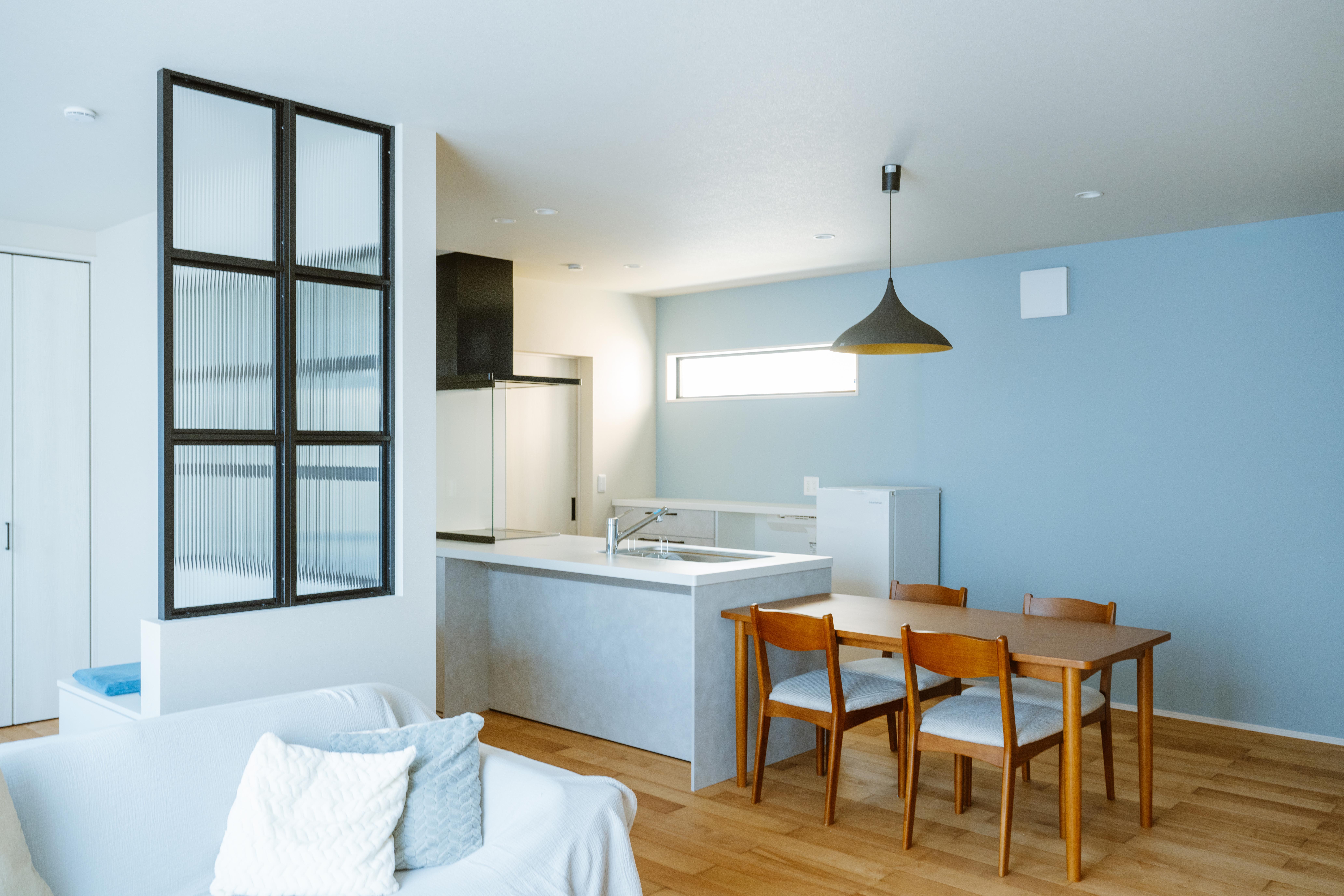 ブルーの壁がお洒落な広々としたLDKの一角に、リビングとつながりながらも隠れ家的なくつろぎを叶えるスペースを設けています。キッチンの奥には2方向から出入りできるウォークスルーのパントリーがあります。内壁を使ったつるめの間仕切りがアクセントになり、さらに、収納付きのベンチを造り付け。