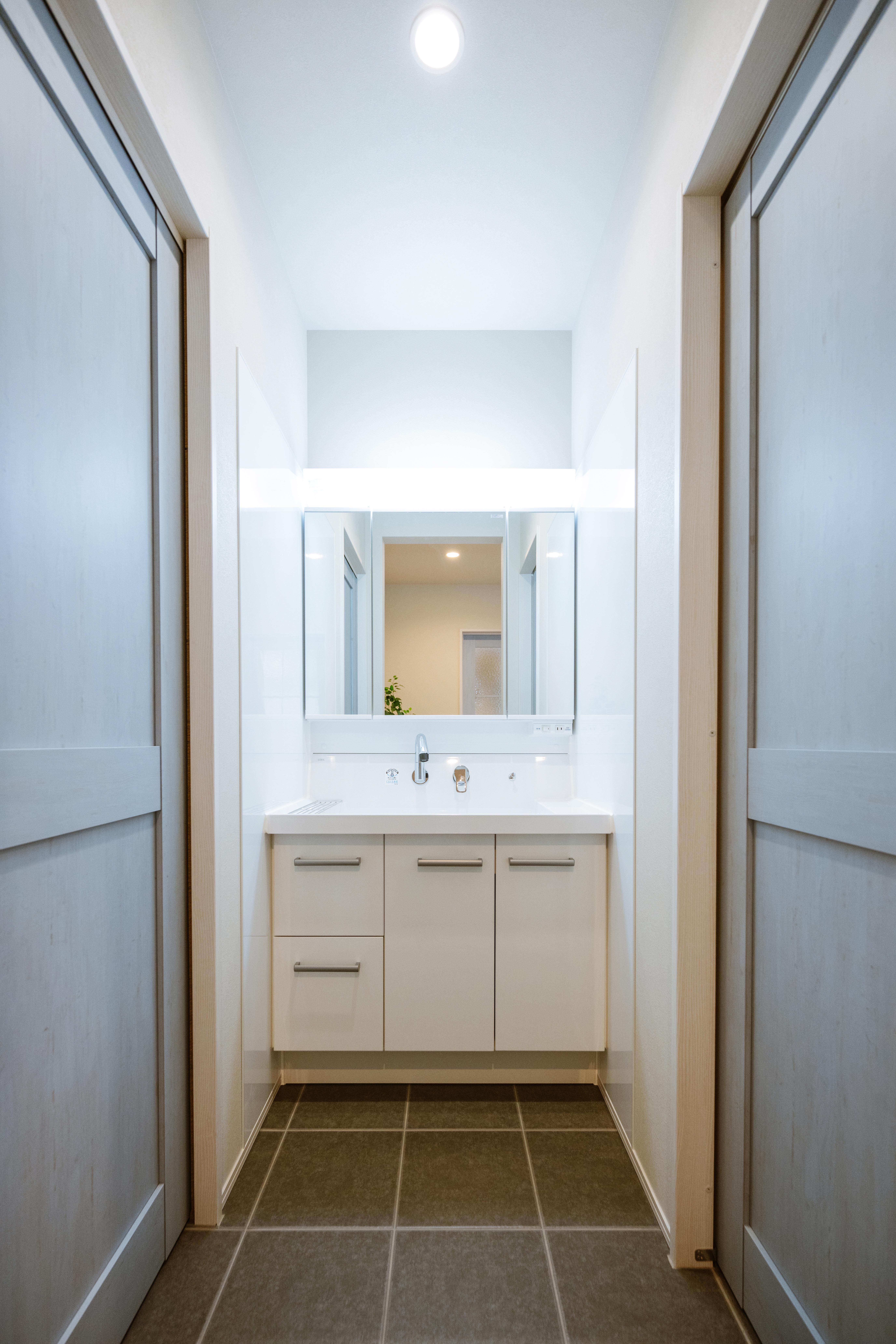 洗面室は玄関ホールの横に脱衣室とは別に配置しているので、帰宅後の手洗いに便利。家族の入浴時にも気兼ねなく使えます。