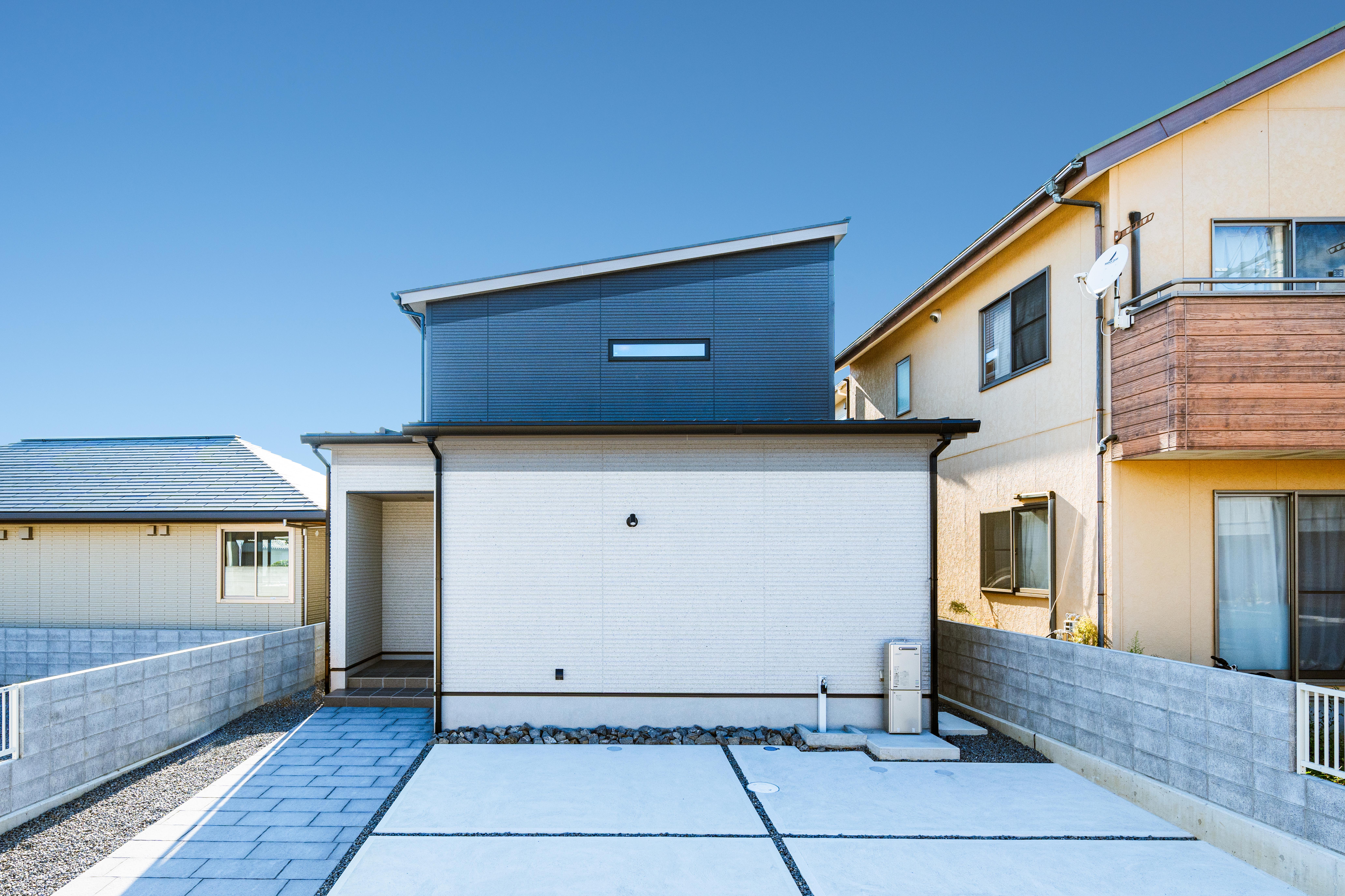 2024年5月に松山市久保田町に誕生した【街かどモデルハウス】。高級感のあるシンプルモダンな外観デザインが印象的。