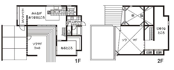 クライアントの希望は、明るく開放的であること。そこで、キッチン、リビングを成す“みんなのあつまるところ”を吹き抜けにし、ソラマドに面することで自然光の明るさを十分に確保。全空間に使用する無垢材の床、漆喰の壁は安心感だけでなく、空間を明るく見せる効果も期待できる。コの字型のキッチンは造作で、ナチュラルな空間に溶け込むようデザイン。作業するスペースと家族が憩うスペースを分け、奥様の気持ちの切り替えもスムーズに。クライアントとの打合せの中で、隣にある母屋とのつながりも意識。両親が野菜を育てる畑や母屋が見えるよう、キッチンや2階の窓を配置した。家族の空間は内に広がっているが、のどかな周囲の環境を取り入れ、外とのつながりも感じられるバランスのとれた住まいとなった。