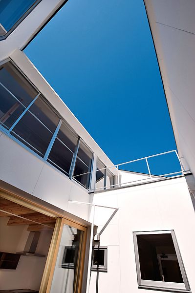 濃いめのブラウンを要所要所に取り入れることで空間をスッキリとまとめました。ソラマドコートのスペースは屋根をぽっかり空けて空を感じられるつくりにしています。夏は2階のバルコニーから花火が見られるのを楽しみにされています。