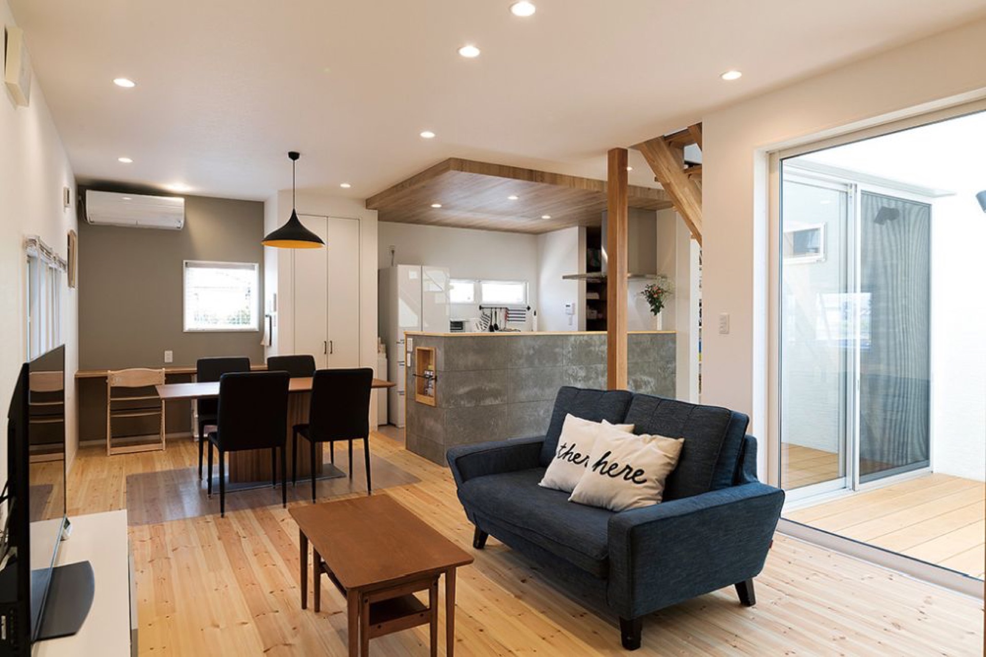 部空間は、無垢材の床に白壁をベースとしてナチュラルに構成しつつも、アイアンのリビ