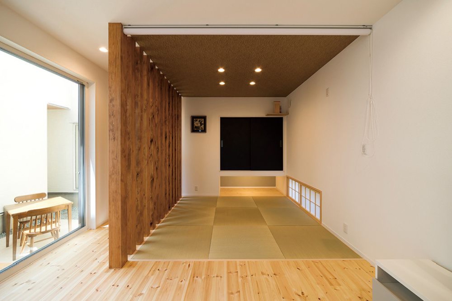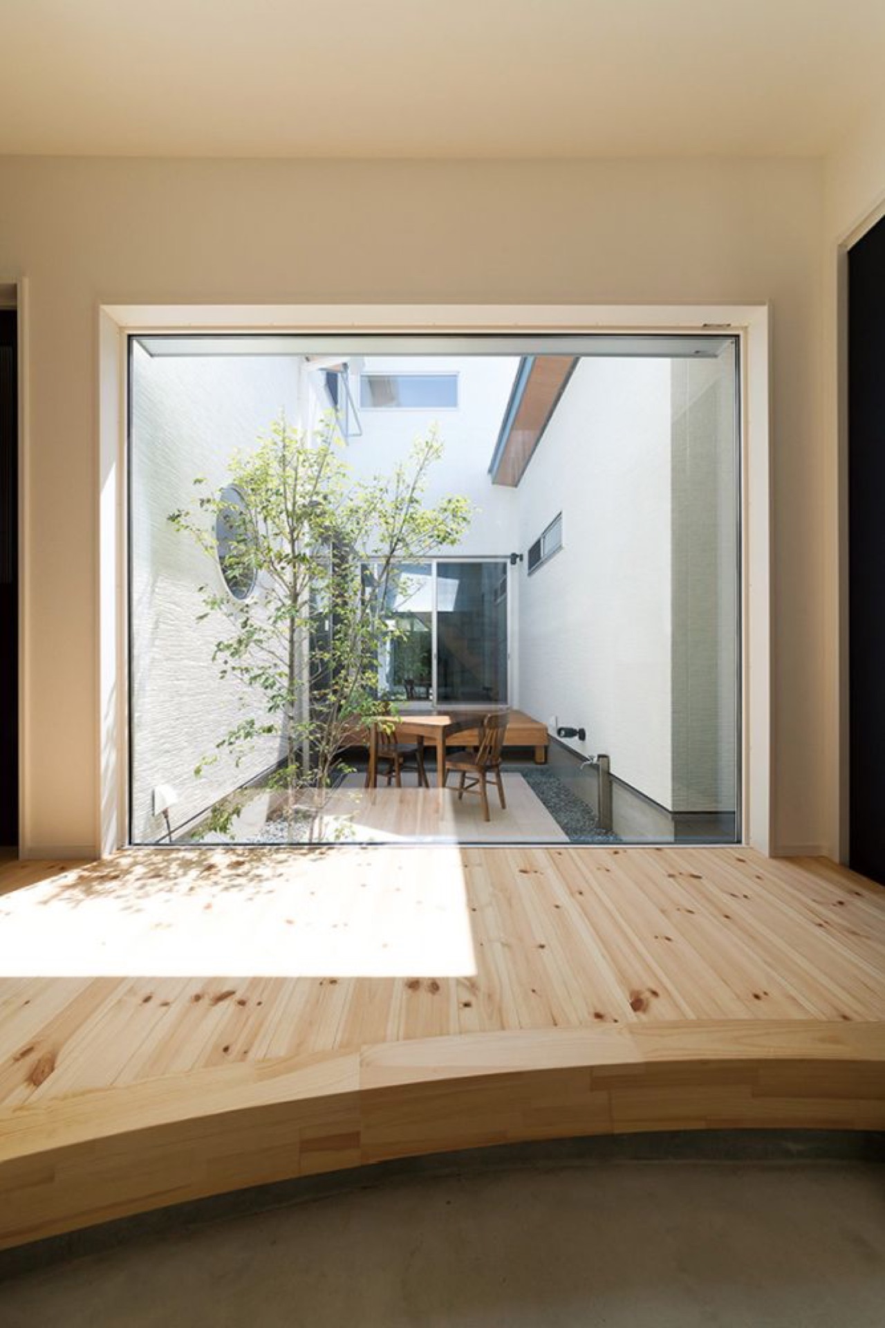 の戸を引けば、空と緑が美しい正方形のピクチャーウインドウ。その景色は時間の経過と