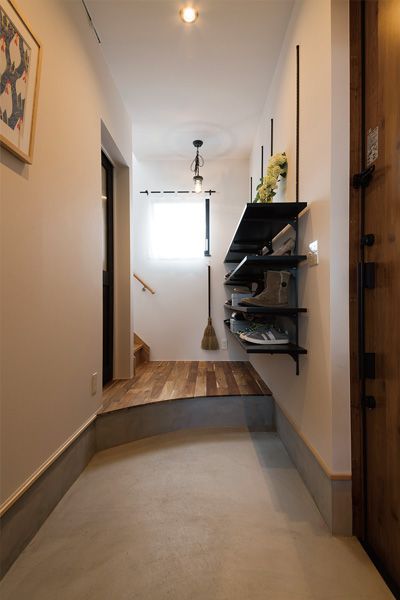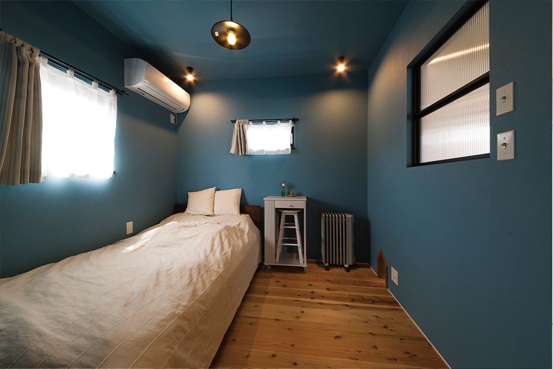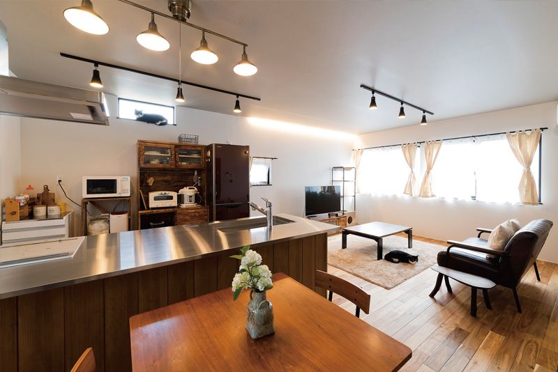 敷地は、北側と西側に生活道路が走る住宅街。面積も限られているなか、開放感とプライバシーを兼ねるアイデアとして、家の内部に庭をつくるコートハウスを計画した。1階は外に対して閉じた空間とし、ビルトインガレージと夫婦それぞれのホビールームをレイアウト。そしてホビールームから外に出ると、住宅のすべてを繋ぐような16帖の中庭が広がる。家のほぼ南半分を占める中庭は、周囲からの視線が届かない2階にも開放感を与える。LDKと寝室、水まわりの生活空間を集約させた2階には、中庭に面した南側に開口とバルコニーを確保した。また、家族の一員である人も猫たちも心地よく暮らすために、キャットトンネルや専用のトイレも造作。木材やモルタル風の天井、アイアンなどが創出するヴィンテージ感で統一した生活空間に、造