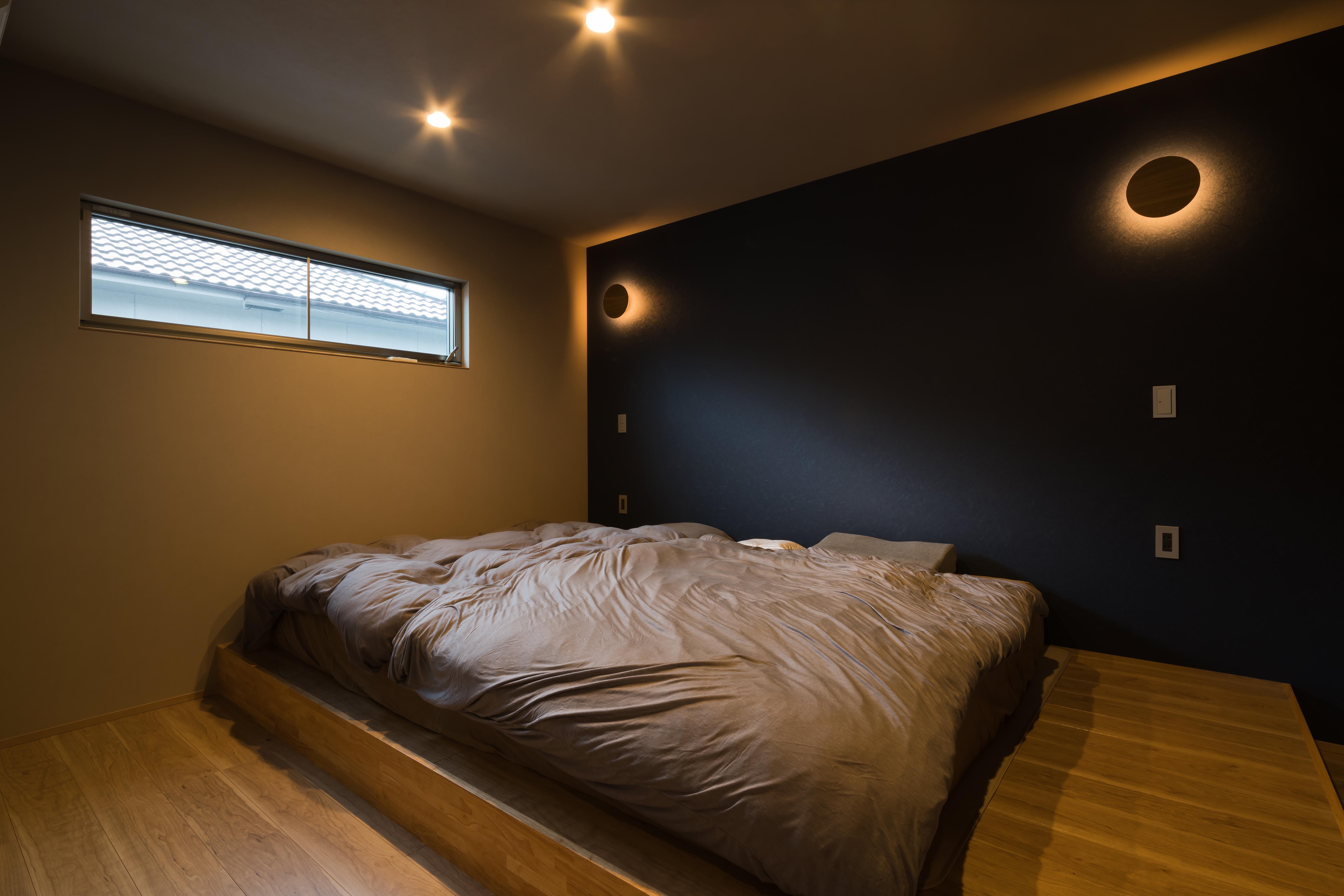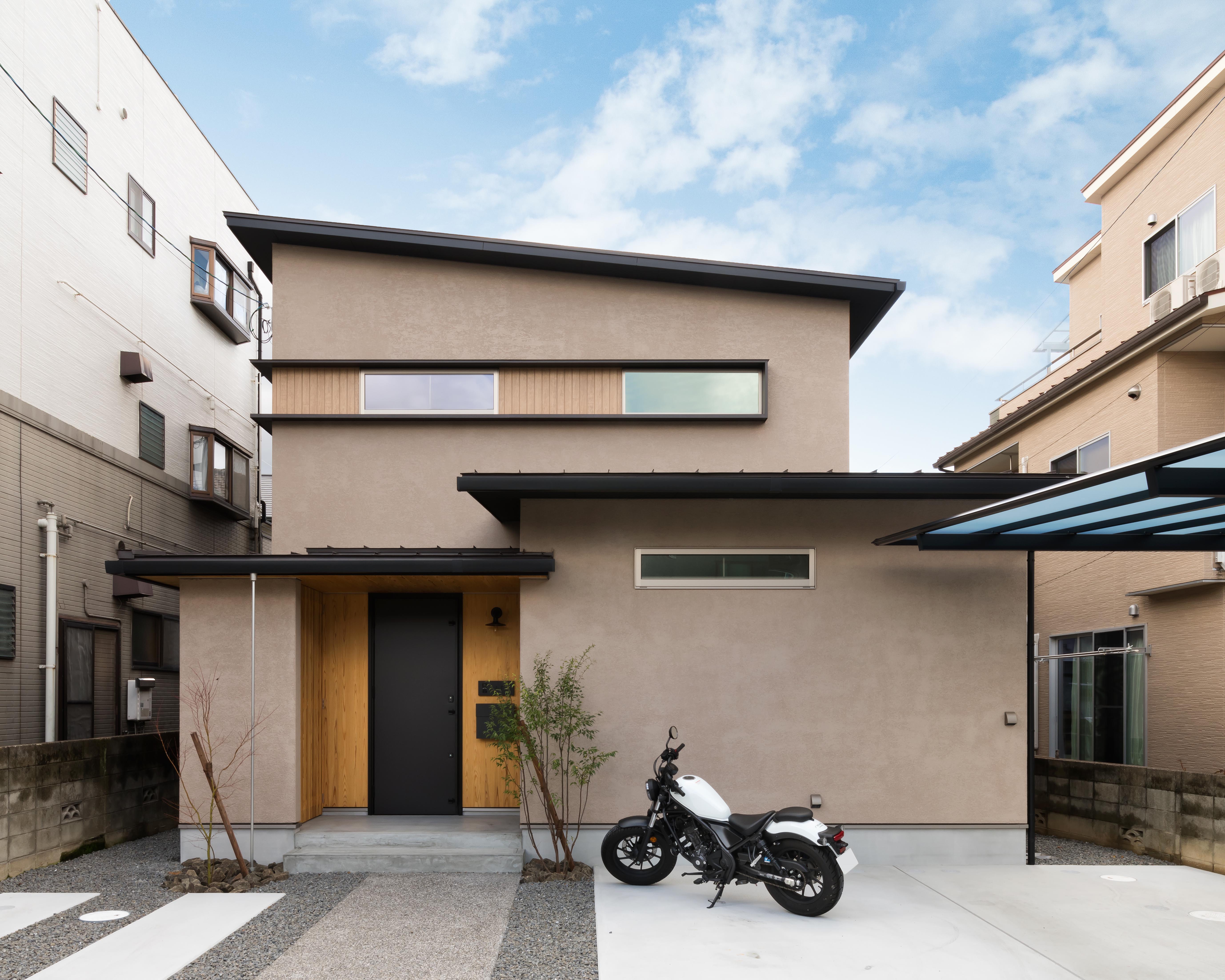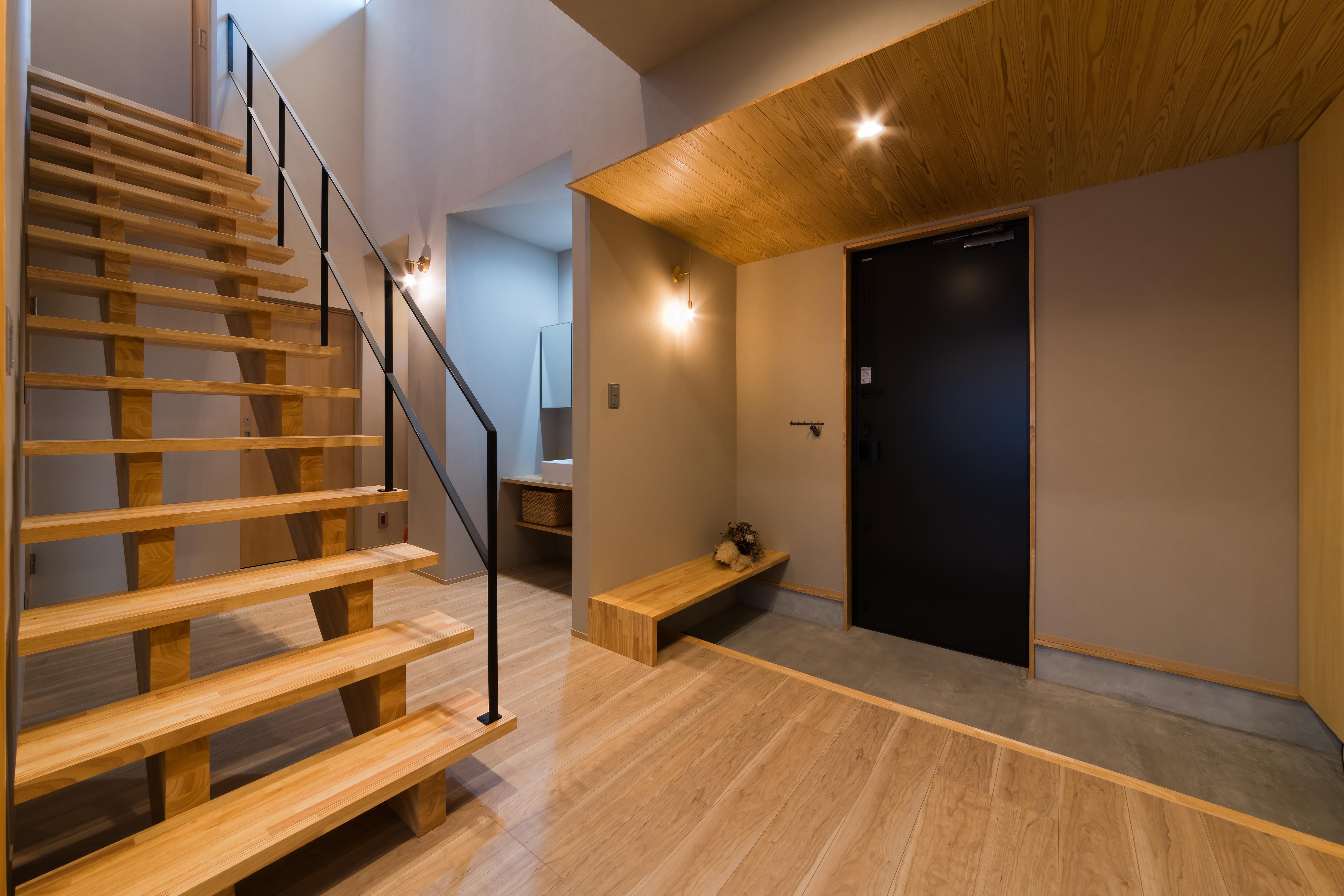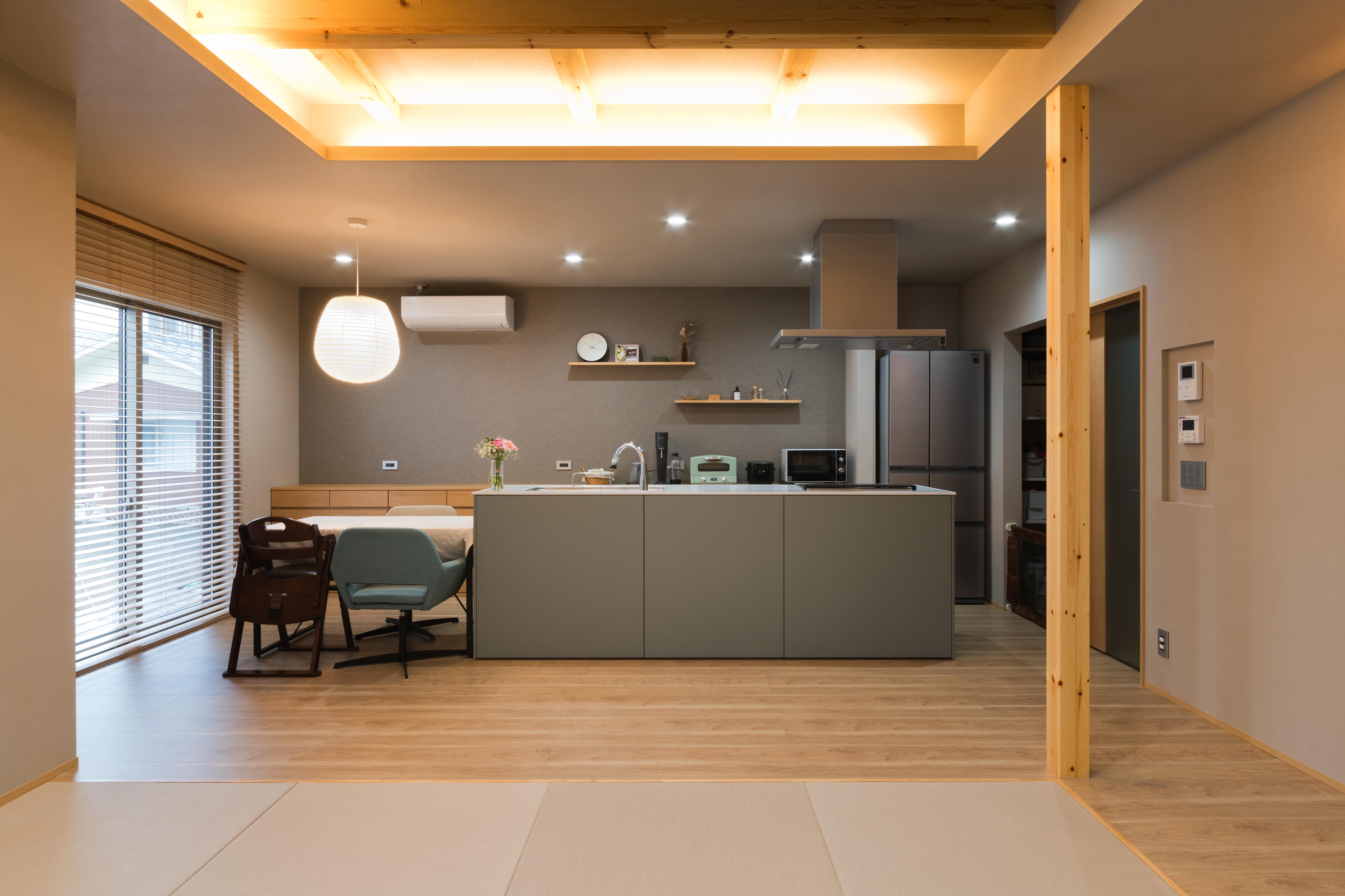 ベージュやグレー、モスグリーンなどのアースカラーに、無垢の梁や柱、格子の造作扉が美しく調和した和モダンな邸宅。玄関ホールにはアイアン手すりの階段が鎮座し、吹き抜けの開放感が際立ちます。リビングはフローリングではなく畳のフロアとし、冬にはこたつを置いてくつろぐことを楽しみにしているそう。折り上げ天井には杉の梁をあらわしにすることで天井をより高くし、控えめな間接照明が落ち着いた雰囲気を演出します。南向きのLDKは光と風が通り抜け、縁側での日向ぼっこも心地いい住まいです。