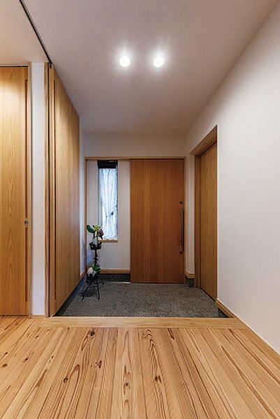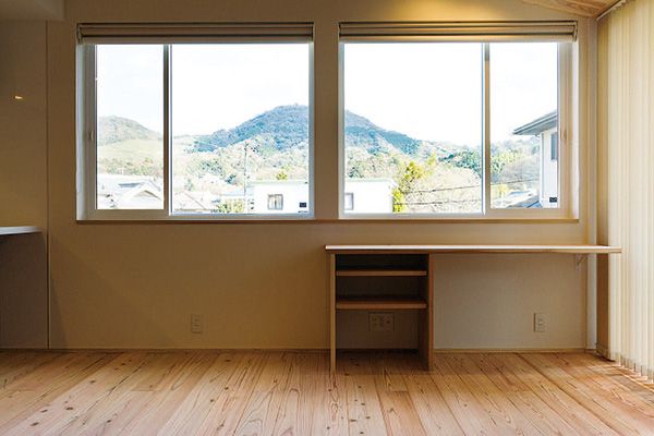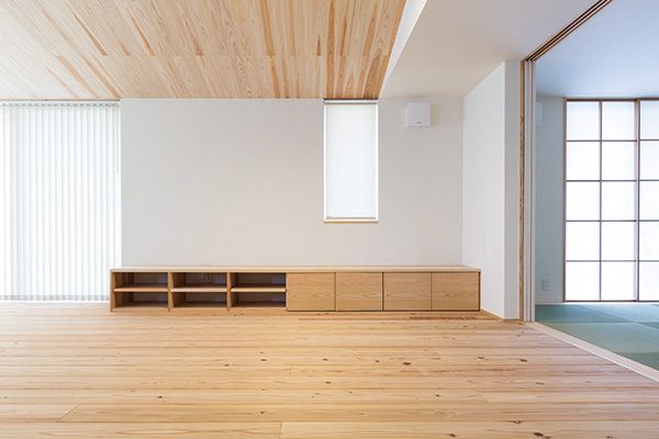 夫婦でセカンドライフを満喫する住まいの建て替えを検討されたMさまが依頼したのは、自然素材の質感を表現しつつ、高性能で住みやすく快適な家づくりをテーマとするワンズスタイル。春は桜、秋は赤や黄色に色づいた木々…、四季折々の美しさを楽しみたいというリクエストに、リビングの窓に眺望を取り込んだ平屋でその望みを叶えた。LDKに和室、寝室、水まわりがコンパクトにレイアウトされ、廊下も書斎の役割を兼ねるなど無駄のない動線が快適な二人暮らしを演出する。また、杉板の勾配天井が印象的なリビングは、フローリングも杉の無垢材に珪藻土の塗り壁を用いて、シンプルな美しさが際立つ空間に。うづくり仕上げの杉床は、中温でじっくりと乾燥させることにより木の色合いと油分が保たれており、年月を経て飴色に変化する経年美を感じられる。古紙の断熱材を使った住まいは、北海道と同等の性能で、一年を通じて快適に過ごせる。