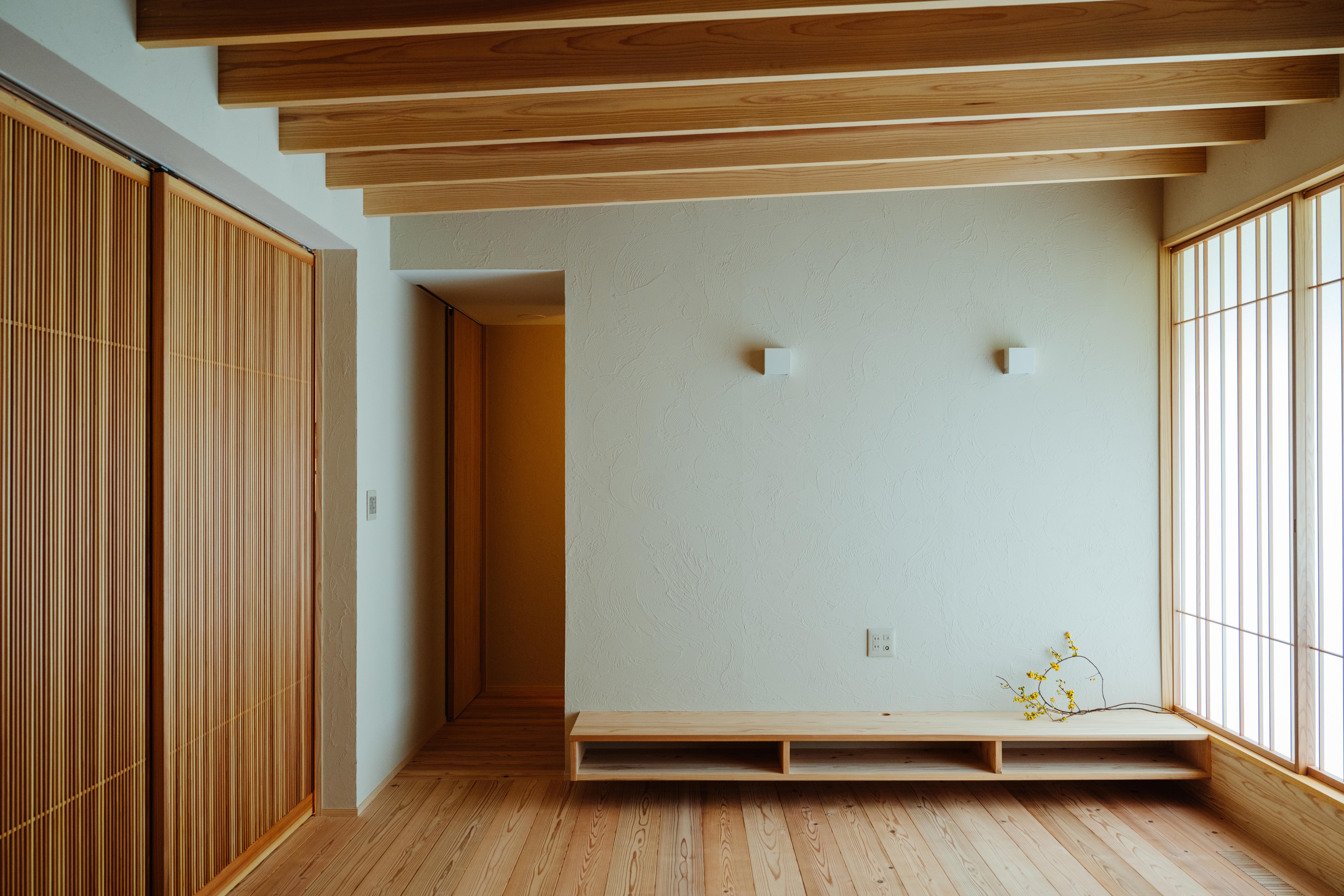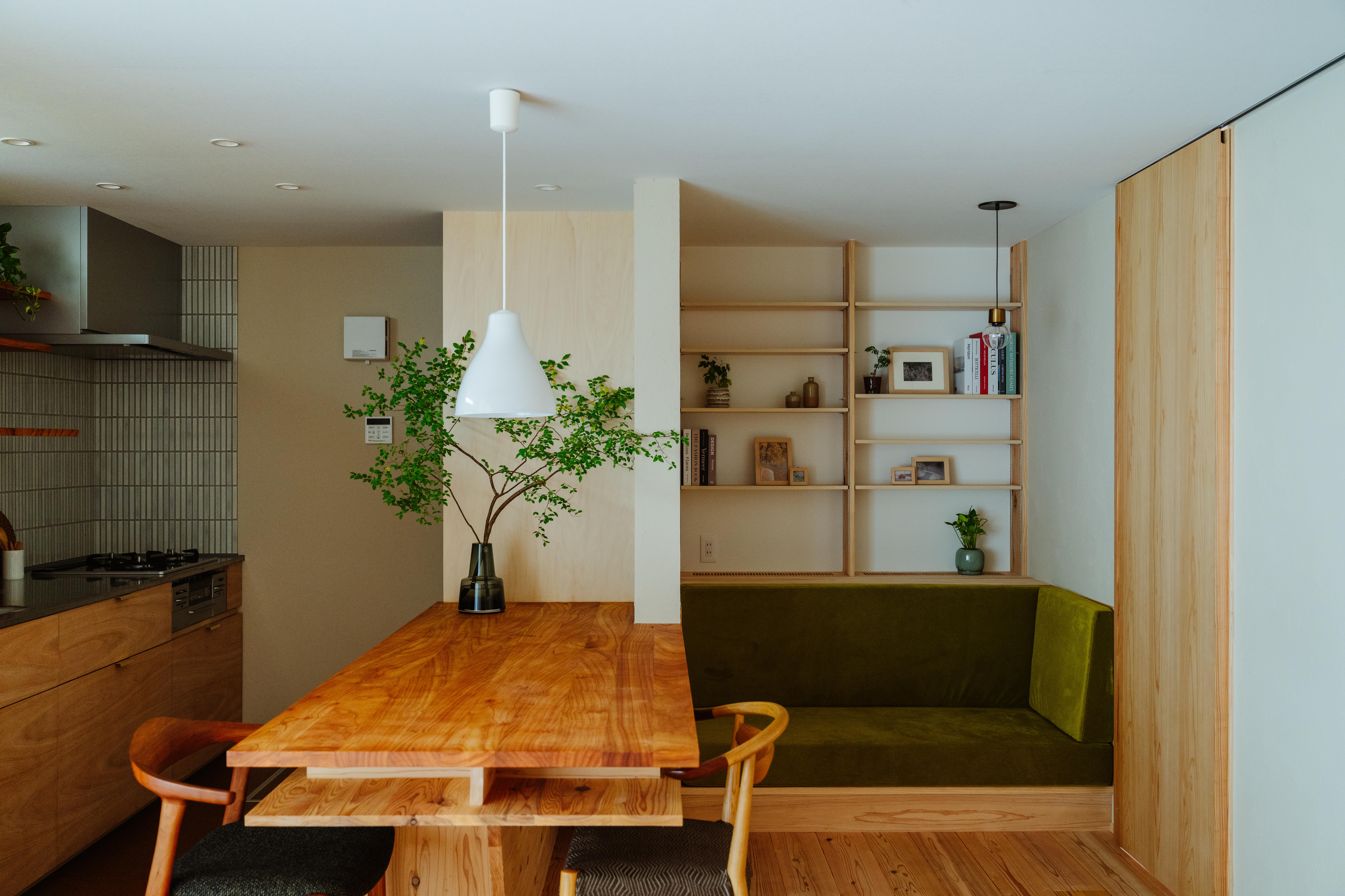 住宅が隣接する50坪ほどの敷地に、ご夫妻と中学生のお子さんが暮らす平屋を計画。南側は景色が良くないため、北側にLDKを置き、そのつながりに庭を確保することに。北向きは日当たりが悪いと思われがちですが、太陽に左右されず安定した光が入るというメリットがあります。この邸宅も戸を閉めていても、障子越しに柔らかい光が注ぎます。延床面積は約20坪という小さな平屋ですが、コンパクトなスペースでもくつろげるよう、キッチン収納を兼ねたダイニングテーブルを造作したり、ヌックスペースを設けたり、リビングの窓際にベンチとしても活用できる段差をつくったり。ご夫妻の要望である「家族の一体感」を高めつつ、好きな場所で好きなことを。それぞれの時間を干渉することなく過ごせるよう整えました。