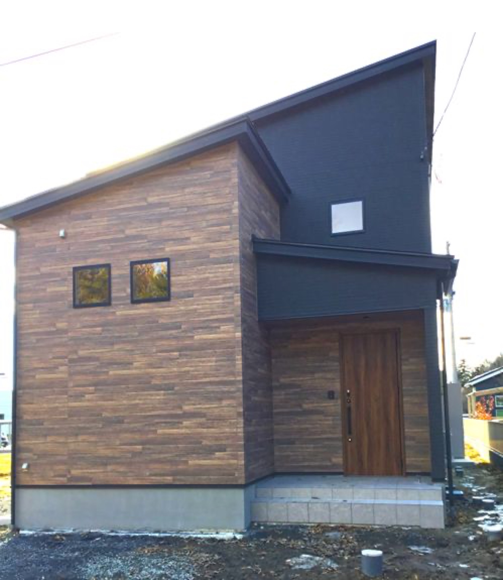 黒を基調としたウッド調外壁のアクセントでシンプルモダンな家