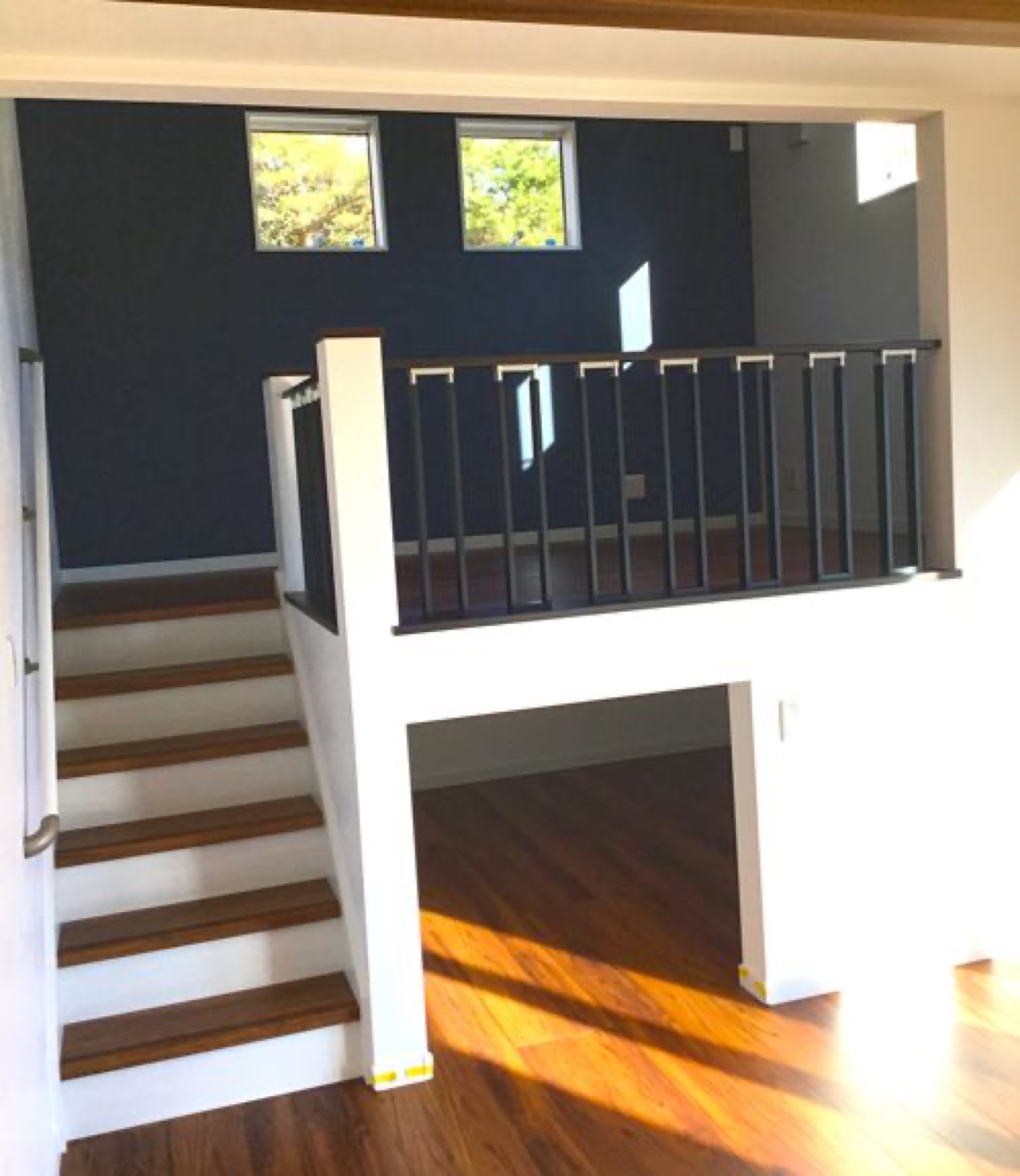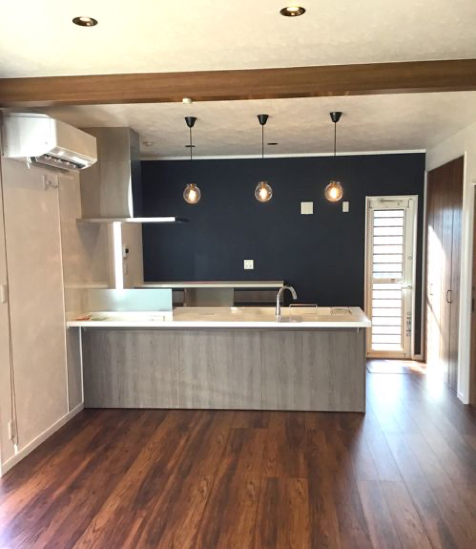 メインの黒色の外壁が映える様に木目調の外壁材がアクセントになったお家になります。内装もヴィンテージ風に仕上がっており、パパ大喜びのお家に仕上がっております。