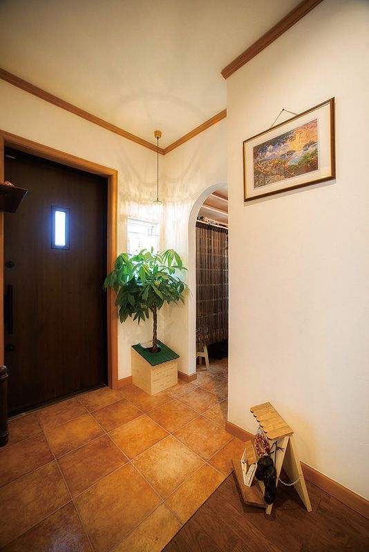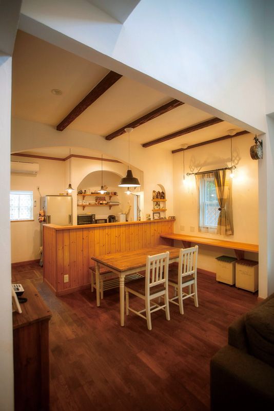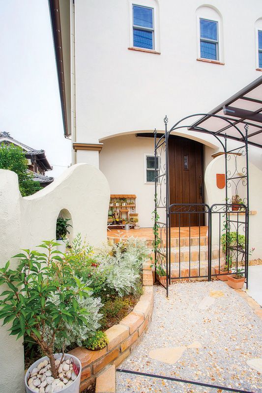 車いすで生活されるご家族がいることから、ご本人や家族の負担を少しでも軽くし、それでいてデザイン的にも“あこがれ感”で満たされた「めぐみの家」。レンガやグリーンで彩ったガーデンには、カーポートから玄関に向けてゆるやかなスロープを設置。玄関ホールも段差をなくし、ゆったりとした広さを確保している。LDKは木の素材感を活かしたオーガニックな雰囲気に仕上げており、キッチンの壁面には、Rの壁で仕切られた食器棚を造作した。無垢材のカウンターとモザイクタイルの調和が“大人かわいい”雰囲気の洗面室は、使い勝手に考えて足元には空間を設けている。2階のホールから顔をのぞかせれば、吹き抜けのリビングにいる家族とのコミュニケーションをとることができ、日常的に家族のつながりを意識することができる。設計者が住む人の日常に配った目線が随所に感じられ、その配慮があたたかい空気を生み出している住まいだ。