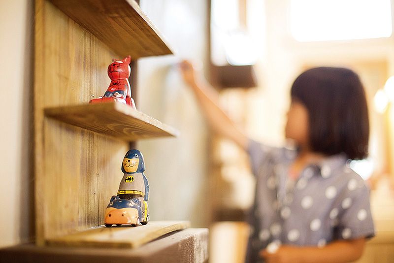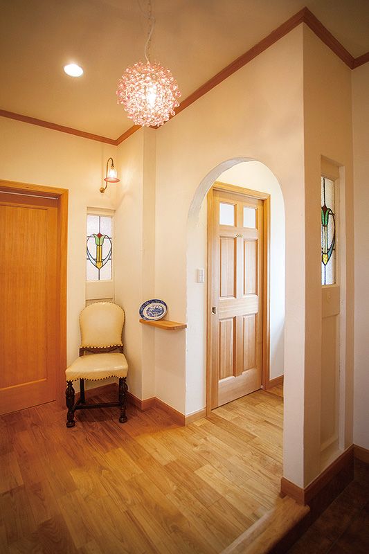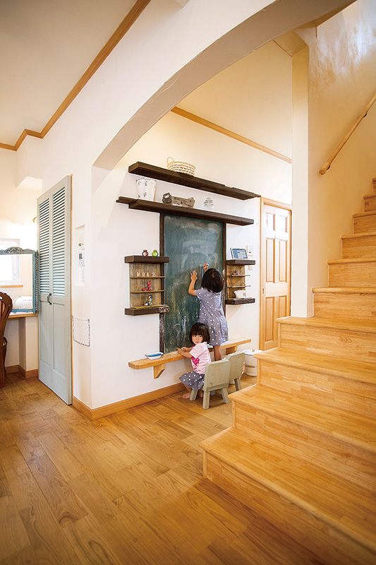 造形モルタルにエイジングを施し、程よくシャビーな外構がステキなNさま邸。住宅建築研究所の家の基礎や構造の確かさに惚れた、奥さまのお母さまの後押しでご夫妻と日野さんを引き合わせた。邸内にはそんなお母さまから贈られた家具やテーブルウエアがディスプレイされており、新築でありながら時間をまとったかのような風格を漂わせている。幼い娘さんたちの成長を見守れるように、1階にはいろいろな機能をもつ大空間のLDKを用意。その一角には壁に黒板を取り付けており、お子さんたちはママやパパに見守られつつ、大好きなお絵描きを楽しんでいる。ステンドグラスやアンティークのドアなど、古き良きものを巧みに取り入れるアイデアもお手本にしたい。2階のフリースペースには1階の気配がうかがえるようにアイアンの開放を設け、家族がどの場所にいてもゆるやかなつながりを感じられる。