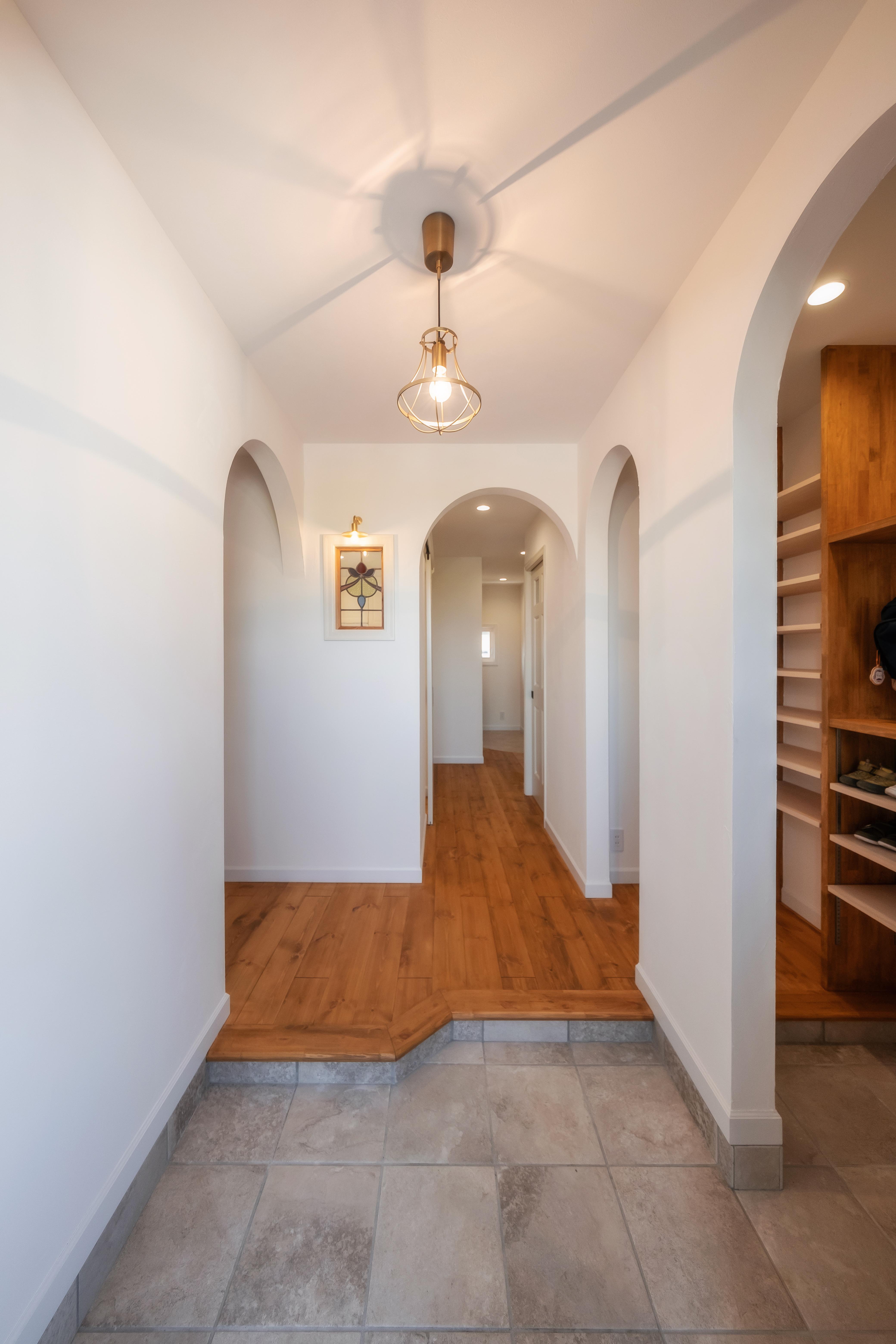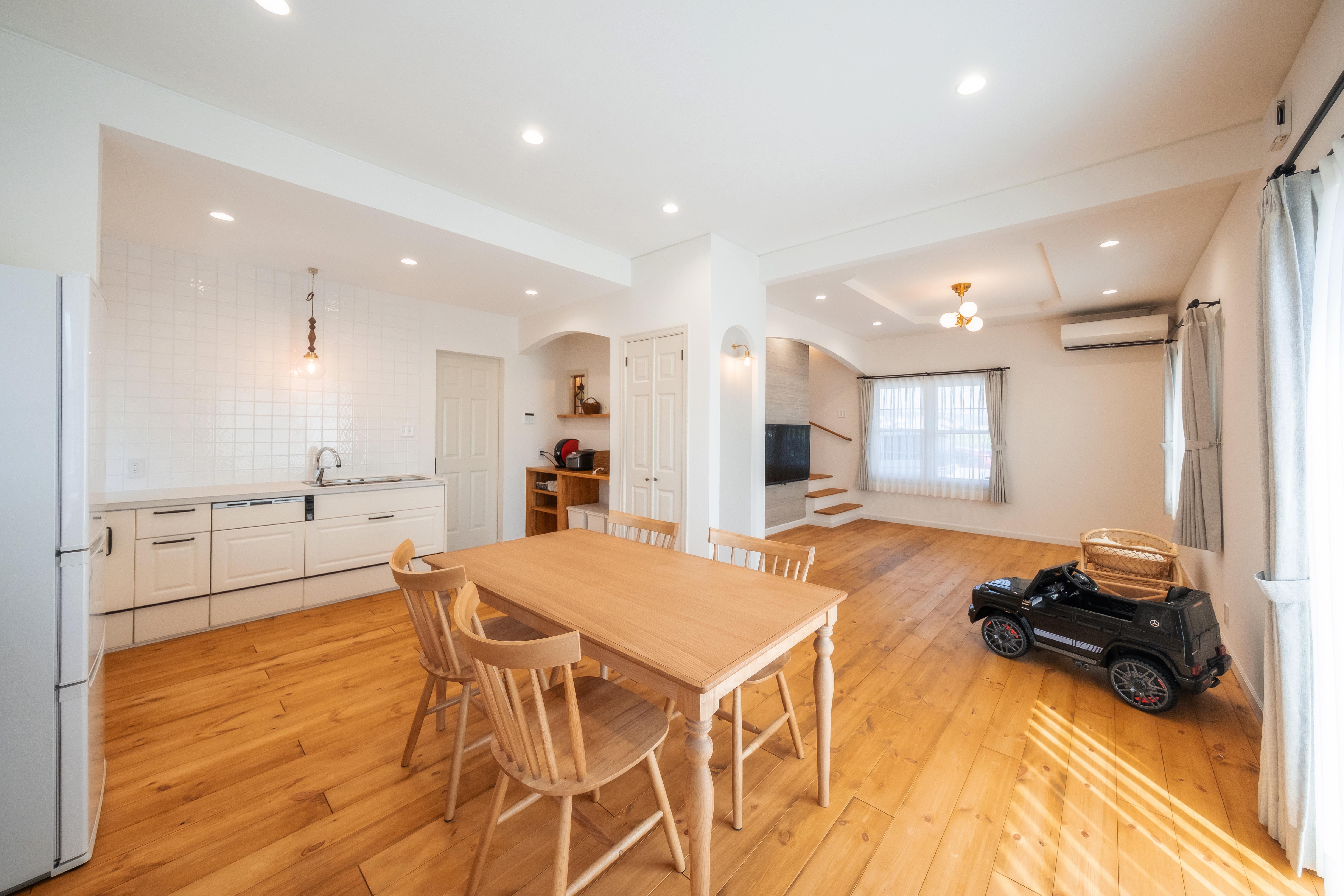 親戚が建てた住宅建築研究所の家に心惹かれ、「自分たちの家づくりもぜひ」と依頼を決めた施主ご夫妻。広くゆったりとしたLDKのオーダーに応え、日野さんが提案したのは、壁付のL字型キッチンを採用した開放感あるプラン。ダイニングキッチンに視線の抜けを生み出し、のびやかな暮らしを叶えている。壁面にはアーチ状の垂れ壁を設け、雑貨や小物をディスプレイできる工夫も。白い漆喰を基調に、淡いニュアンスカラーを差し込んだコーディネートは、ナチュラルながらもほんのり甘さを感じさせるやさしい空間に仕上がった。照明器具も各所で空間のイメージに寄り添いながらセレクトし、シンプルなインテリアのなかでさりげない存在感を放つ。