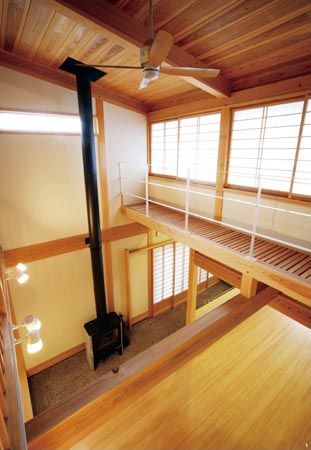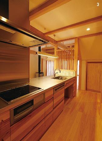 落ち着いた色合いの杉板とやわらかな表情の漆喰による外壁が、鮮やかなコントラストを描くS様邸。木や漆喰などの自然素材を使った住まいへのS様の憧れを、白石さんが最大限に形にした造りとなっている。四季折々の樹木が彩る美しい庭を抜け、邸内に一歩足を踏み入れれば、迎えるのはどこか懐かしい雰囲気の土間敷き玄関。木の香りが心地よい室内には“広がりの間取り”を採用。吹き抜けから自然の光が降り注ぐリビングを中心とした、縦にも横にも敷居を設けないひとつながりの空間が、家族の団らんをやわらかく包み込む。 無垢材を使った梁や野地板を隠さず表に出した吹き抜けに見られる「あらわし」の架構美も、S様が白石さんに建築を依頼した理由のひとつ。あらわしはその美しさだけでなく、無垢の木を用いることで、木の調湿作用が存分に発揮されるのも大きな特長。呼吸する木と土壁が、室内を四季の気候に応じて過ごしやすい空間へと調整する。木、風、光…あらゆる自然とともに在る心地よさを感じられることも、この家の魅力といえるだろう。