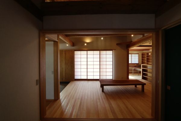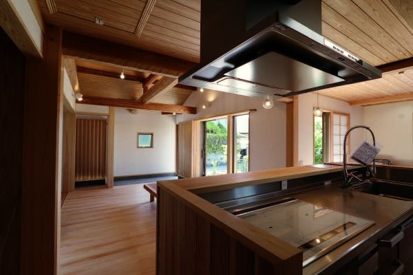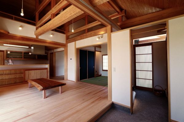 Uさま邸は、外壁をすべて焼杉板張りとした、ロフトのある平屋の家。邸内から屋根を吹き抜け状に見せられるのは、平屋ならではの贅沢な仕様だ。「あらわし」となった松と杉の梁や桁の一部は、眺めるほどに満足につながっていく。この建物は愛媛県産材と地域の大工がつくる「チルチンびと仕様」となっており、厳しい基準をクリアしたサステイナブル(持続可能)な住まい。さらに間取りや意匠にもさまざまな工夫が行われている。玄関を入ってすぐの土間リビングでは、気兼ねなくお客さまを出迎えることが可能。建具で仕切り、可変性を持たせた居室は、先々の暮らしやすさも約束する。本を愛する施主さまのために、壁面いっぱいの大型の本棚を造作。こうした暮らしやすさへの心遣いは、住み手に大きな満足と豊かさを与えてくれる。