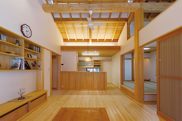 無垢材や漆喰を使い、しっかり断熱施工を施した平家。邸内には風の通り道があり、夏も涼しく、心地よさ満点。延床面積約25坪、そこには広がりと温もりがあります。