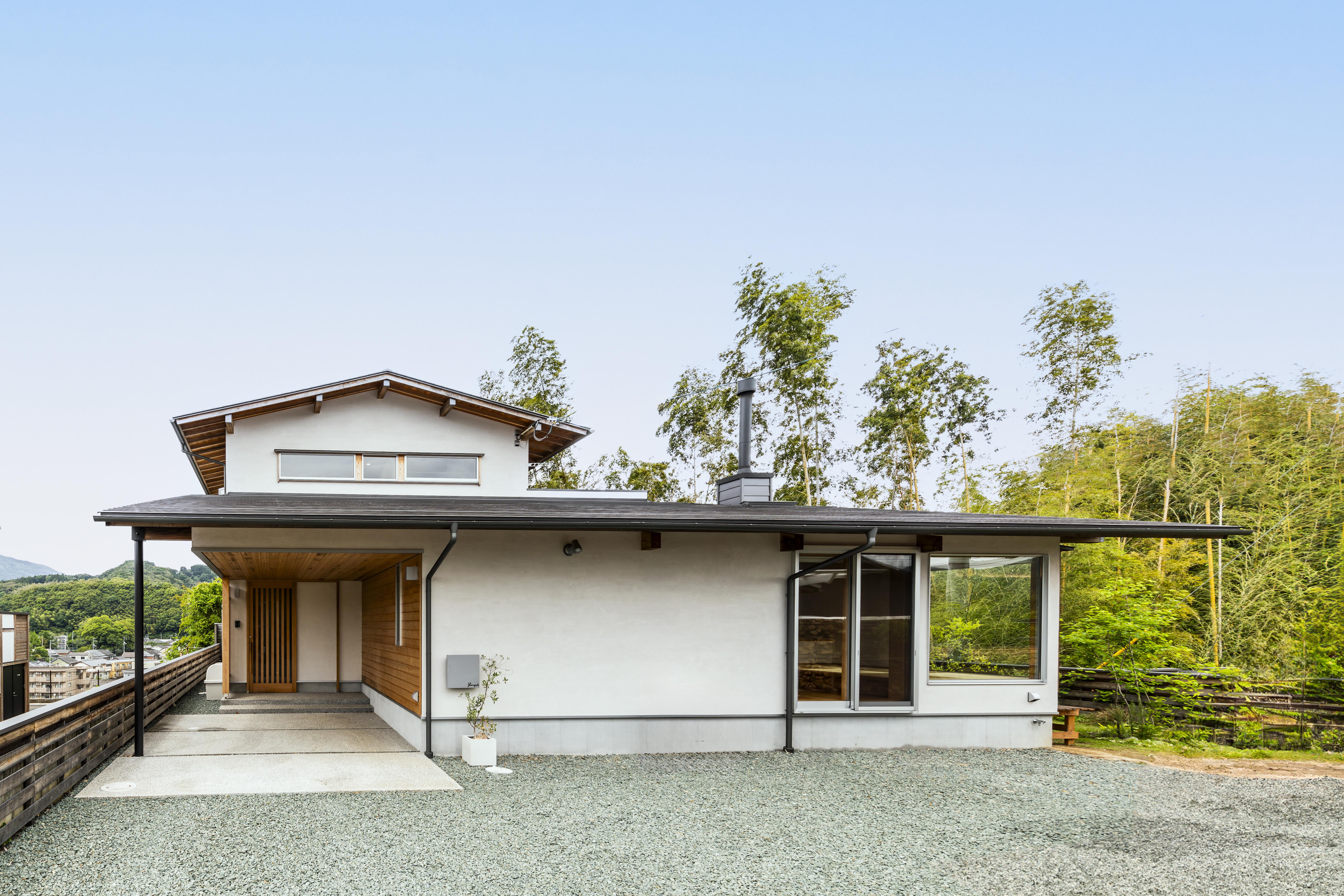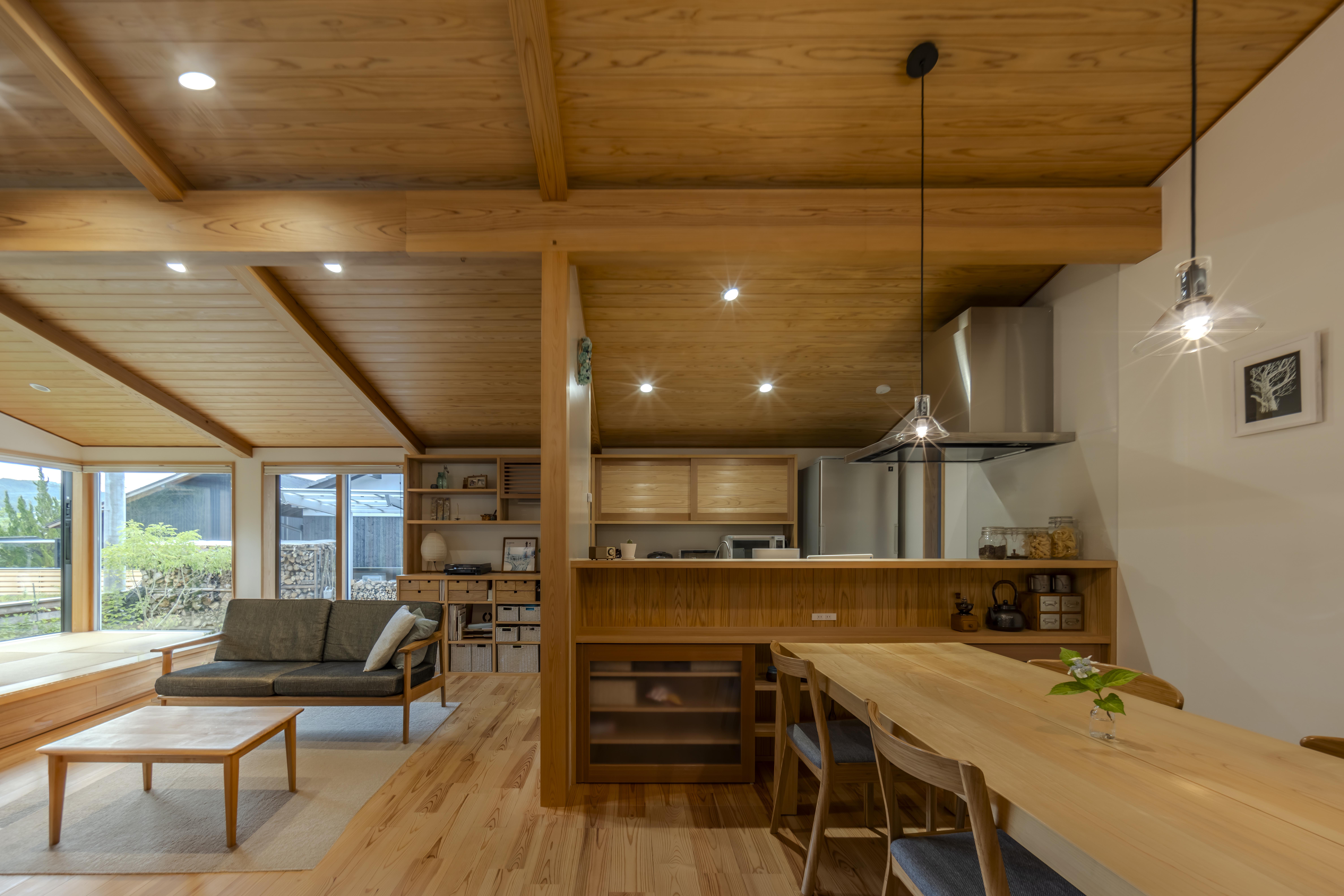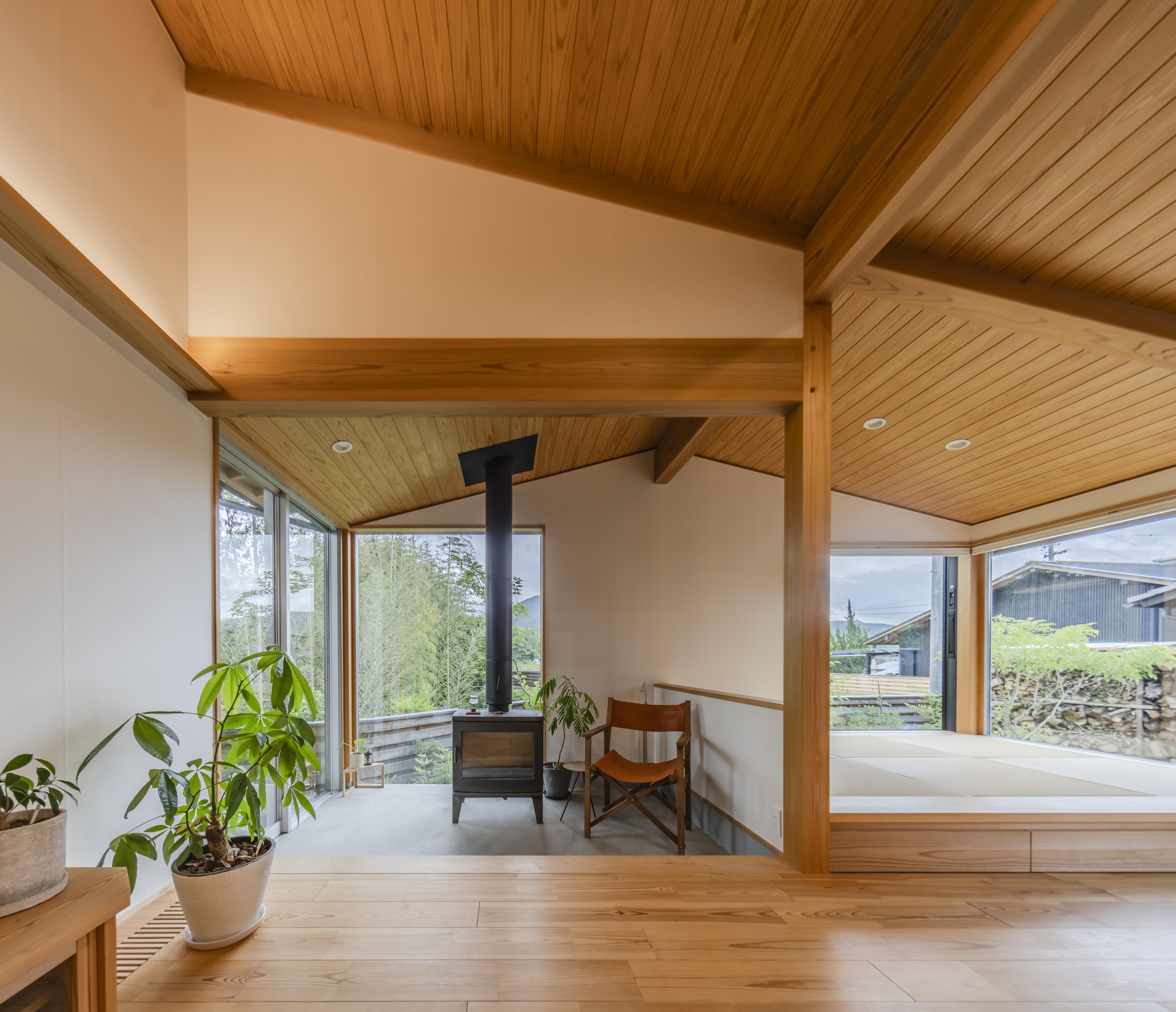 ご夫妻が住まいに求めたのは、眺望、日当たり、風の通り。加えて、薪ストーブや対面のダイニングキッチン、植物が似合う空間といった具体的な要望が伝えられた。プランは、北東の竹林をリビングの借景とするため、その方角に大きくL字の開口を取り、窓際を土間にして薪ストーブを設置した。その隣には小上りの畳コーナーを設け、南の角に同じくL字の開口を確保。北東南の3面開口で豊かに光を導いた。