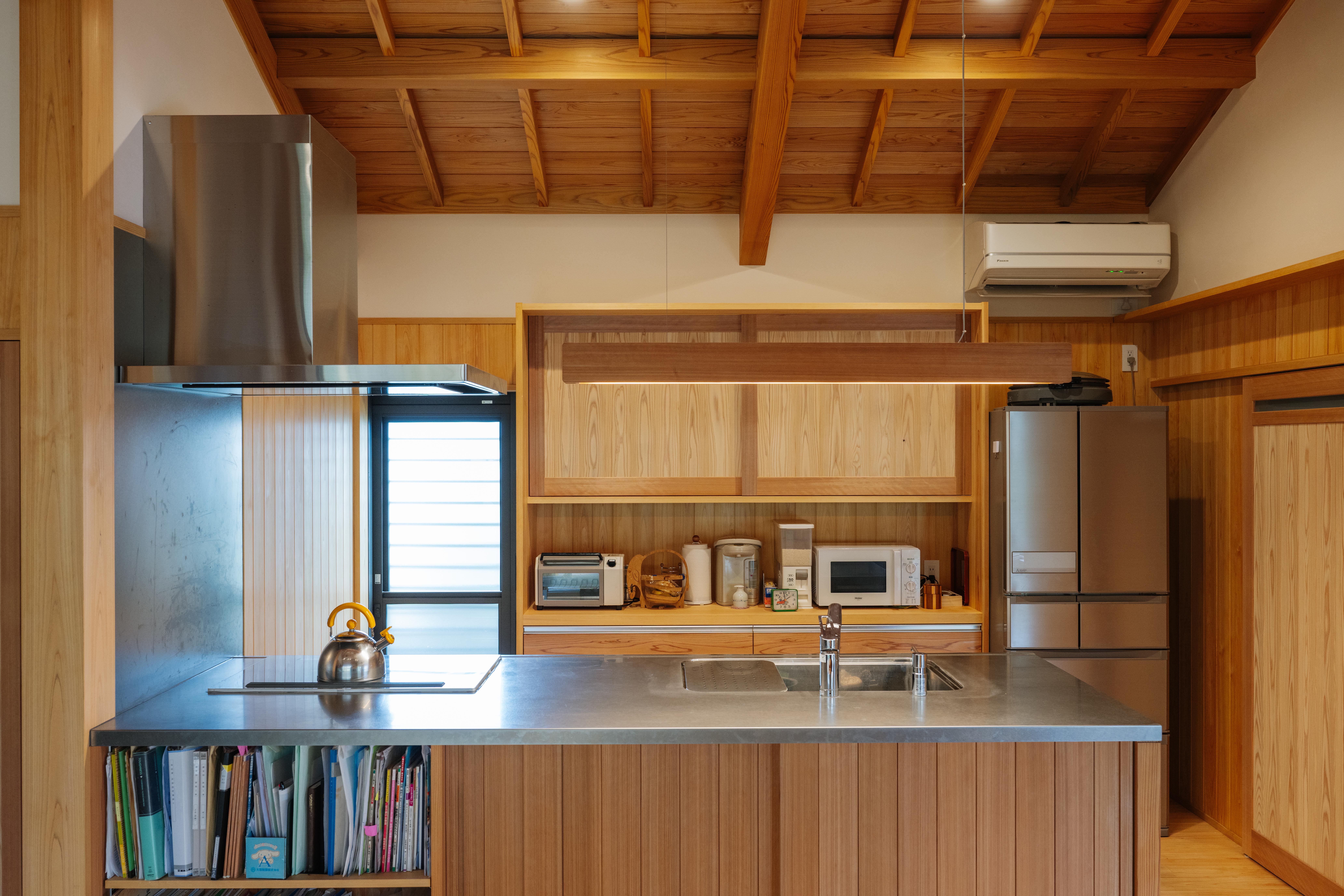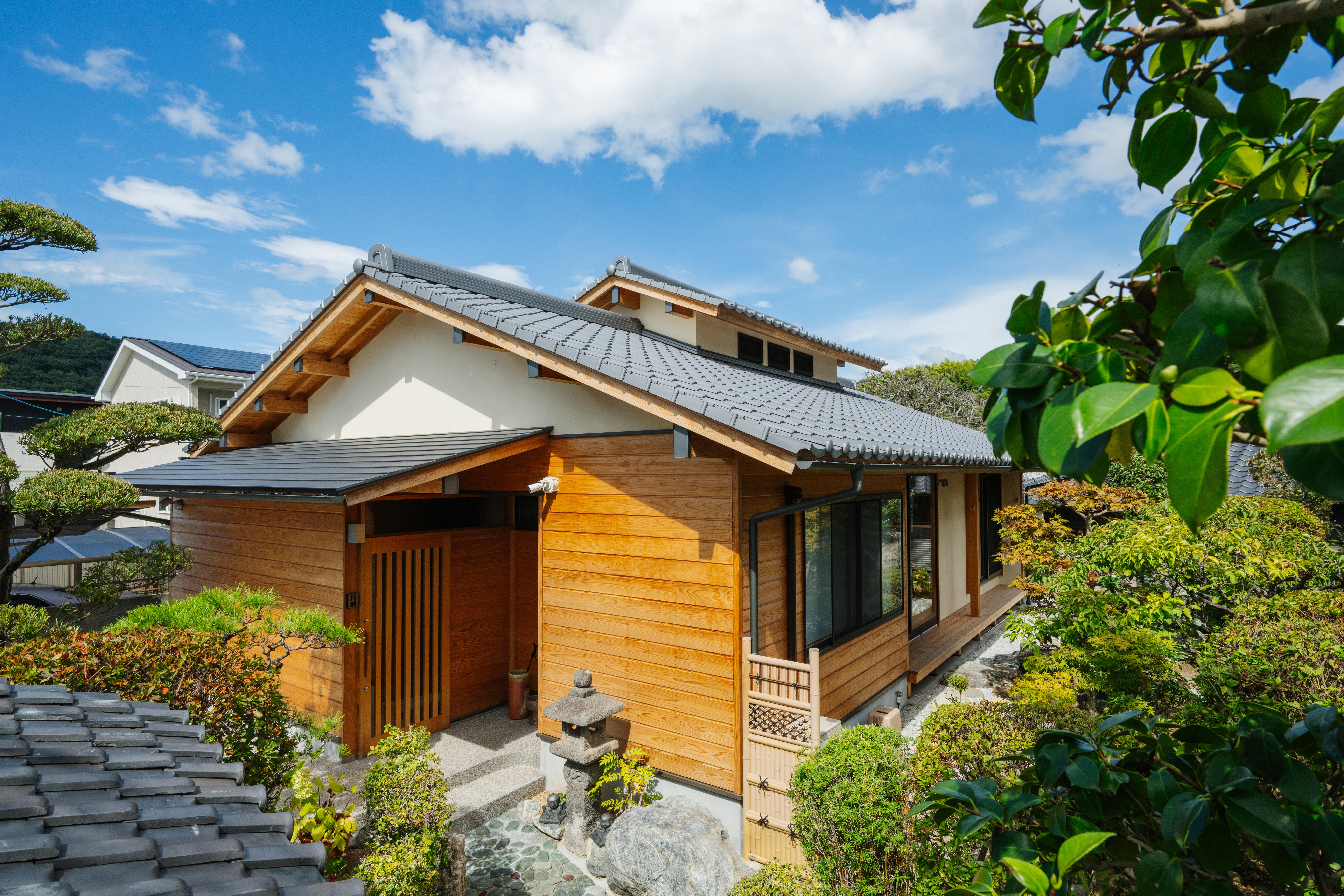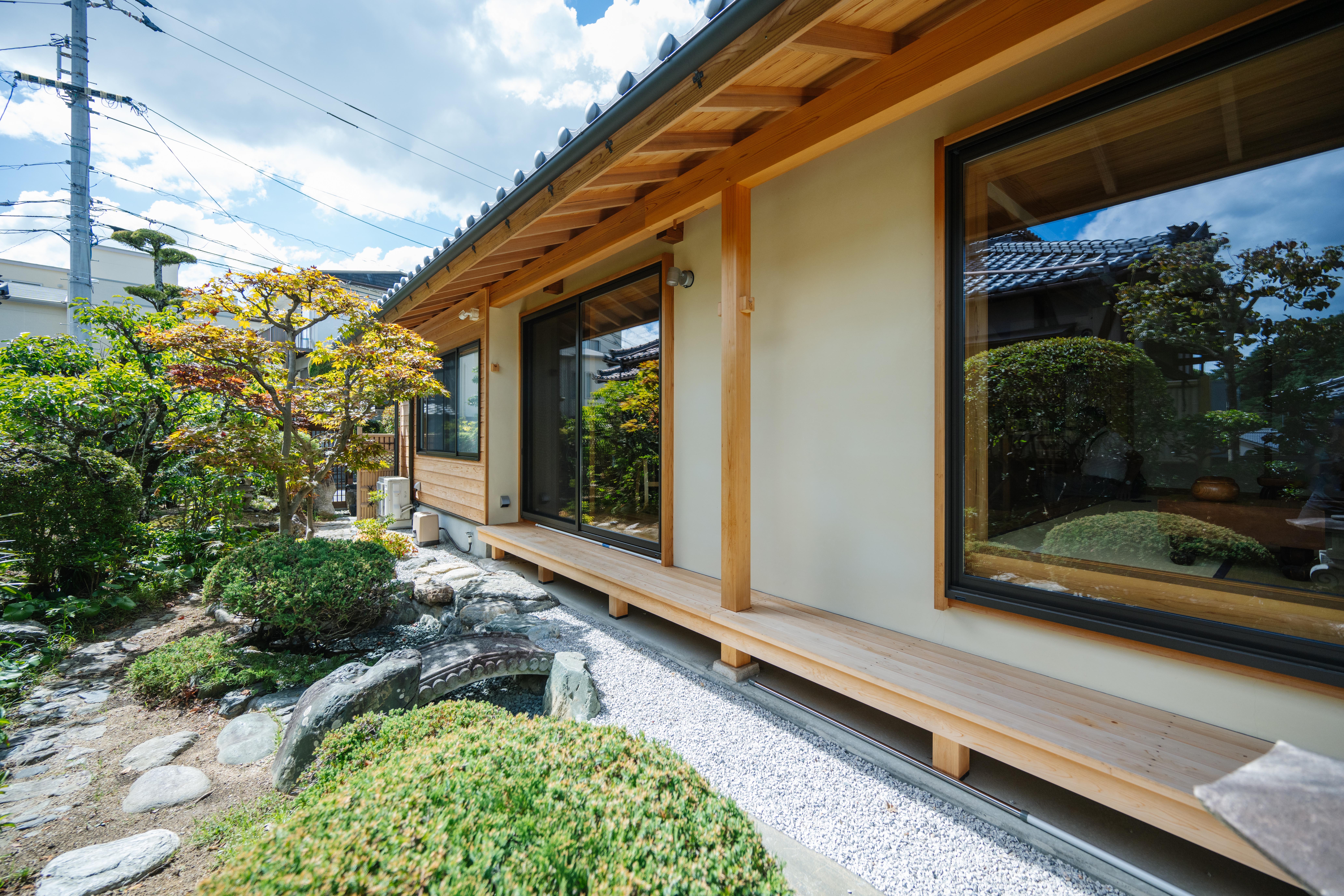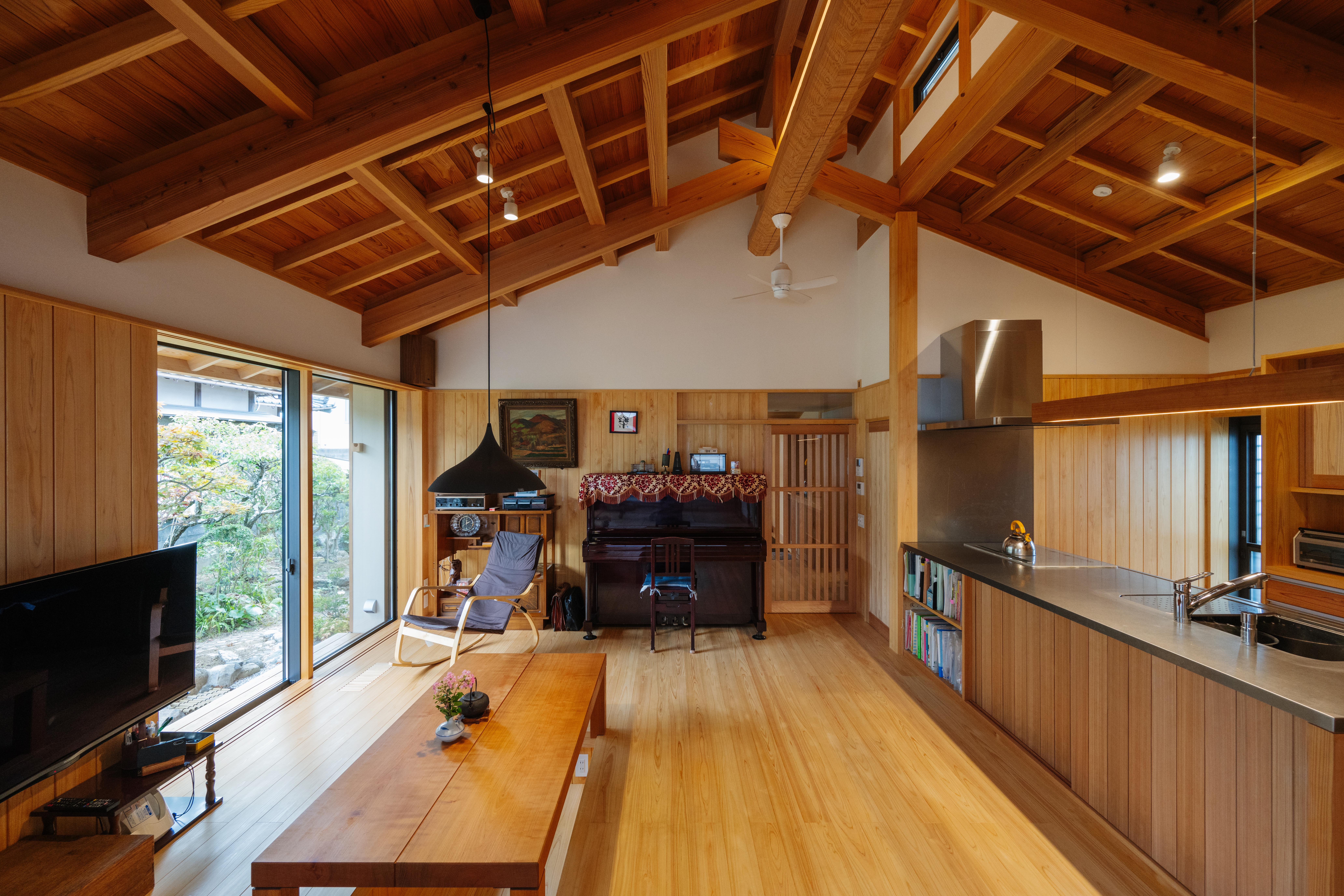 ご夫妻が住まいに求めたのは、生活動線をコンパクトに描いた平屋であること、T様のお母様が大切にされていた日本庭園をできる限り残すこと。そこで、敷地の南側に位置する庭園を借景とし、リビング、小上がりの和室、寝室を配置。それぞれに大きな開口をとり豊かな眺めを実現しました。LDKは堂々たる梁や天井の木材をあらわしとし、格別な開放感を演出。切妻屋根の中央に設けた越屋根の窓からやさしい光が降り注ぎます。また寝室と洗面室、浴室、トイレの水まわりは最短距離に置き、扉をすべて引き戸とすることで車いすでもスムーズに行動できるよう整えました。