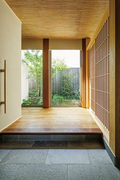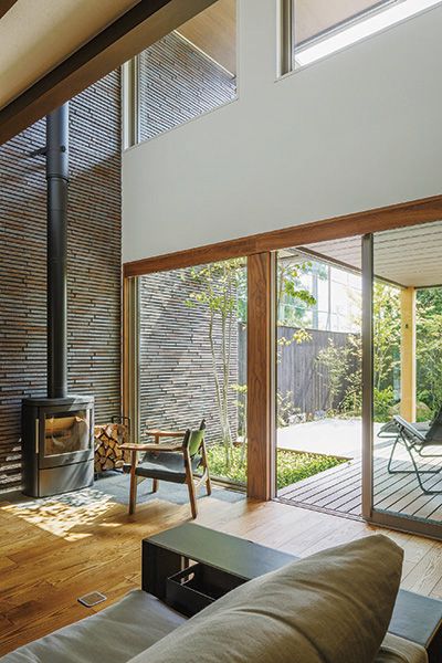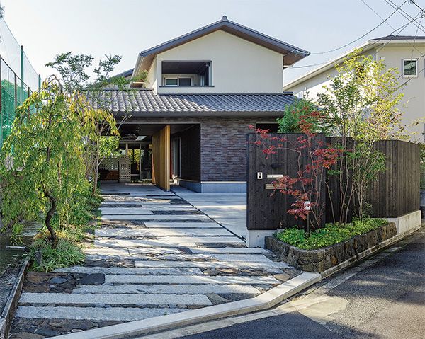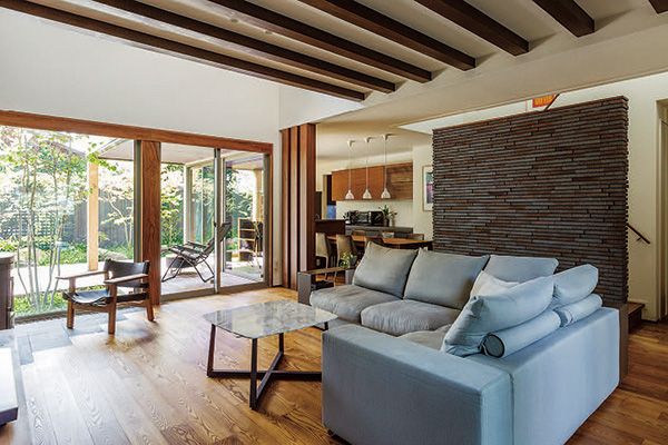 市街地にほど近い閑静な住宅地。長い年月を刻んできた街並みに凛とした切妻屋根のシルエット、伝統的な波型瓦、穏やかな風情の吹き付け塗装の外壁と、気品漂うMさま邸が調和する。一般的には四角や長方形の土地が好まれるが、ご主人が選んだのは南北の細長い敷地。そこで、南北を貫く抜けに注目。「高い塀をめぐらせて閉鎖的な住まいにしたくない」と、道路に面する北側から駐車スペース、アプローチ、中庭、リビング、主庭と奥に進むに従ってプライベート空間が保たれた設計に。また「森のなかにいるような感覚で暮らしたい」とご主人の希望で南北に庭を配した。住まい全体がつながる伸びやかさも魅力の一つ。リビングを中心に、吹き抜けや階段を介して光や空間の広がりが感じられ、家族の気配が伝わってくる。
