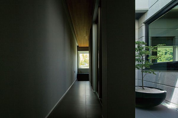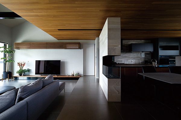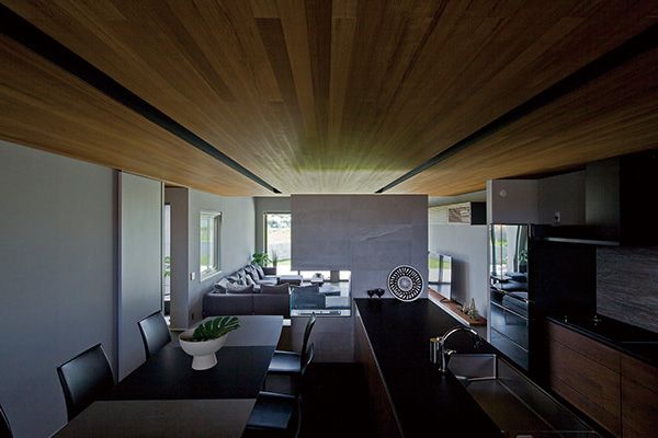 豊かな緑に囲まれた郊外の住宅地に見えてくるミュージアムのような外観。目の前に山並みが広がる敷地、風景を生かして建築されたKさま邸は、周辺環境を意識した平屋に。リビングへ足を踏み入れると、オープンな空間にお子さんたちのスタディコーナーからダイニング、リビングへと、ステップを設け段々と下りてくる間取りに。そこからゆるやかにつながるよう、緑が映える庭の先に周囲の自然が眺められ、内側から外側へ広がりをもたらした。またスタイリッシュさだけではなく、“住みやすさ”にこだわったのも大きな特徴。リビングから奥へ向かうと、子ども部屋から洗面所など回遊式の生活スペースが設けられ、プライベイトが守られた。収納力も抜群である。スタイリッシュさと暮らしやすさを叶えた住まいは、自然との対話を楽しめるモダンハウスに仕上がった。
