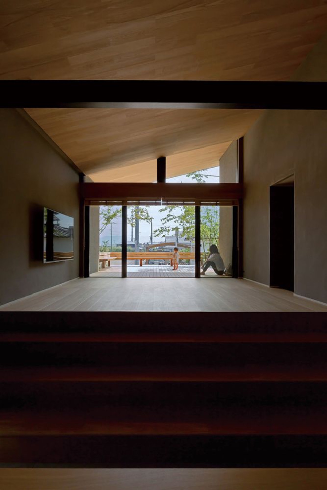 が外のデッキへ向かって伸びやかに広がる。個室のスペースは最小限とし、過