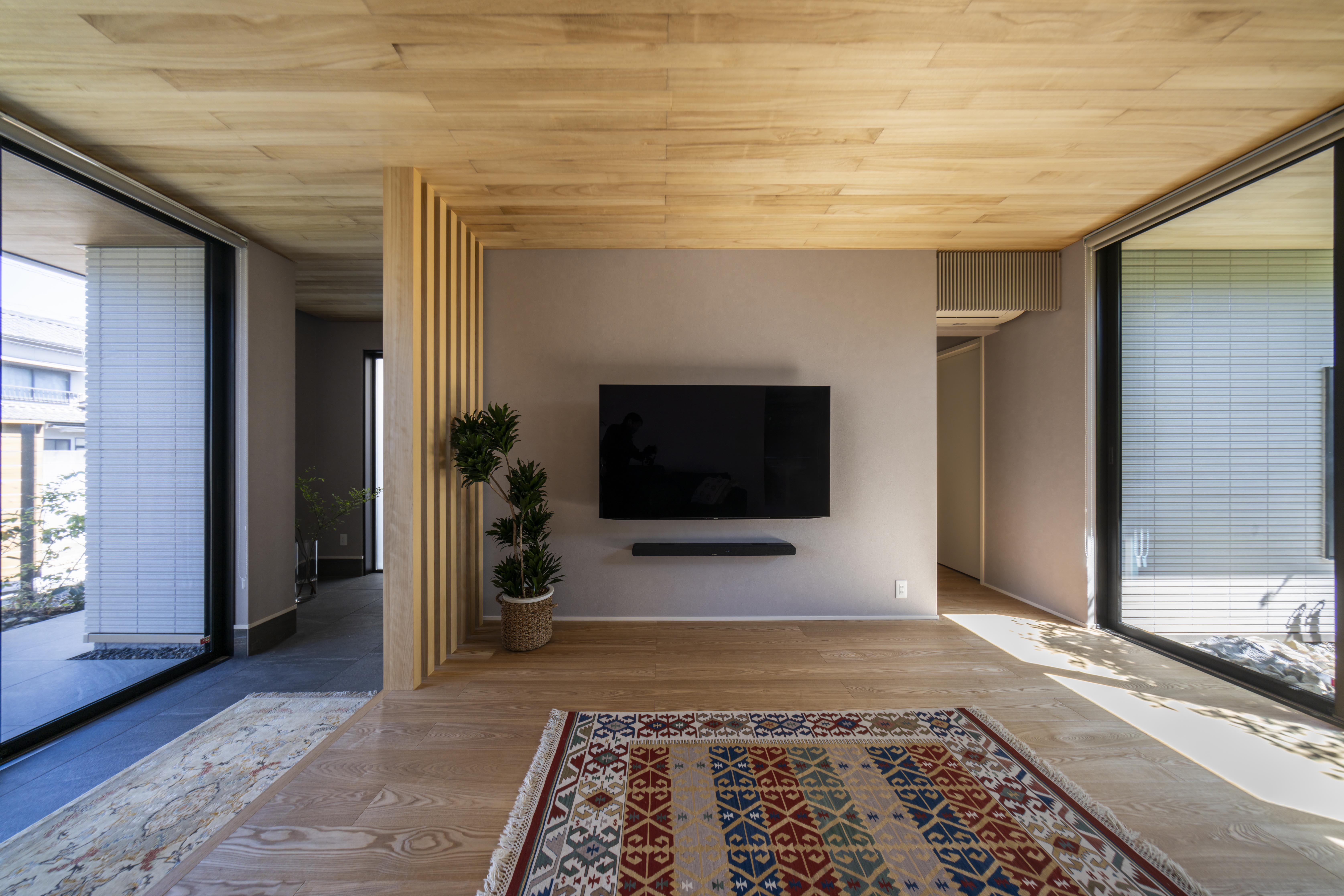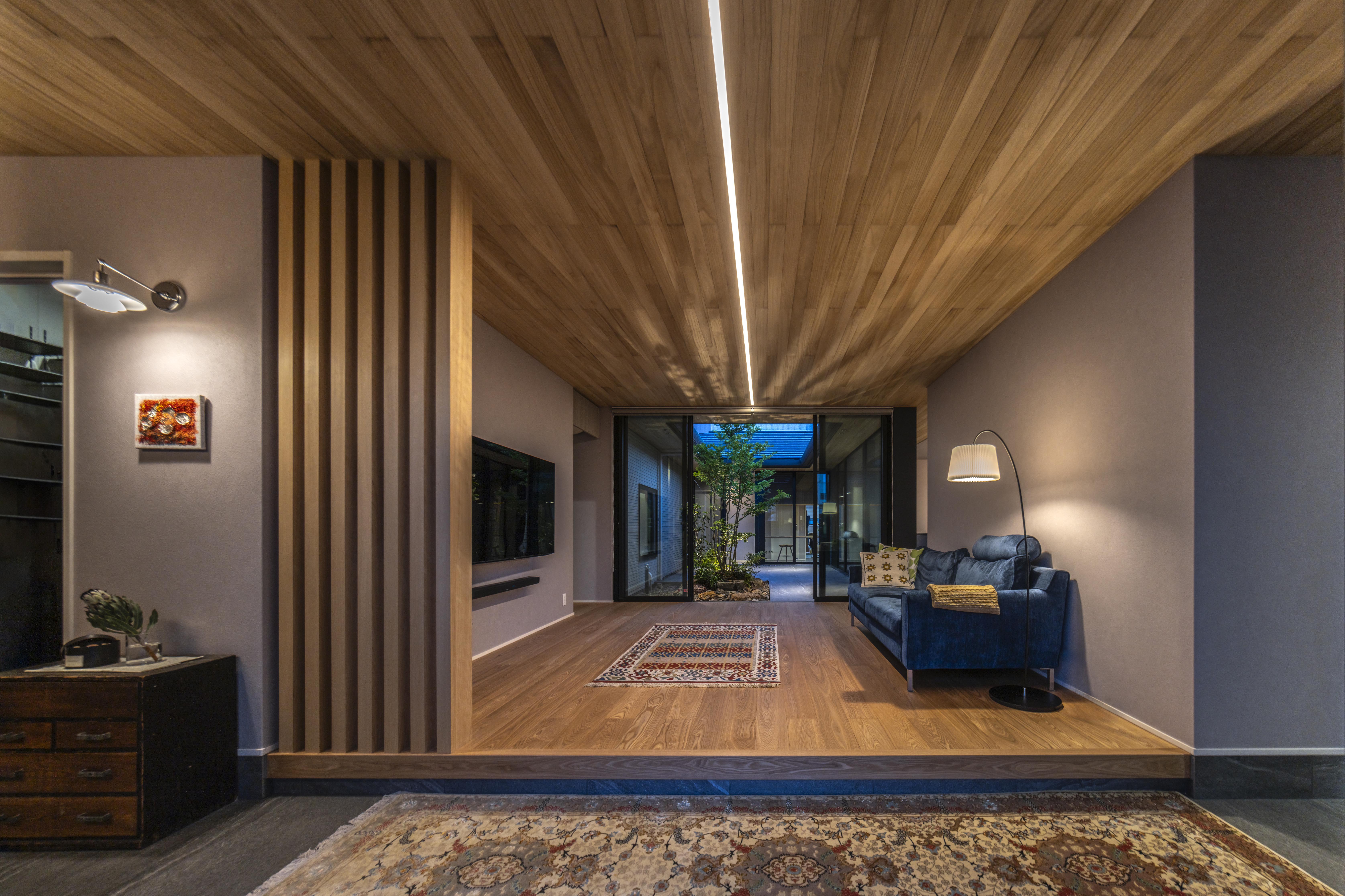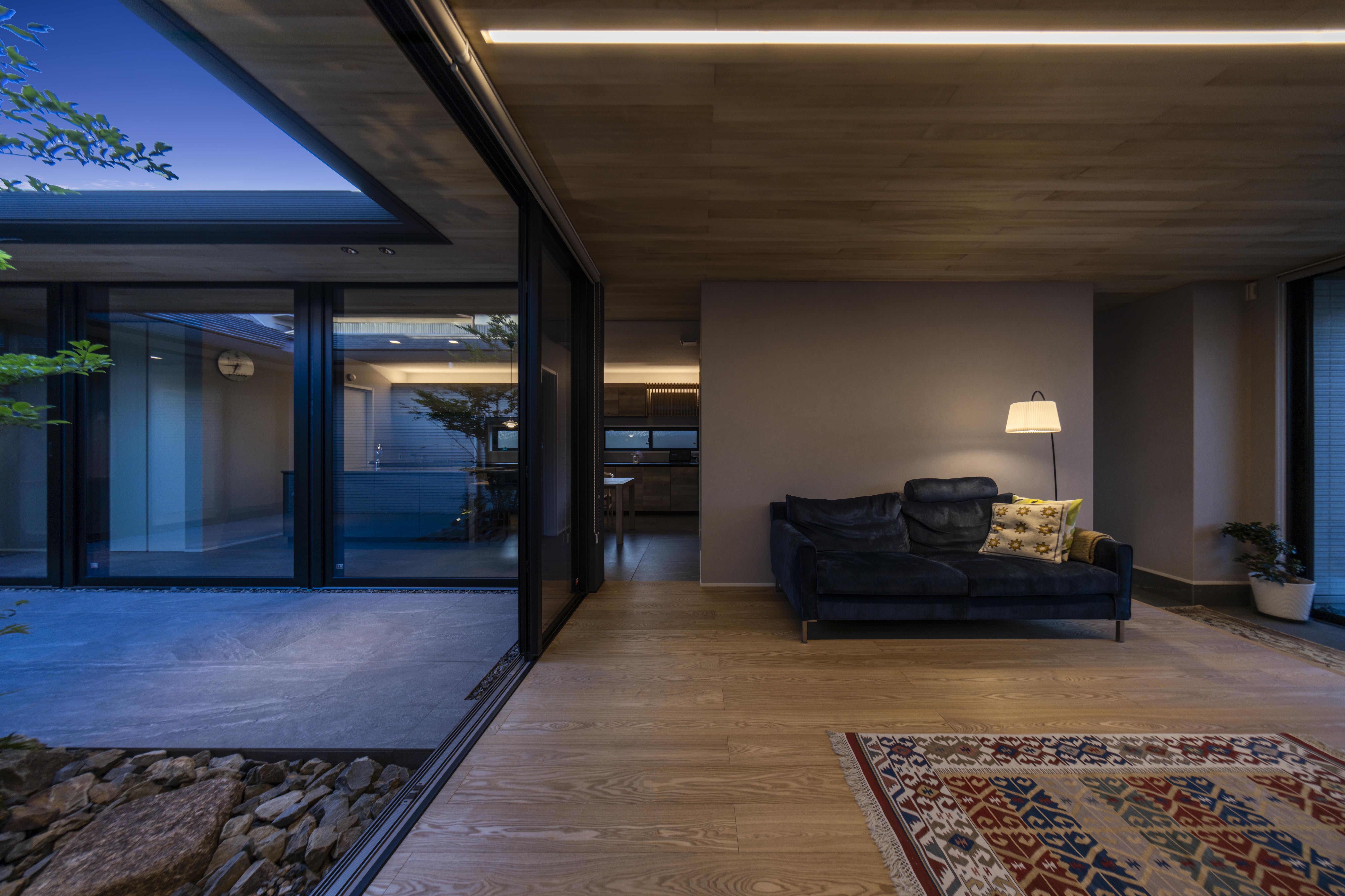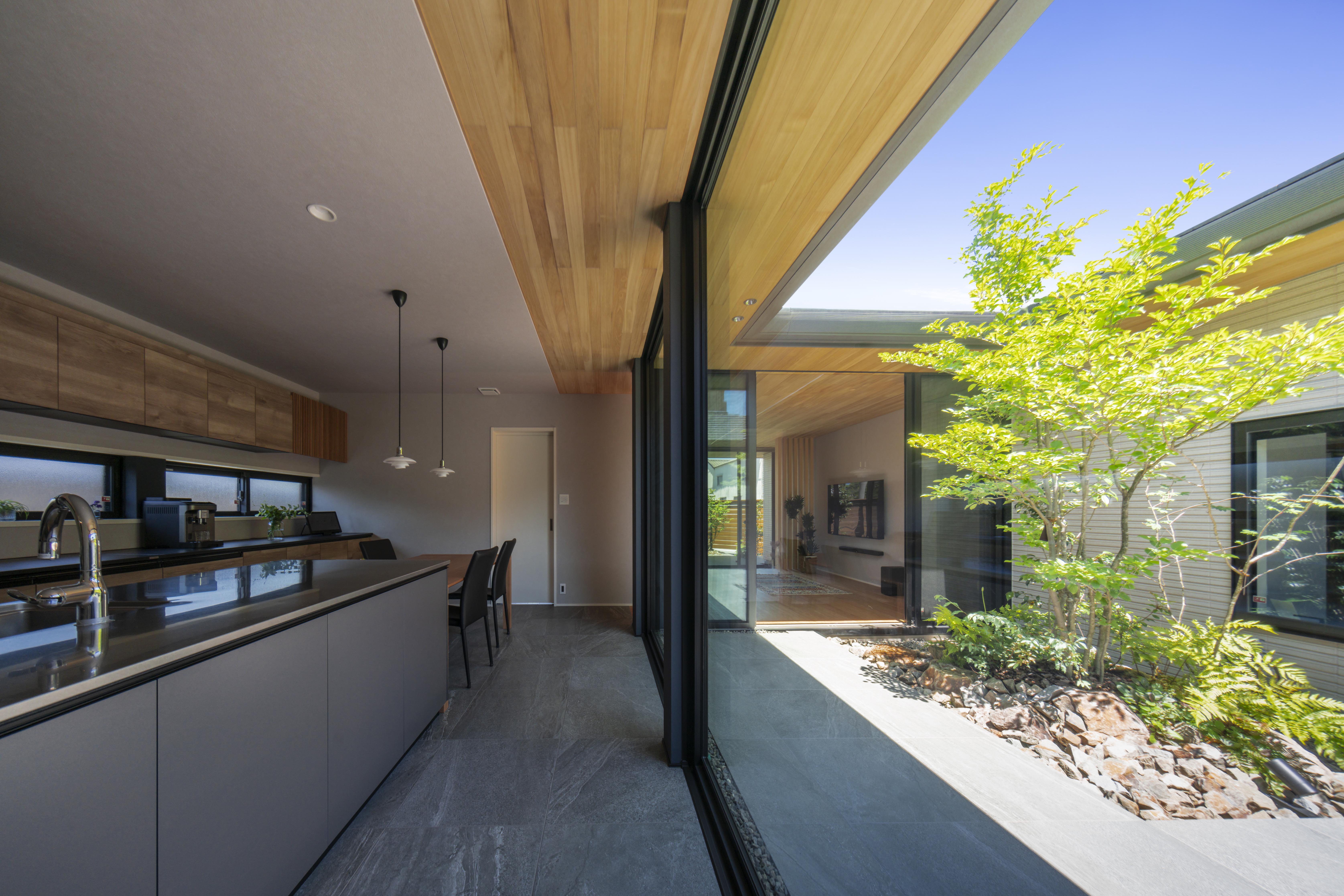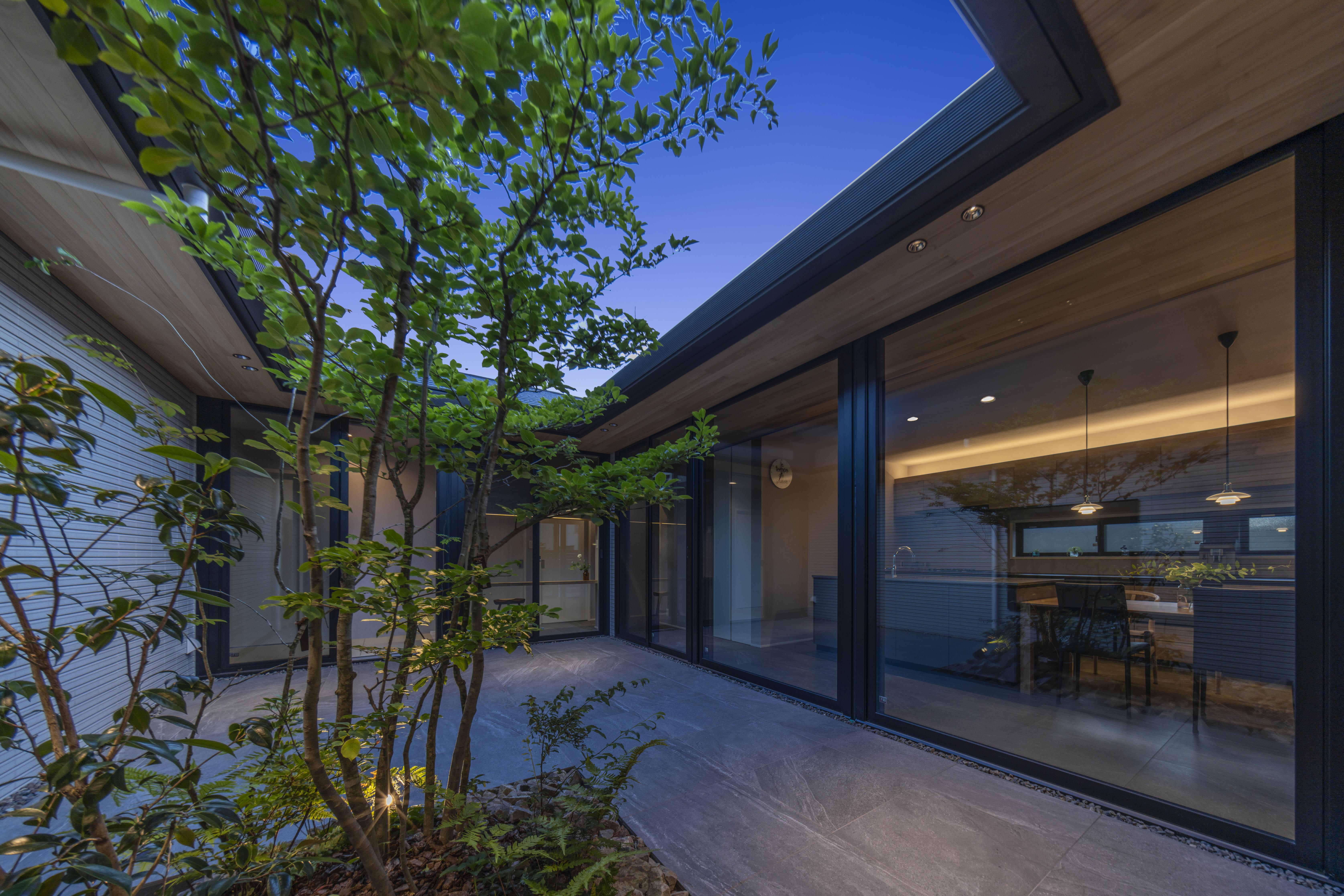 浮遊感のあるアプローチ階段と道行く人の目も楽しませる庭が、やさしく迎え入れてくれる邸宅。まるで船首のような格子を設え、優雅ささえ感じられる。住宅街という立地にありながら一歩足を踏み入れると、静寂に包まれた空間が広がる。施設や事務所に囲まれた環境だったことから中庭を設け、風や光をたっぷり取り込むようプランニングされた。中庭を囲むロの字型の間取りは、LDKからの開放感も抜群。開口部を開け放てば、セカンドリビングのような中庭が広がり、外ごはんやティータイムを楽しんだり、お酒を嗜んだりと、完全に家族だけの時間が楽しめる。朝から昼、夕刻、夜と季節や時間帯によって移り変わる表情は魅力的で、自宅で過ごす豊かさを改めて実感している。