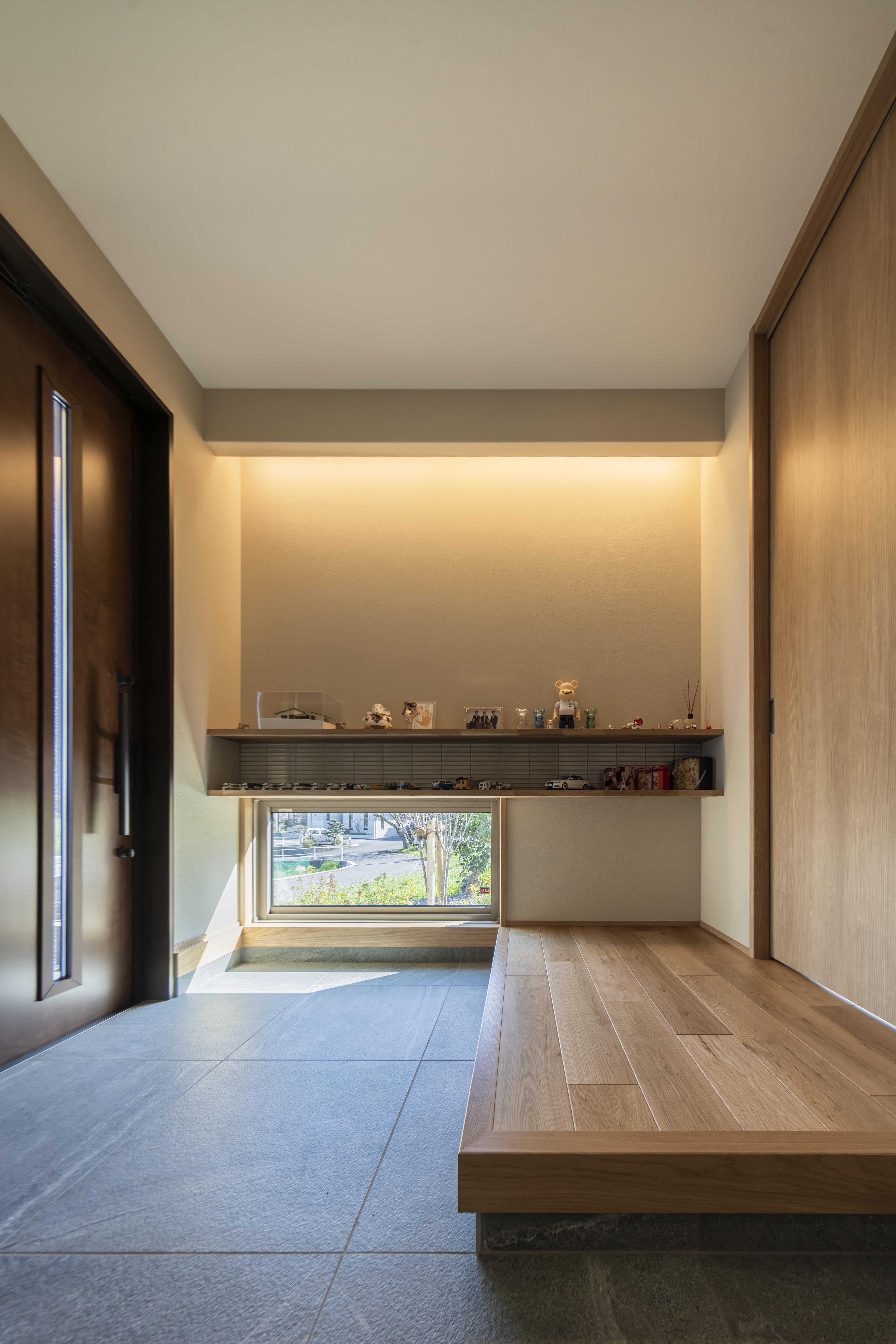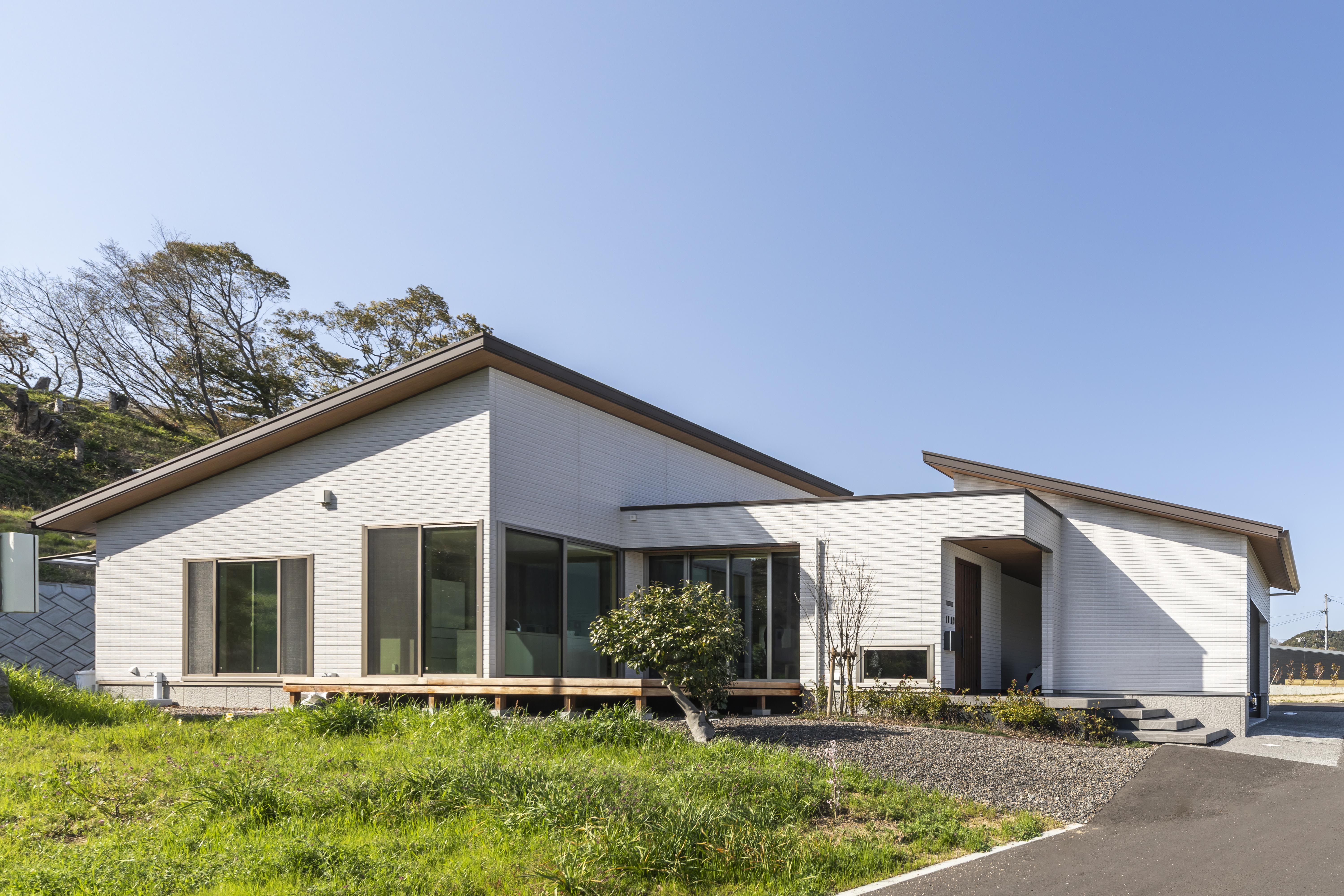 自然に抱かれるように小高い丘に建つ邸宅。清々しい風が通り抜け、豊かな緑に囲まれた絶好のロケーション。家を建てることにしたのは、一邸目のほど近く。最初の家は強いこだわりがなかったが、今回は「この自然とおおらかに暮らすこと」が家づくりに対するご夫妻のモチベーションになった。この環境を最大限に活かすため、ダイニングキッチン、リビング双方に大開口を設置。ウッドデッキ越しの光景は心が晴れ渡る気持ち良さが得られ