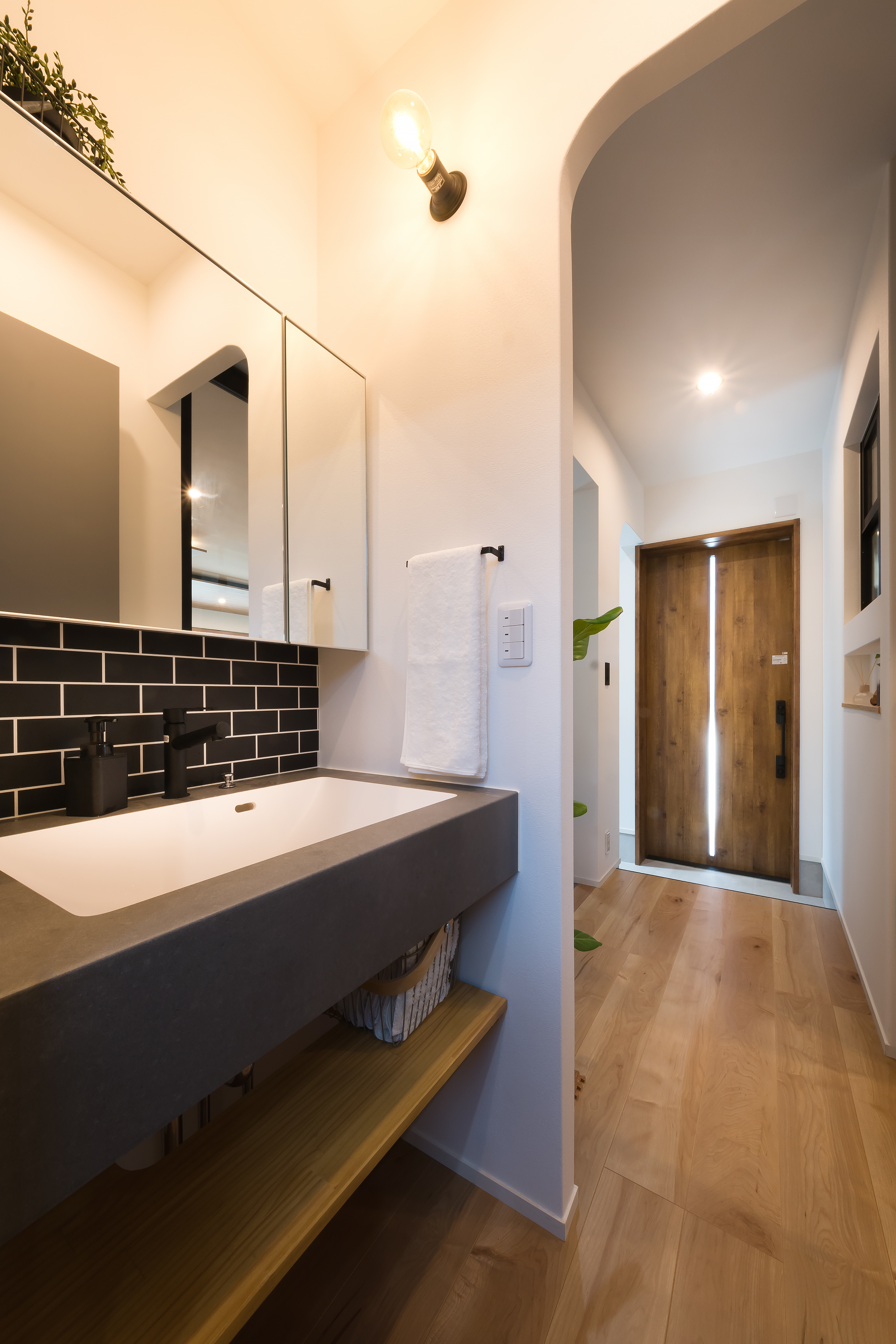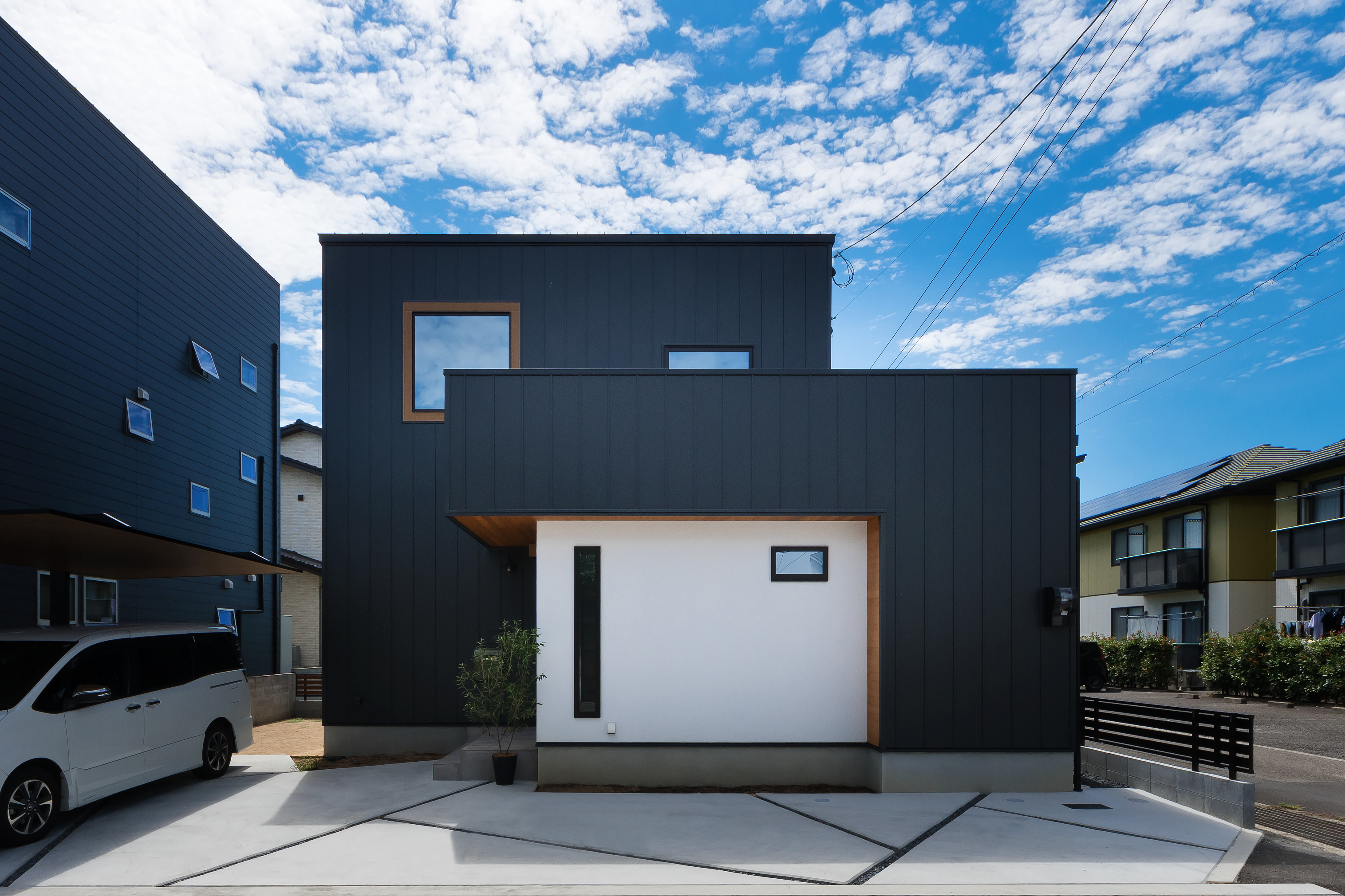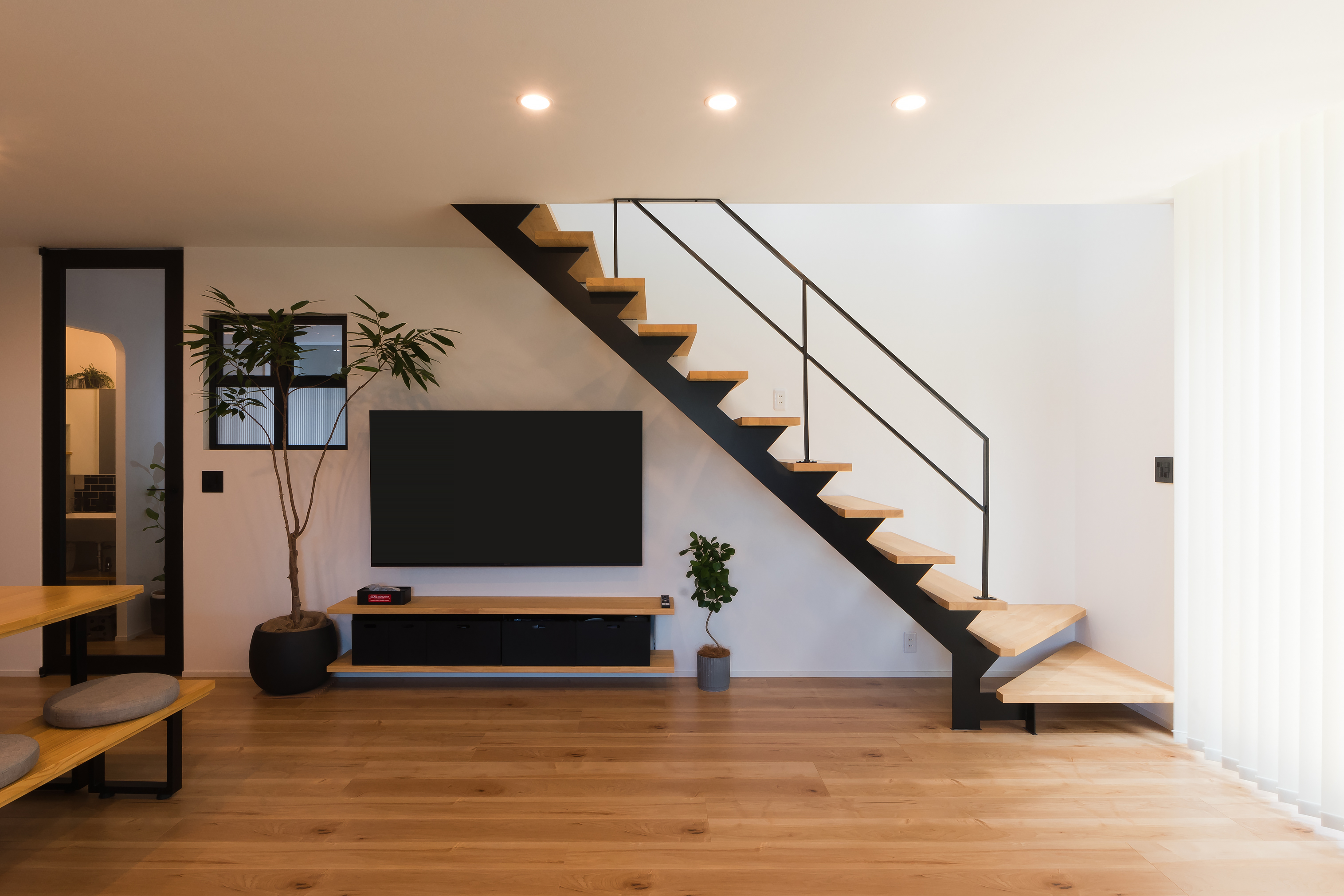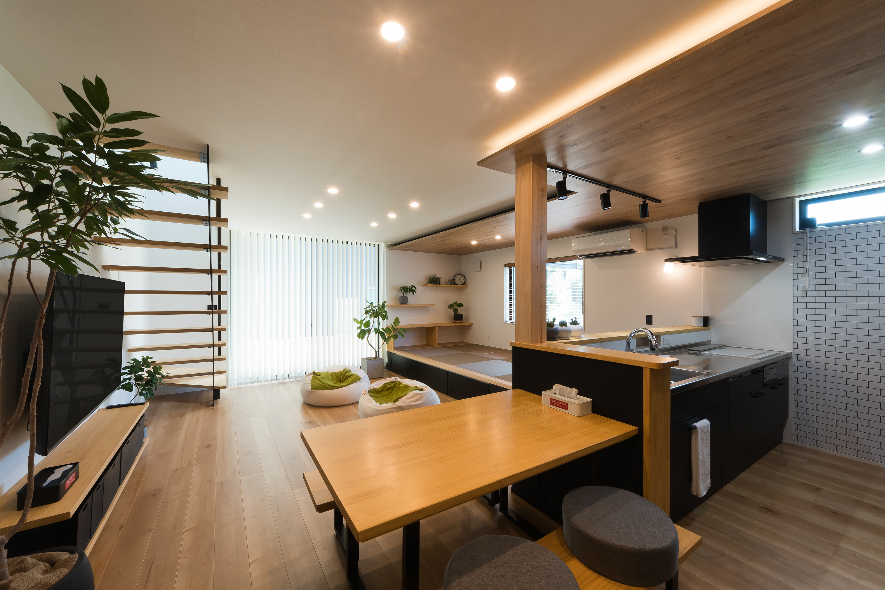 木のあたたかみと無機質なアイアンという質感の違いが映えるT様邸。高気密・高断熱、耐震等級3を取得した長期優良住宅です。キッチンカウンターやハイドア、内窓、アイアンのスケルトン階段などにお施主様の好きなカラーだという黒を取り入れてスタイリッシュに。キッチンと小上がりは木目の折り下げ天井でつながりを演出しました。玄関には土間収納を造作。土間収納からサッと上がれる動線も便利です。