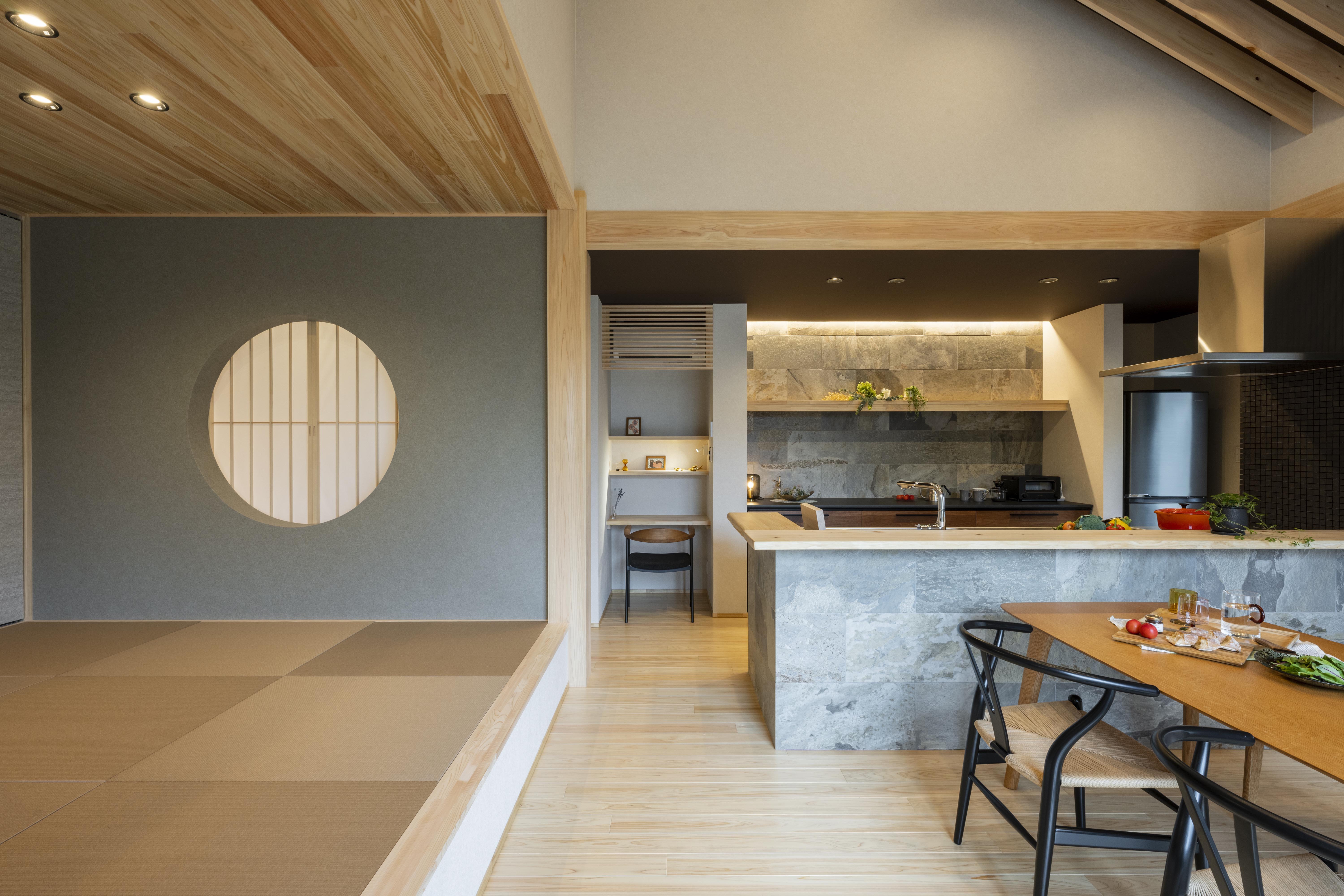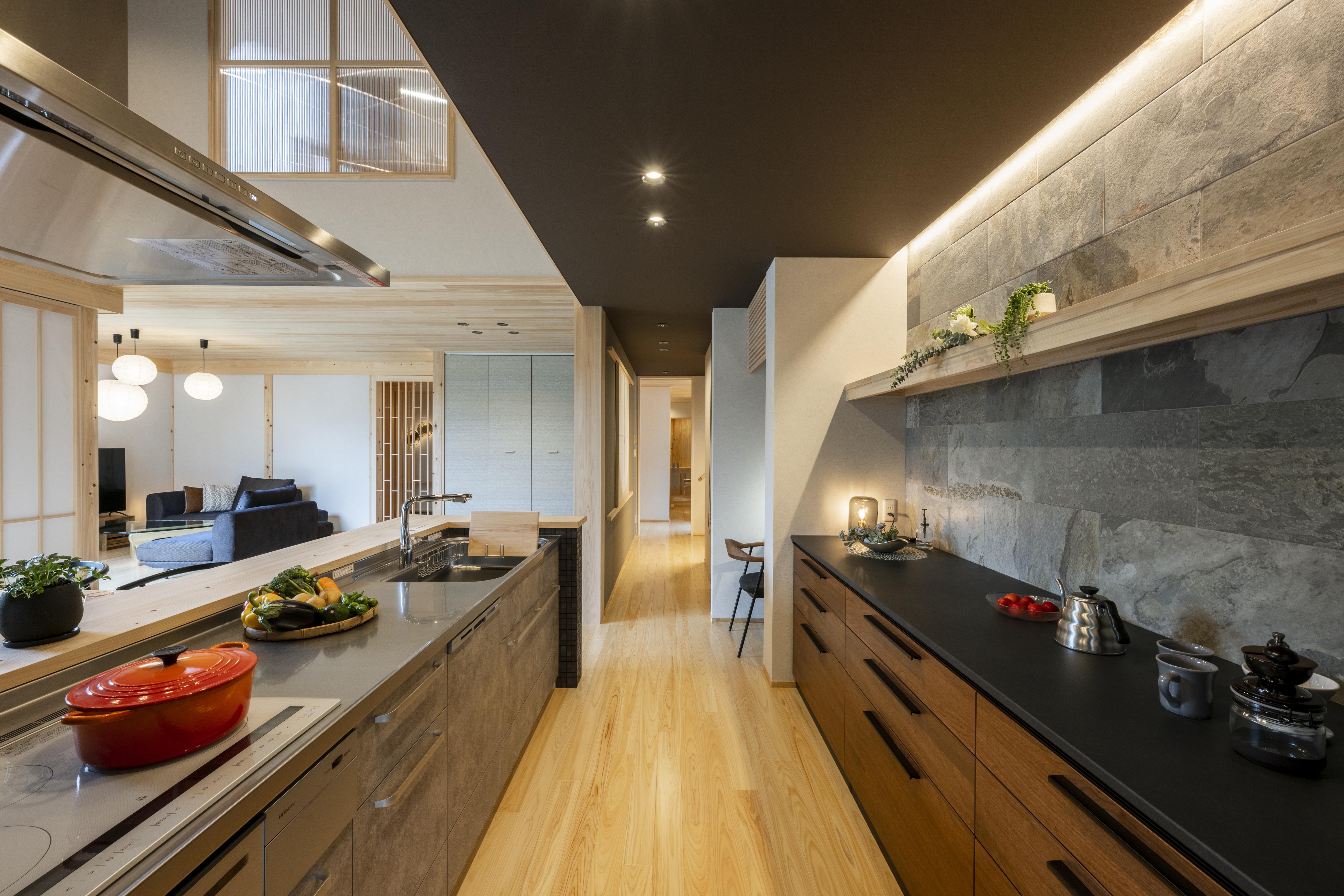 無垢檜の香りに包まれたLDK。床や勾配天井の羽目板も檜材を使用しています。檜が香る贅沢なモダン和風の邸宅は、シャープなラインが際立ち、心地よい光と風をいつも身近に感じられます。