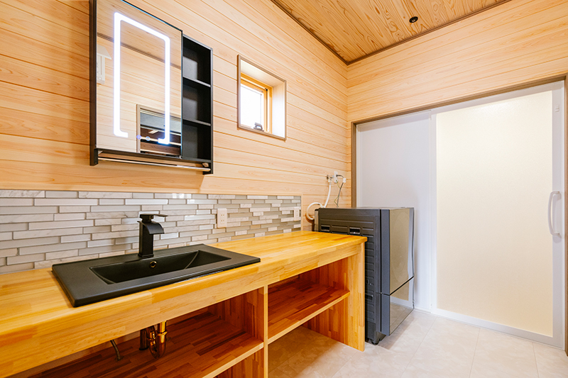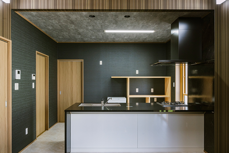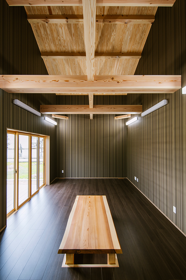 木をふんだんに使った吹き抜けのある平屋、目で見る、耳で木の伸縮を、手で木の暖かみを、鼻で木の香りを感じながら、口で毎日の料理を堪能する、家の中に居ることで、五感を常に刺激します。