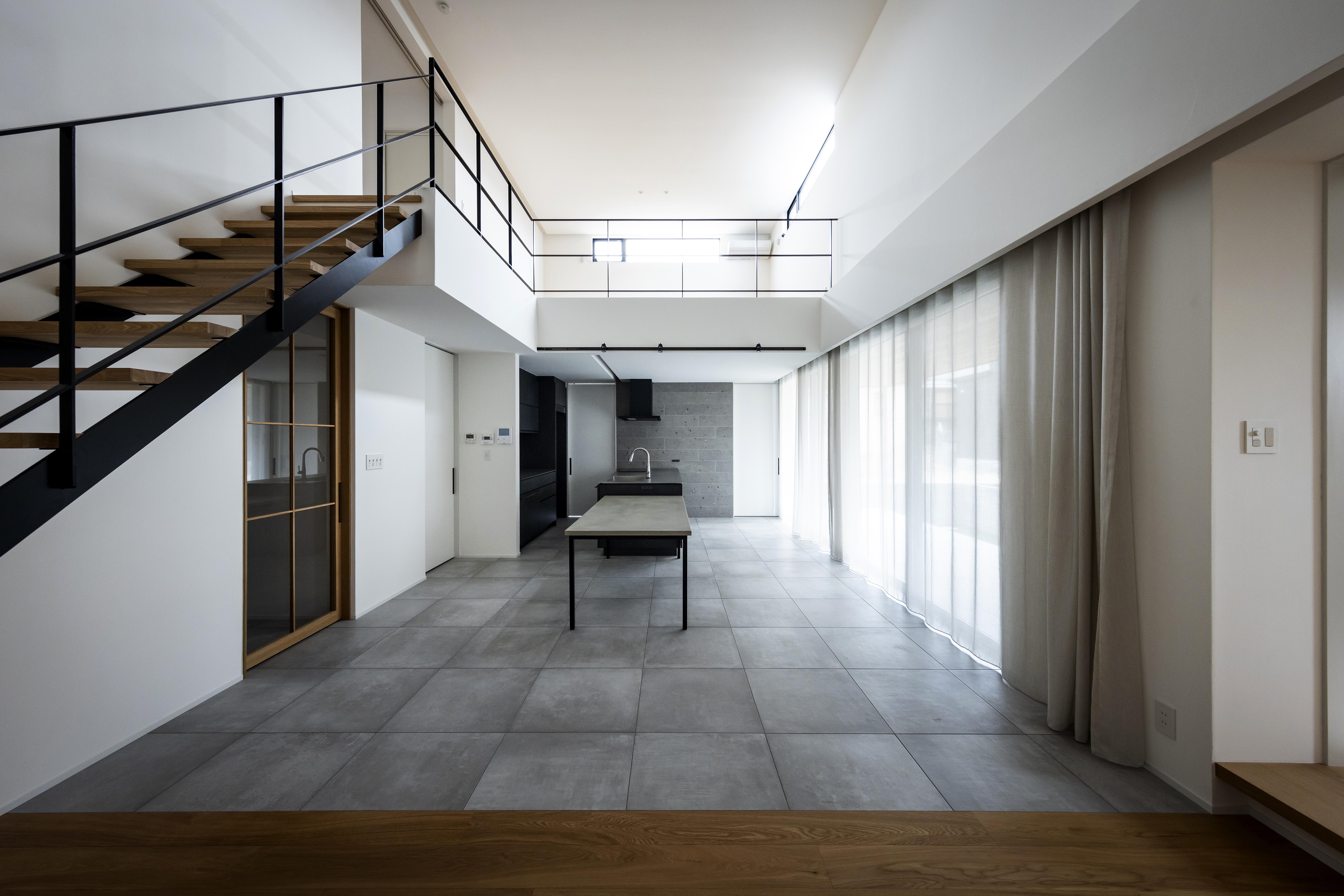 吹き抜けの大きな高窓から光が降り注ぐ家