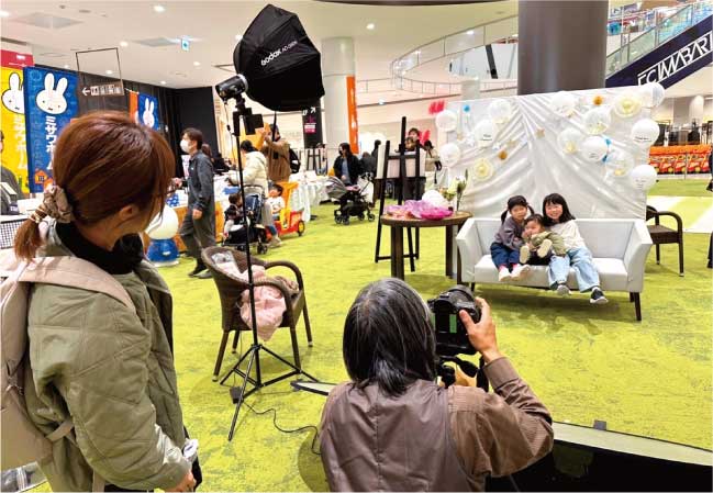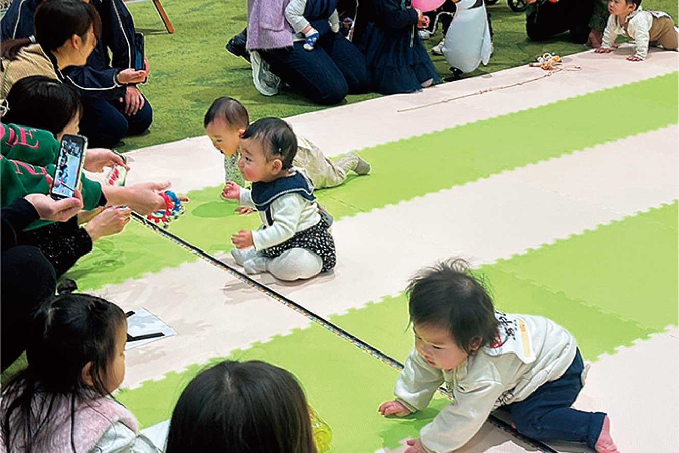 可愛いフォトブースで記念に写真撮影しよう!ハイハイレースで完走したお子さんの写真や家族写真など、どなたでも自由に撮影できます。