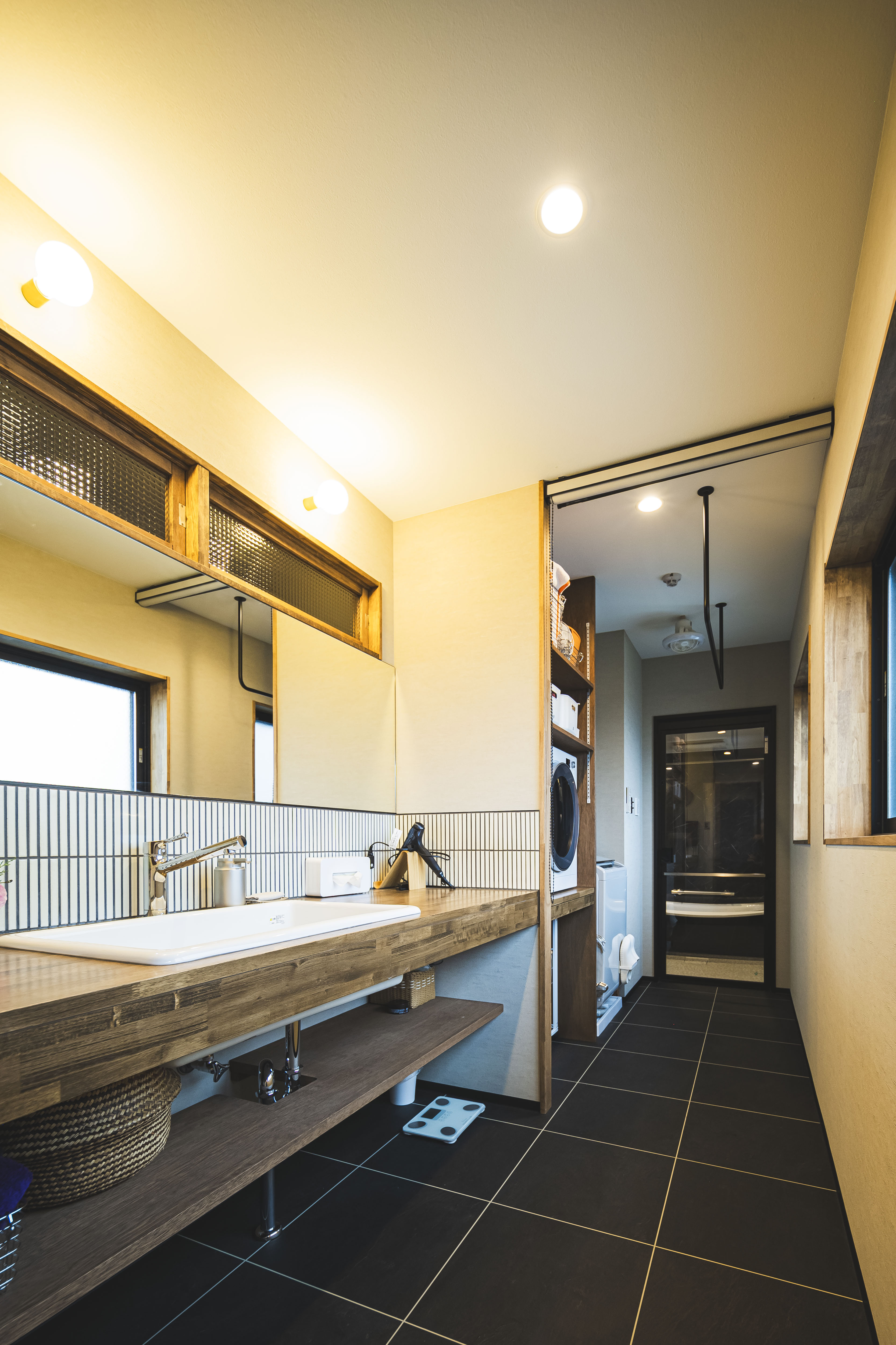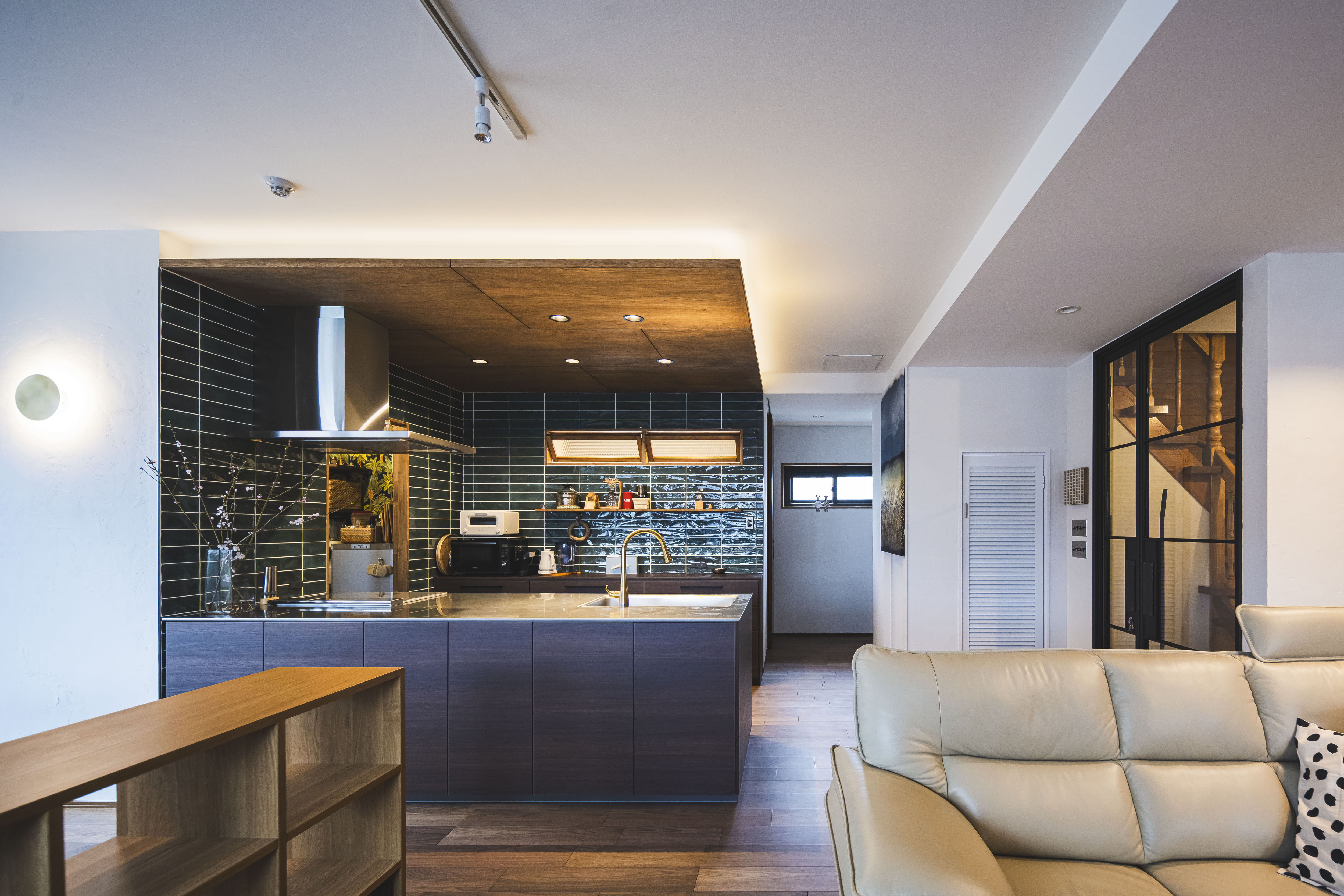 キッチンの通路幅を広げたことで二人 でもゆったり作業できるようになりまし た。木目の下がり天井&タイルでキッチ ンエリアは落ち着いた雰囲気に