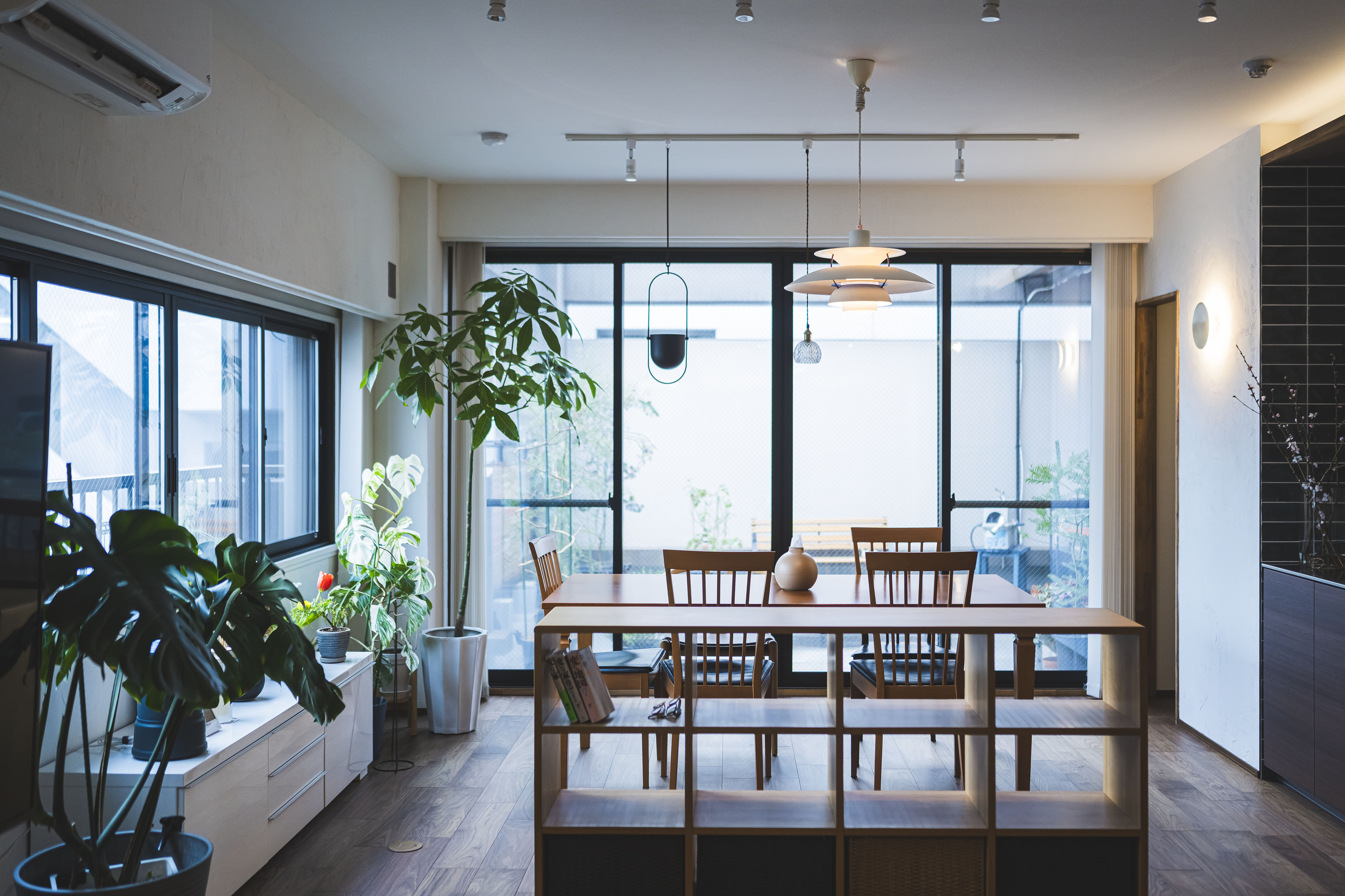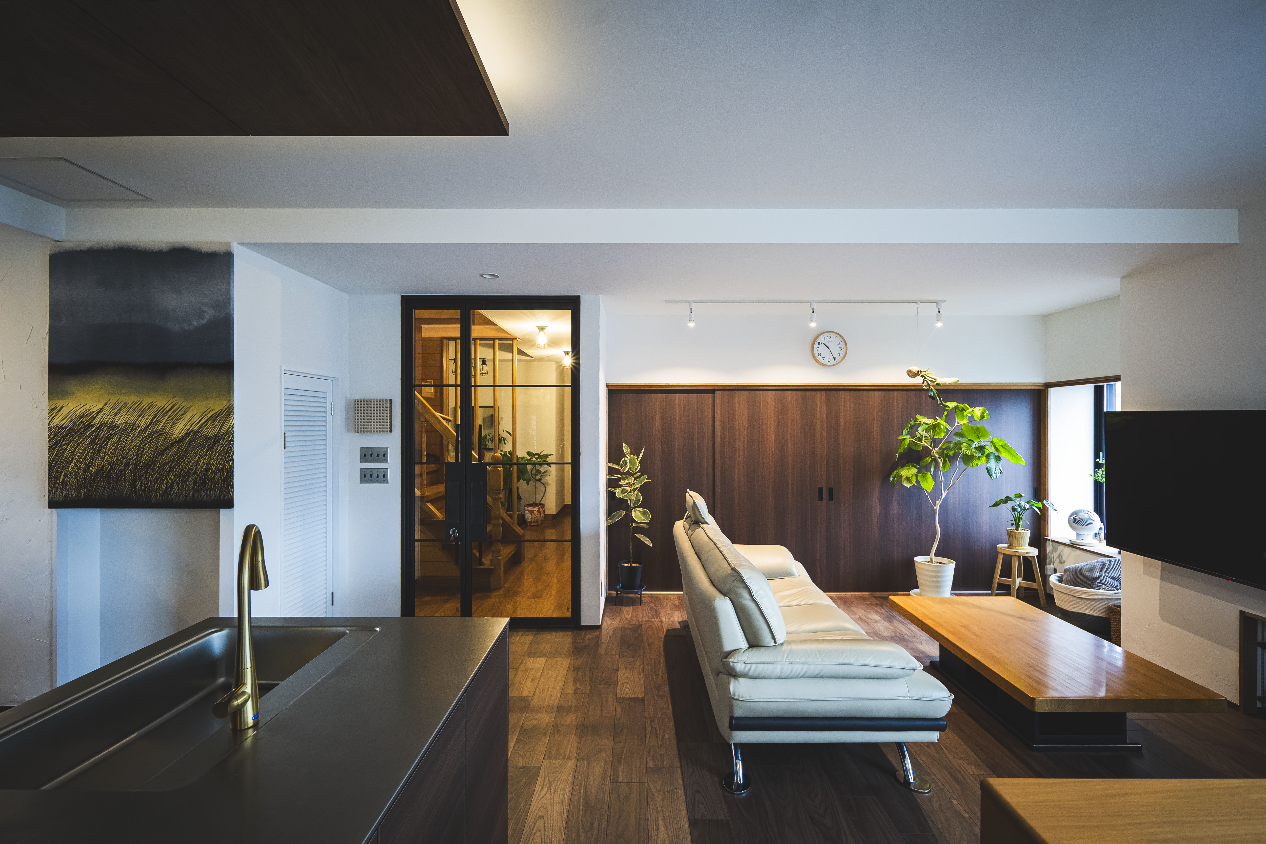 子どもたちの独立をきっかけに、それまでの一戸建てから、ご夫妻での暮らしにちょうどいい住まいを考え始めたHさま。受け継いだマンションの一室のリノベーションを選択されました。カタリナハウスとの出会いのきっかけはYouTube。そこで同社の施工事例を何邸もチェックし、雰囲気やデザインの好みが合うと感じたそう。数社検討しましたが、マンションリノベーションの経験が豊富で、唯一断熱改修を具体的に提案してくれたことが決め手となりました。元は和室を含む細かく区切られた間取り。そこで持て余していた和室をLDKに取り込み、ワンフロアの大空間に。キッチンはパントリーを経由して回遊できる動線を計画。ウォールナットのフローリングと漆喰の塗り壁に包まれた、落ち着きある大人の空間に生まれ変わりました。