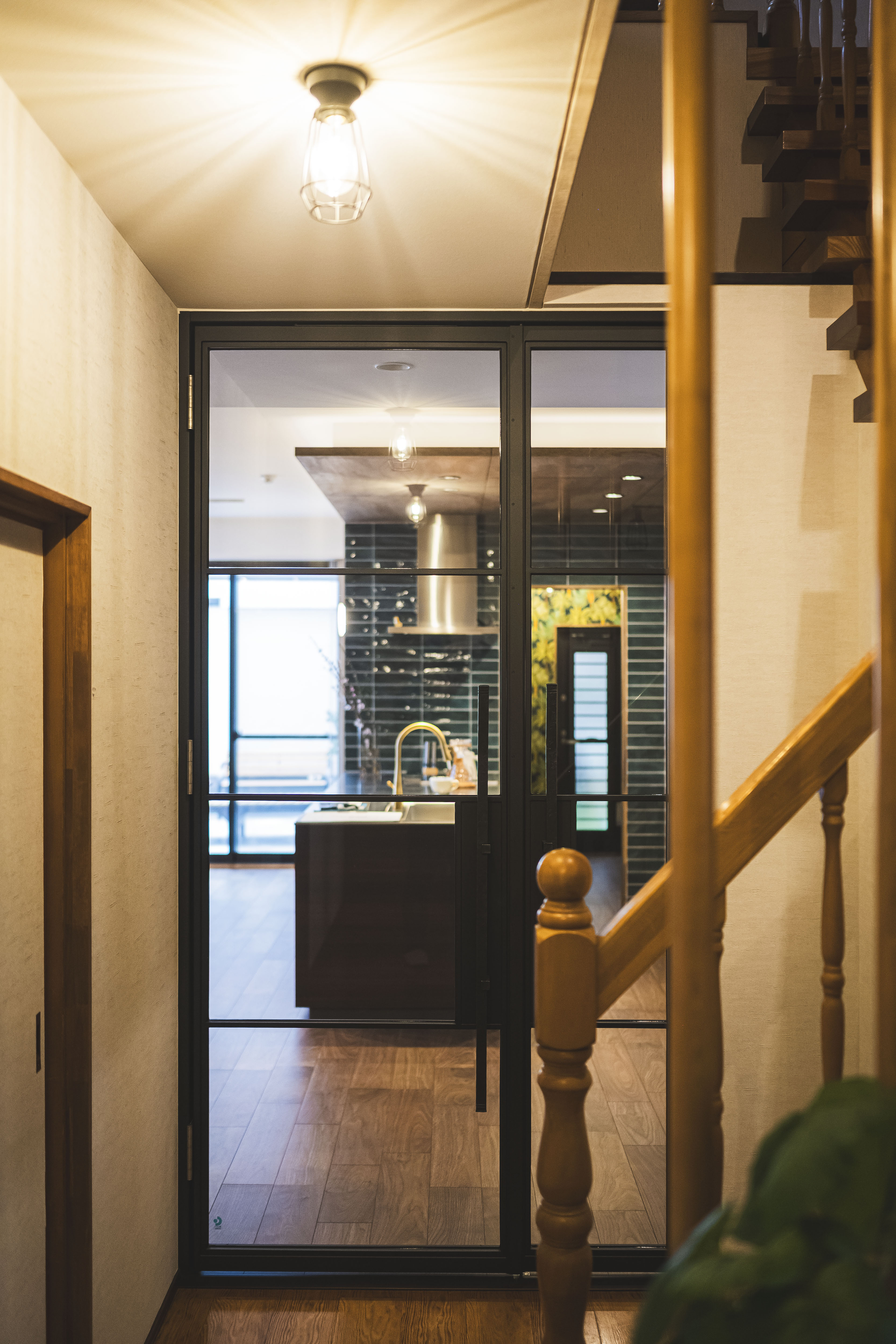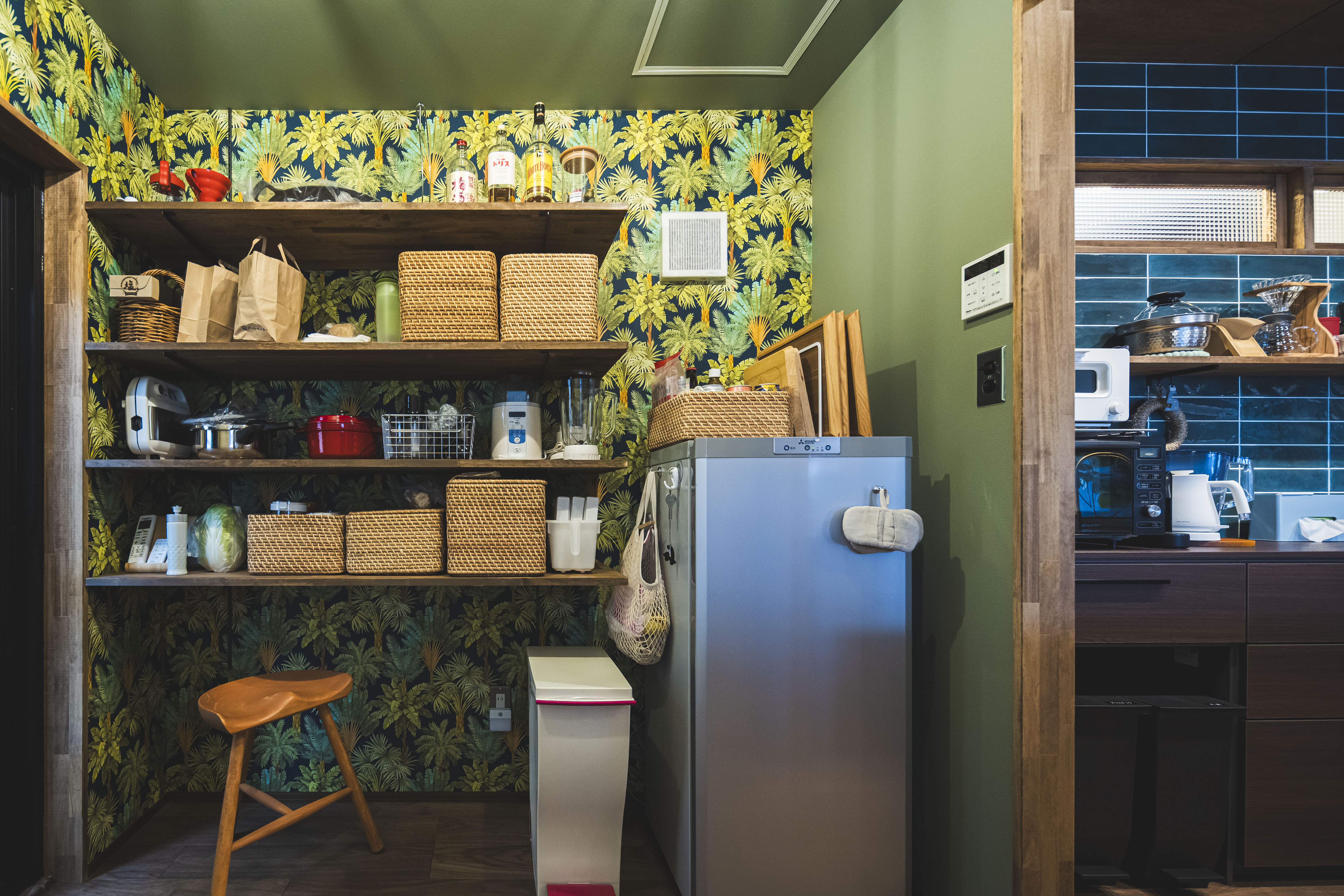 キッチンの通路幅を広げたことで二人 でもゆったり作業できるようになりまし た。木目の下がり天井&タイルでキッチ ンエリアは落ち着いた雰囲気に