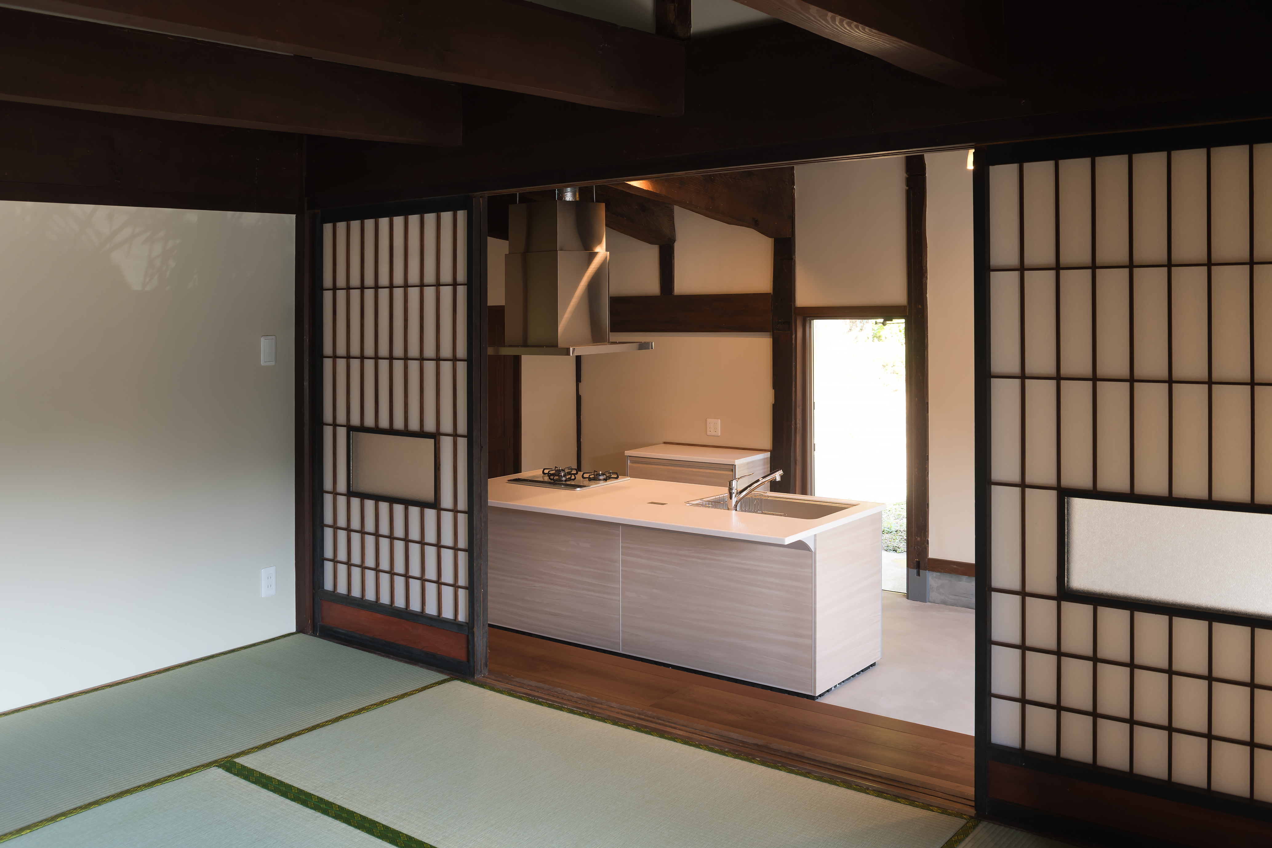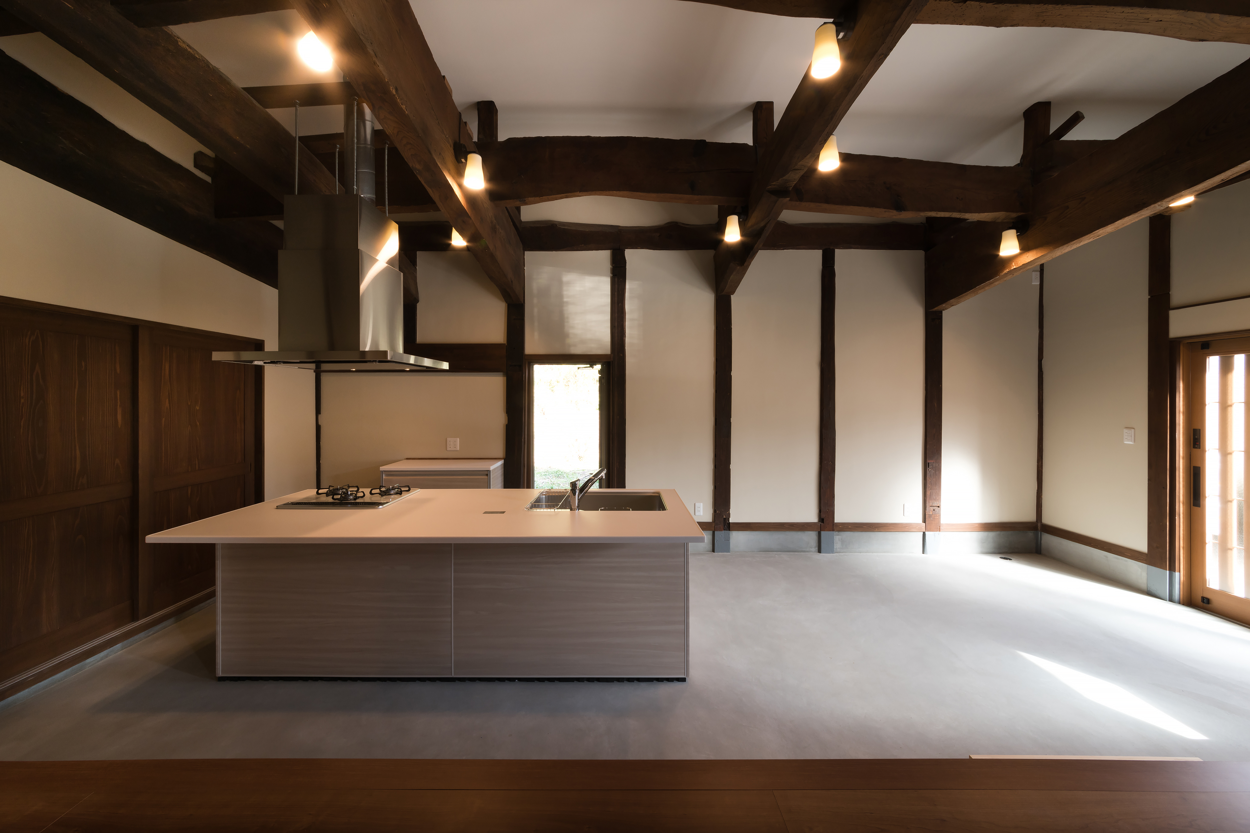 元は土間と板間のキッチンで 分かれていた空間。板間を下 げて土間を広げ、土間玄関と キッチンをつなげました。