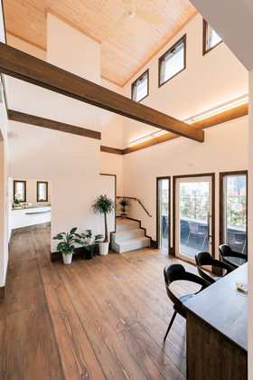 カバザクラの床や無垢材を使ったケーシングなど、素材へのこだわりと上質感があふれるLDK。天井高2.7mを標準としており、開放感も申し分ありません