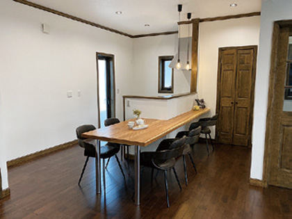 ダークブラウンを基調としたシックなダイニングキッチン。広いスペースをさらに有効活用すべく、空間に調和するテイストの食器棚を設置しました。背面収納として機能し毎日の料理や家事の負担が軽減され、満足のお施主様でした。